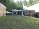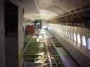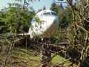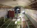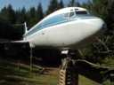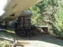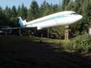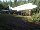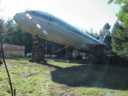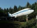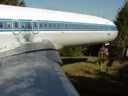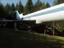 Stills. (Obsolete now. All the stacks of wooden blocks supporting the wing stubs and rear fuselage are gone, and the aircraft is now supported solely by its main landing gear, which, for the time being, rest on short 8 x 8 foot platforms built from railroad ties, and the nose gear, which rests on a thinner platform built mostly out of 8 x 4 foot hard foam insulation panels. The landing gear struts were inflated too, so the fuselage is now a bit higher off of the ground, and the air stairs are fully extended and clear the ground at the bottom by a few inches. Also, the full thrust reverser has been mounted on the center engine nacelle, and the three partial thrust reversers moved to a temporary storage location behind the aircraft. The aircraft and the site are now a great deal cleaner and nicer looking as a result of this progress. See the media and progress page for later media and commentary):