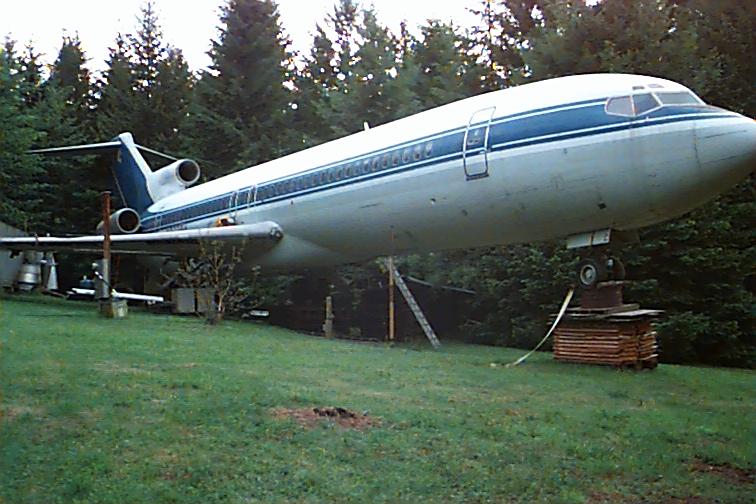 The aircraft looks more rough in these images than it does in reality, as best I can judge. Extensive pressure washing has caused a lot of paint removal, most of which comes off as chips, leaving surfaces looking like they're corroded in these images, even though in most cases they aren't. Paint loss is a necessary evil at this time. In fact, I'd prefer that all the overcoat paint (as opposed to the underlying corrosion preventative primer) come off when pressure washed, but that's not it's nature. When the more important things are completed, and I've moved in, I'll attend to beautification with a new coating of some sort - hopefully something much longer lasting than traditional paint. Maybe I can eventually get it to look like the Braniff 727 in the first image, which was obviously a new aircraft at the time the image was captured, right out of the paint shop (courtesy Boeing).