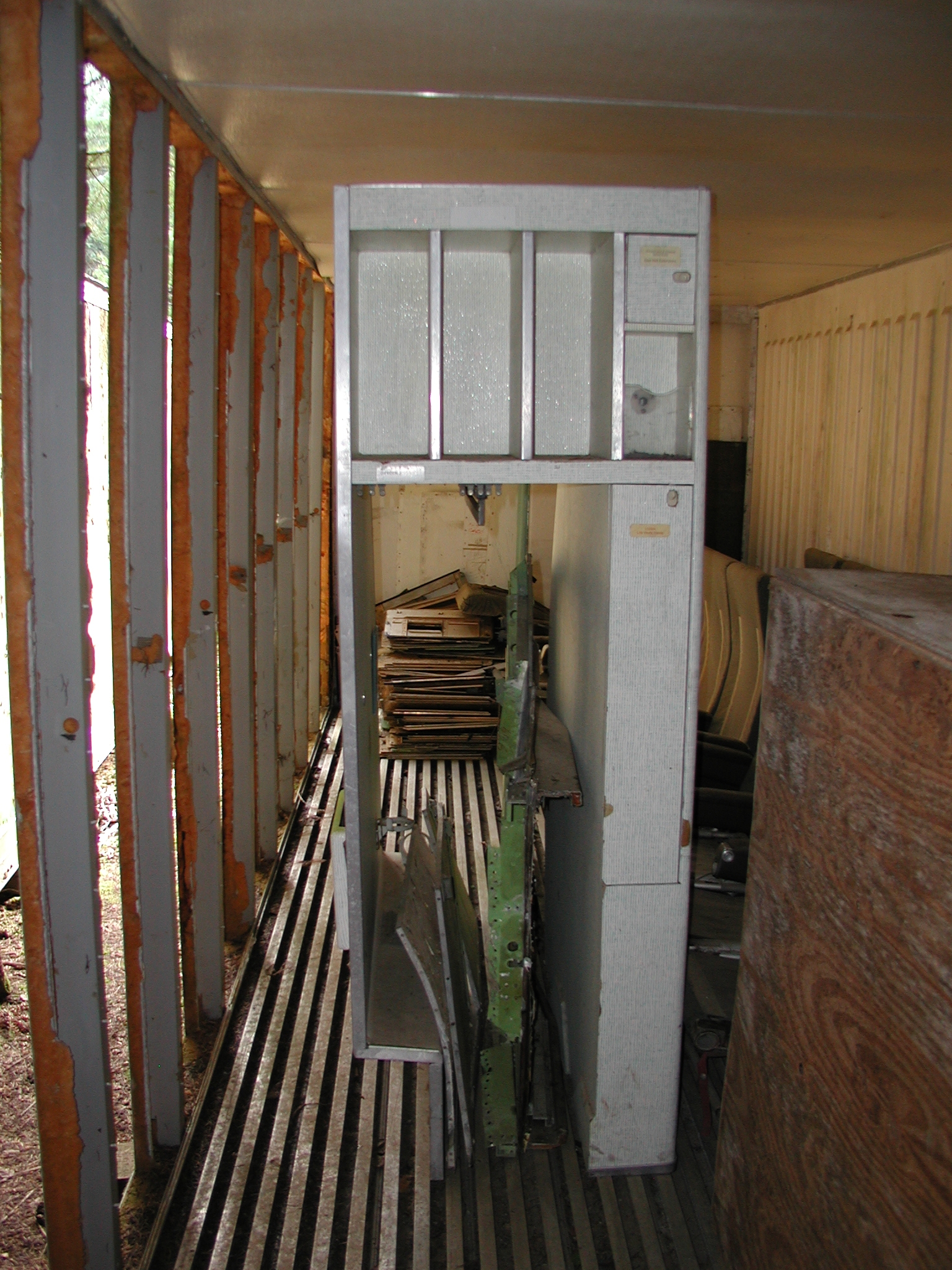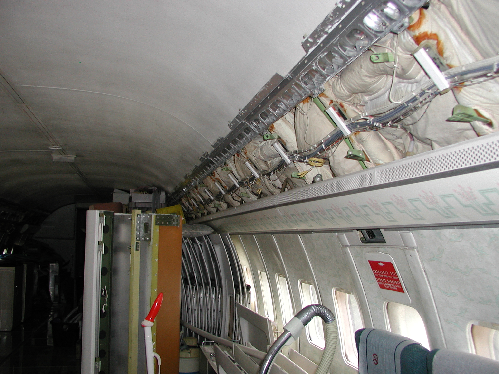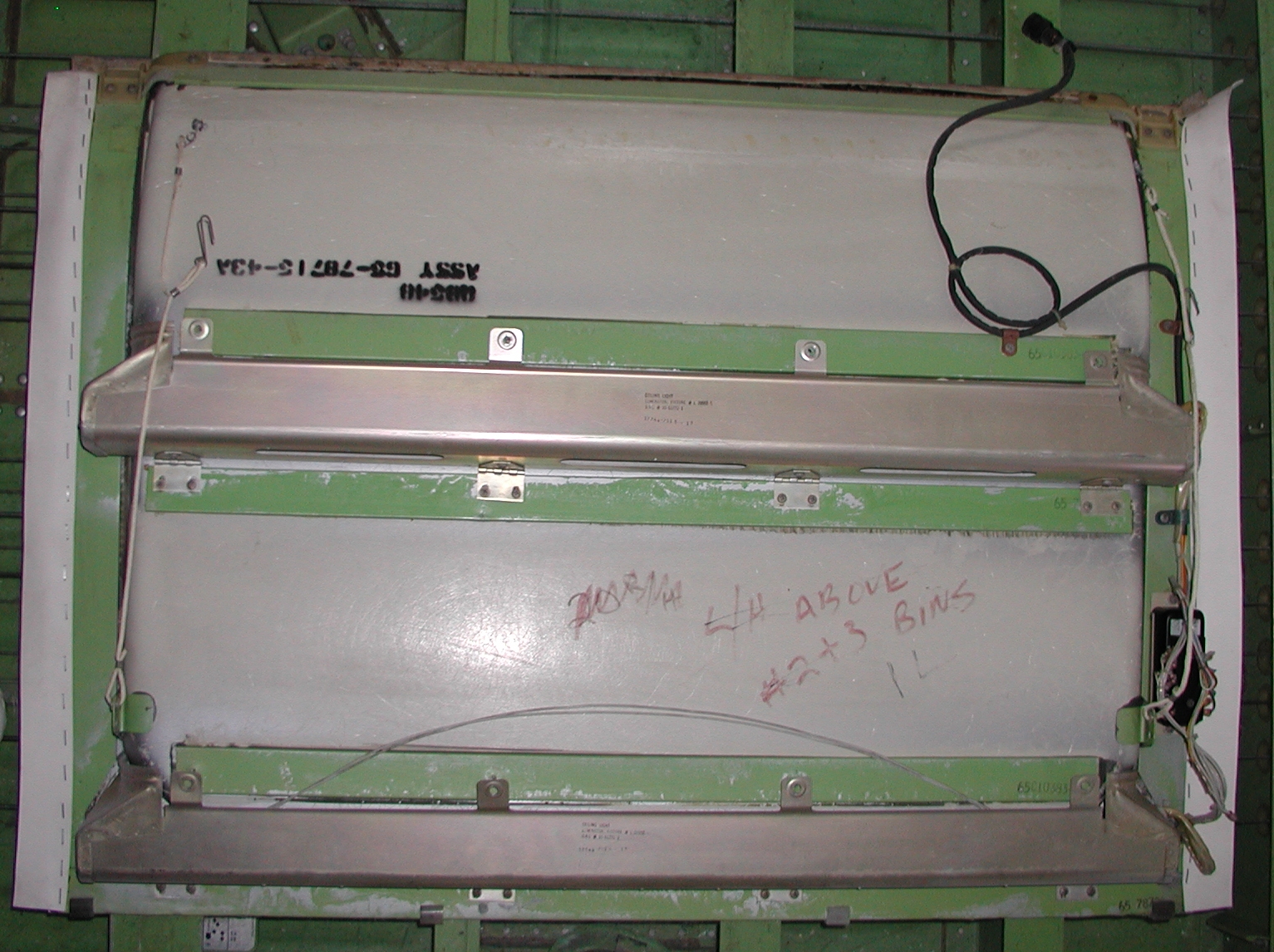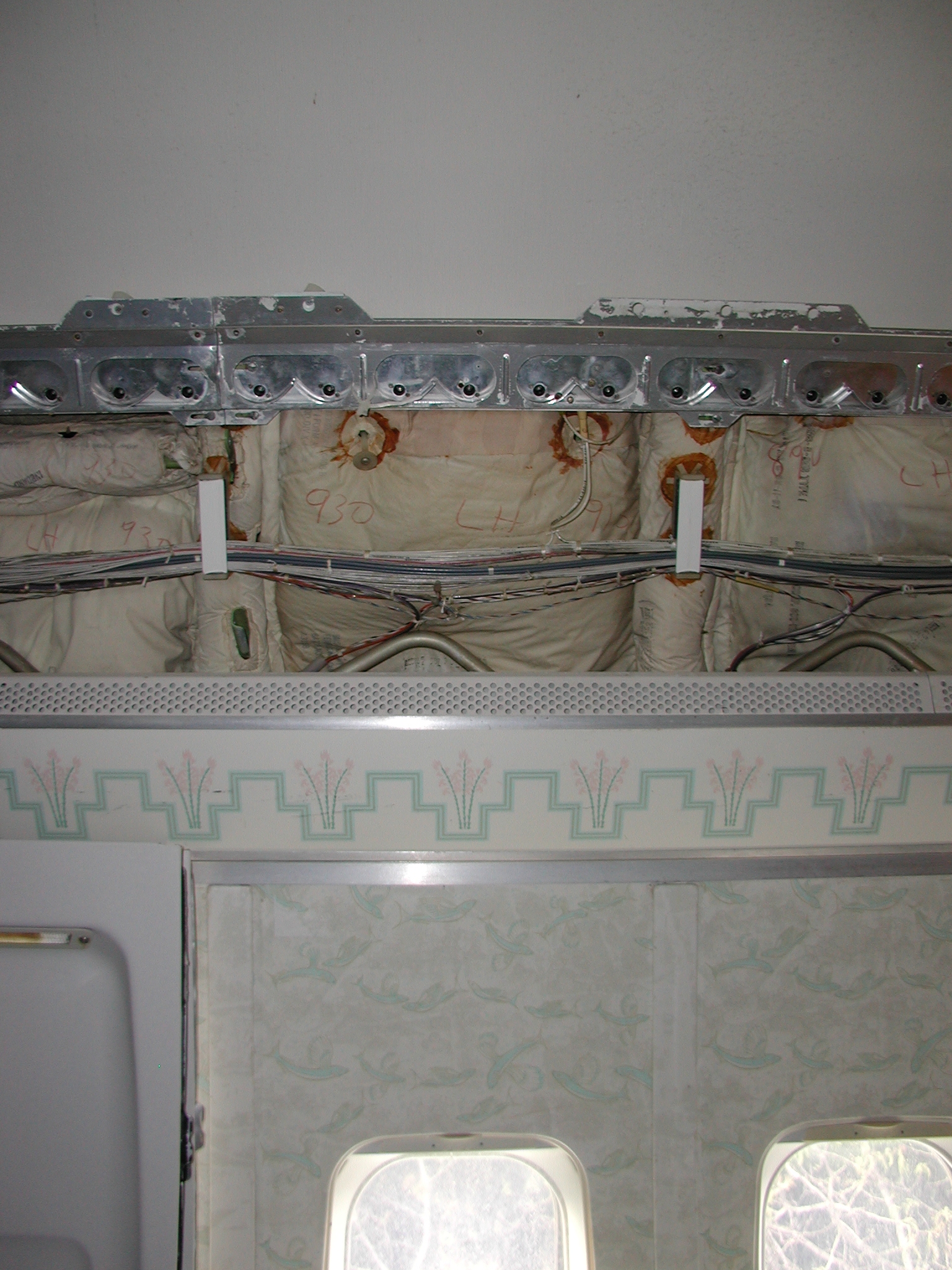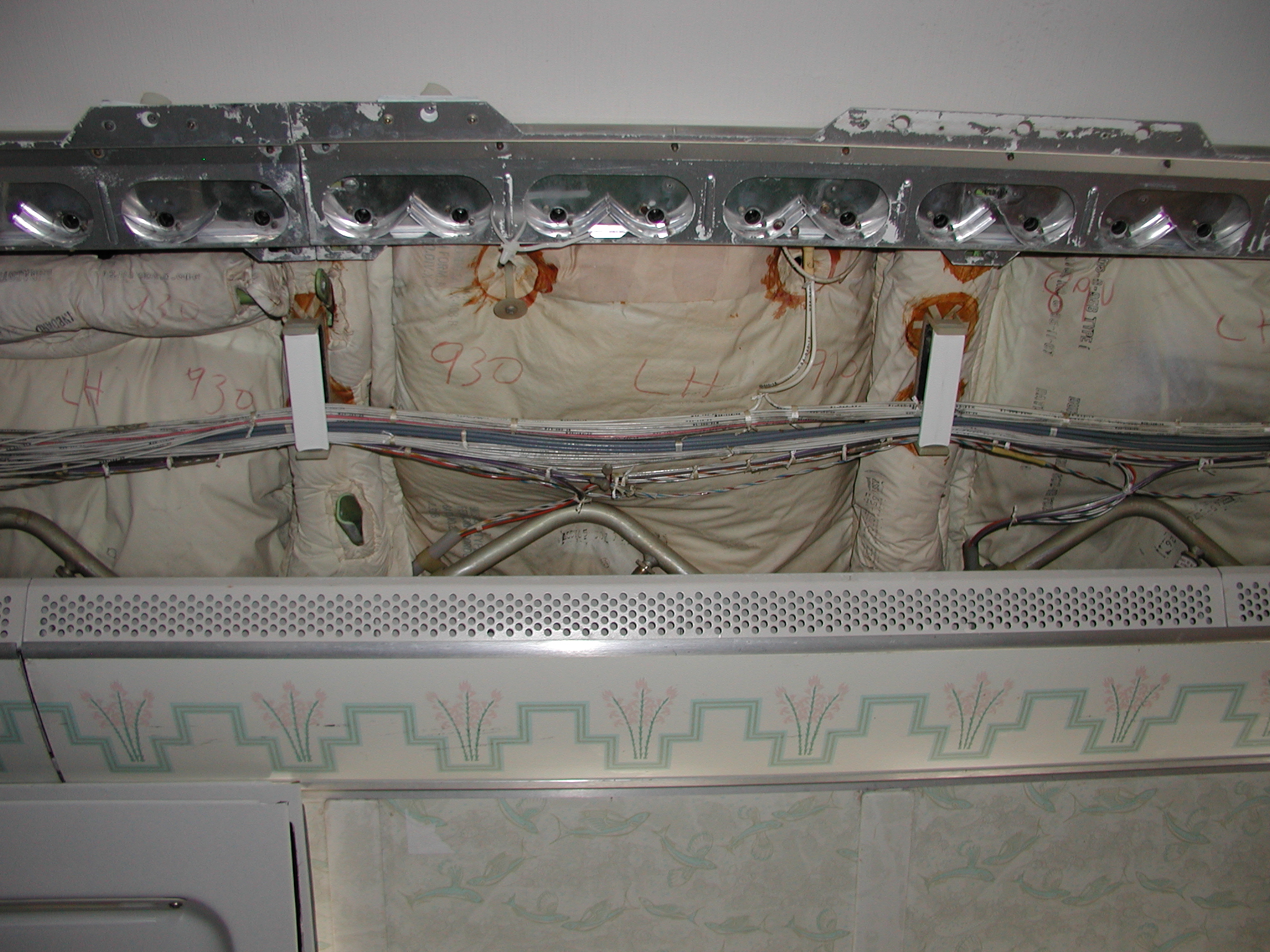 These images are provided to answer some recent questions, and to assist those who are interested in installation options associated with the original cabin window panels, especially regarding the space between the top of the window panels and the bottom of the ceiling panels. Regarding that, the hat rack back panel combined with the hat rack filled that space, and provided a reflective covering for the roughly 650 incandescent bayonet based bulbs housed in the indirect ceiling lighting fixture located at the bottom of the ceiling panels. However, the hat rack back panels depended upon the hat racks themselves to completely fill the space - without the hat racks, the exposed space (as shown in the last three images) is taller vertically than the hat rack back panel cover.
