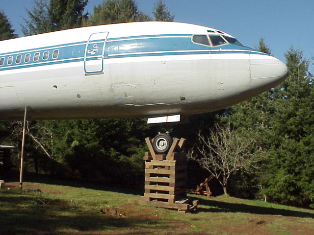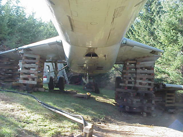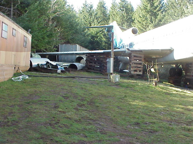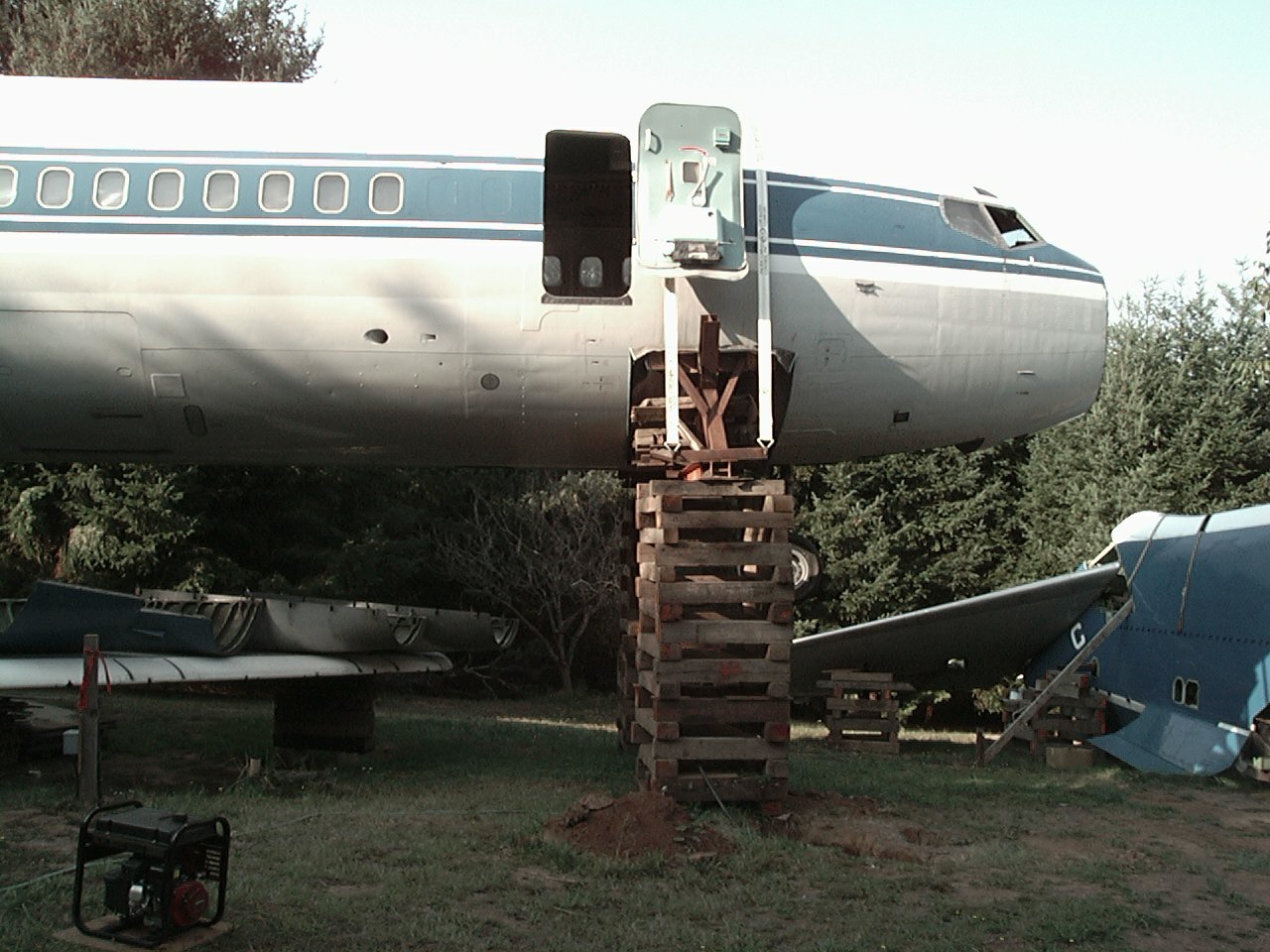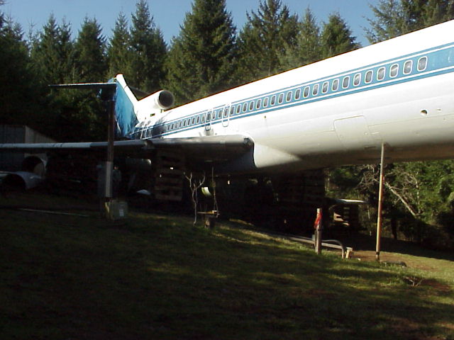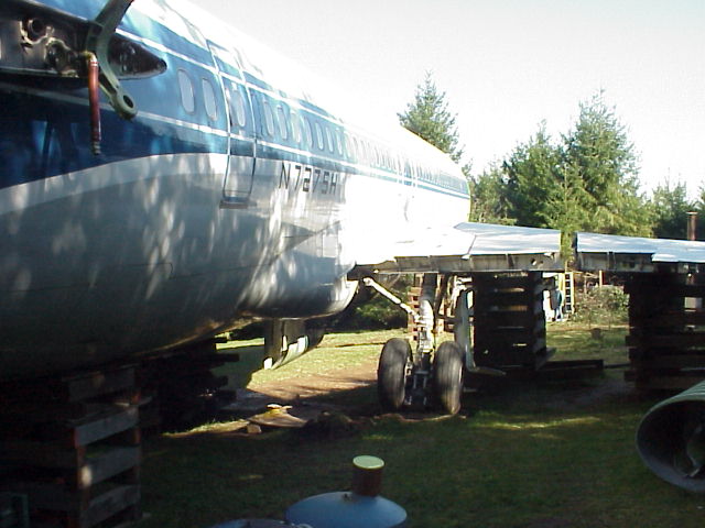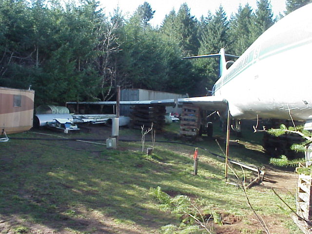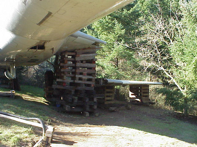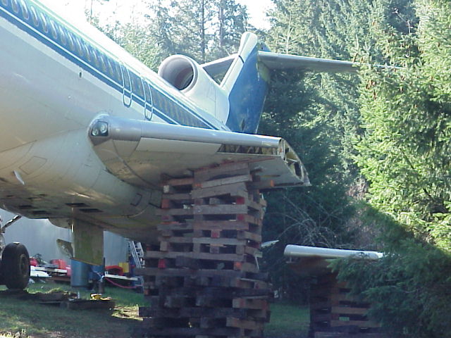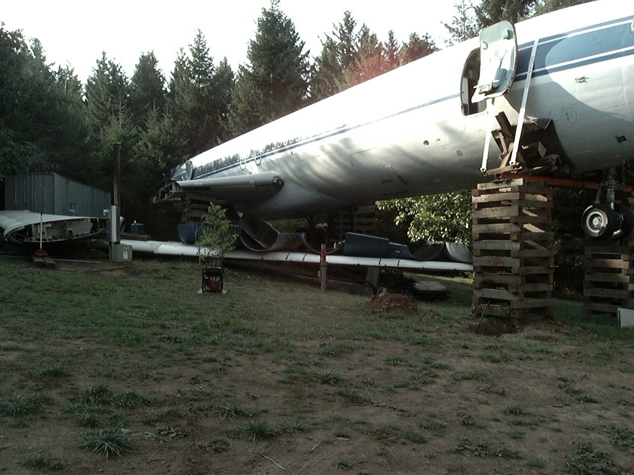 Stills. (Obsolete now. All the stacks of wooden blocks supporting the wing stubs and rear fuselage are gone, and the aircraft is now supported solely by its main landing gear, which, for the time being, rest on short 8 x 8 foot platforms built from railroad ties, and the nose gear, which rests on a thinner platform built mostly out of 8 x 4 foot hard foam insulation panels. The landing gear struts were inflated too, so the fuselage is now a bit higher off of the ground, and the air stairs are fully extended and clear the ground at the bottom by a few inches. Also, the full thrust reverser has been mounted on the center engine nacelle, and the three partial thrust reversers moved to a temporary storage location behind the aircraft. The aircraft and the site are now a great deal cleaner and nicer looking as a result of this progress. See the media and progress page for later media and commentary):