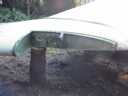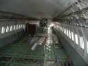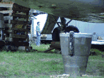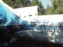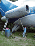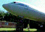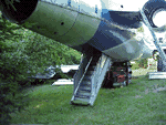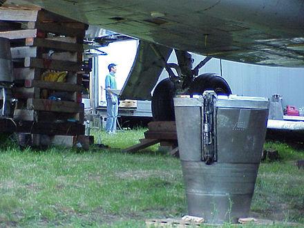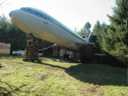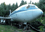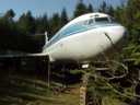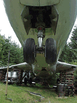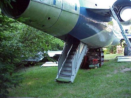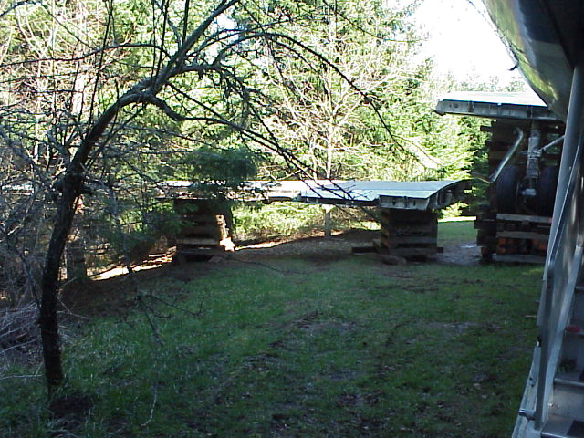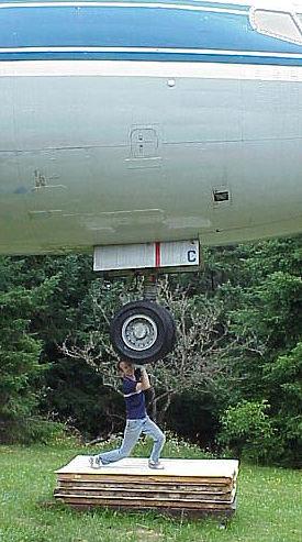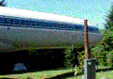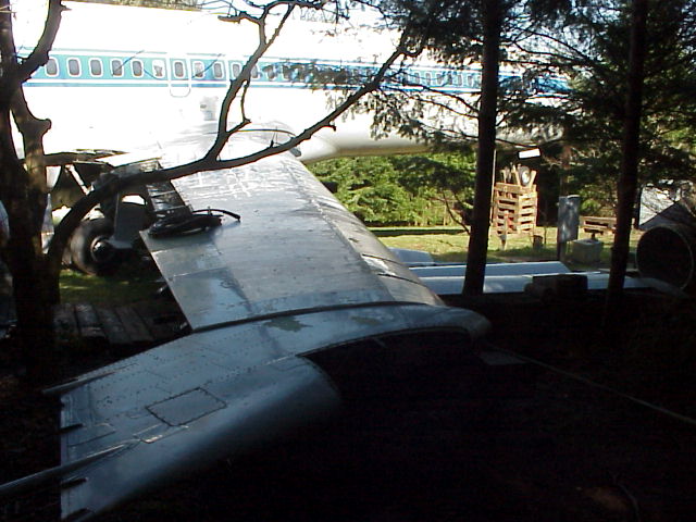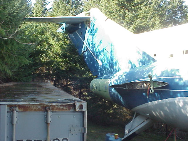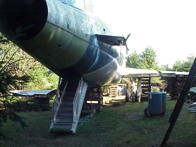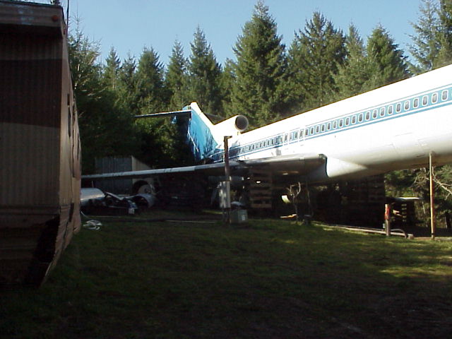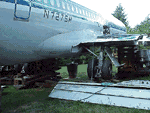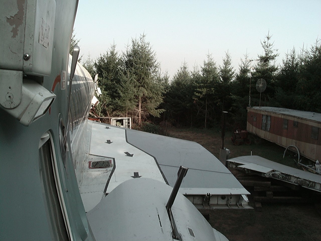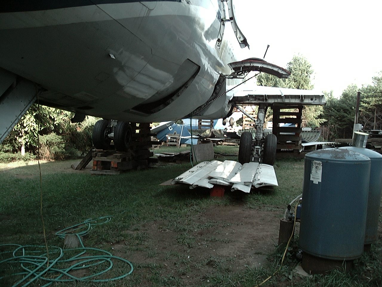 Stills. (Obsolete now. All the stacks of wooden blocks supporting the wing stubs and rear fuselage are gone, and the aircraft is now supported solely by its main landing gear, which, for the time being, rest on short 8 x 8 foot platforms built from railroad ties, and the nose gear, which rests on a thinner platform built mostly out of 8 x 4 foot hard foam insulation panels. The landing gear struts were inflated too, so the fuselage is now a bit higher off of the ground, and the air stairs are fully extended and clear the ground at the bottom by a few inches. Also, the full thrust reverser has been mounted on the center engine nacelle, and the three partial thrust reversers moved to a temporary storage location behind the aircraft. The aircraft and the site are now a great deal cleaner and nicer looking as a result of this progress. See the media and progress page for later media and commentary):