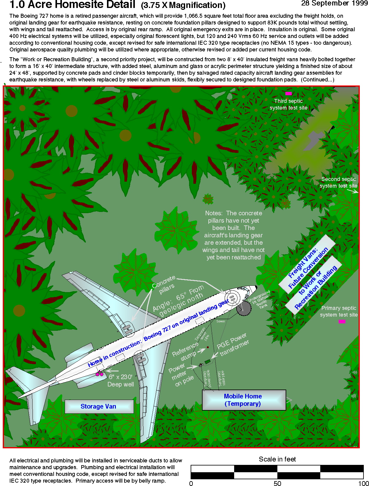 Note: The wings are illustrated as reattached in the following drawings, but that hasn't been accomplished yet. However, the wings are now essentially in the illustrated position, except that the Left wing is about two meters lower vertically than the Left wing root for easier reassembly of the flight control surfaces. The detail illustration includes a note, now obsolete, stating that the tail has not yet been reattached. Ignore that note - the tail has been reattached to the aircraft.