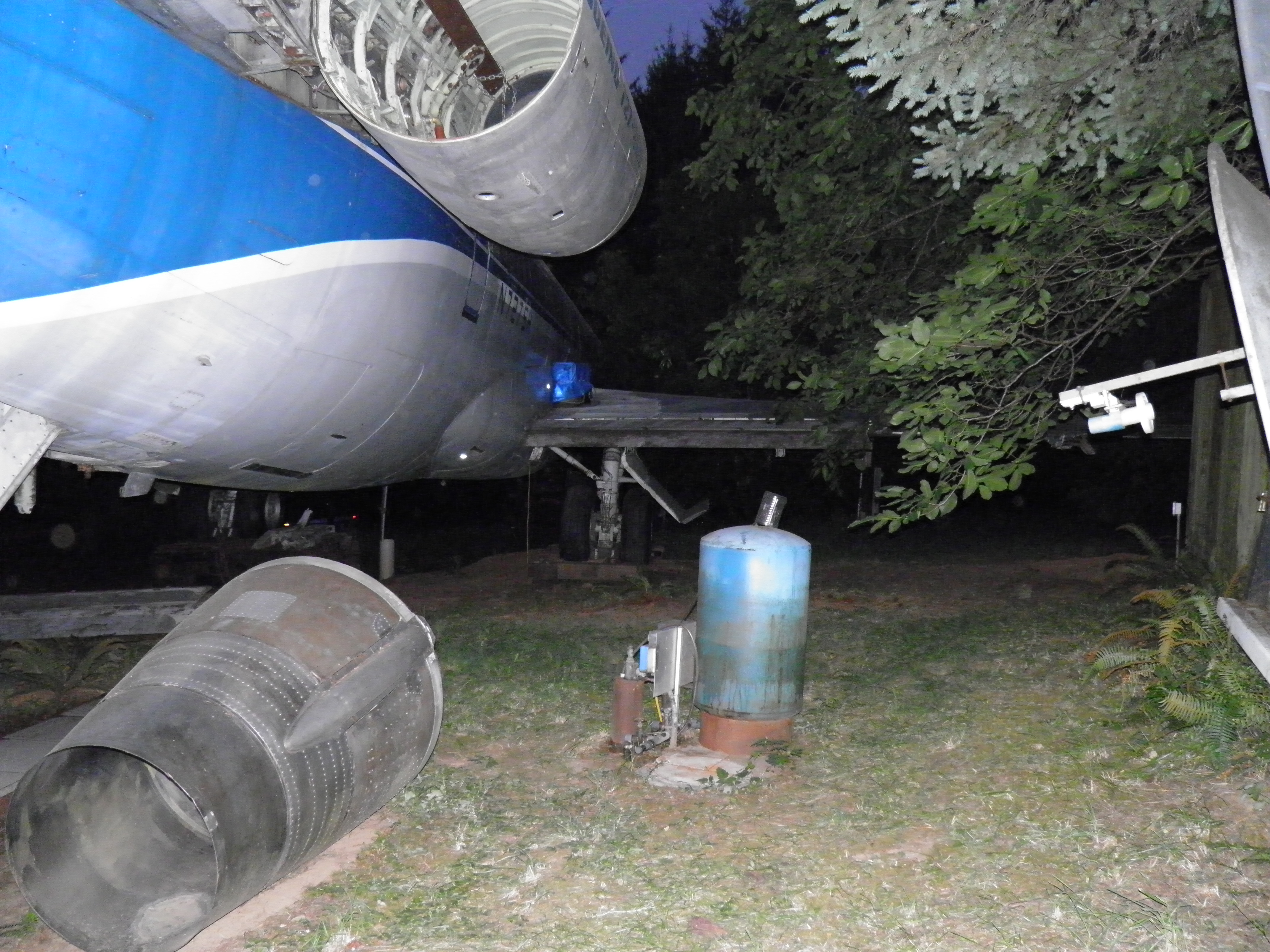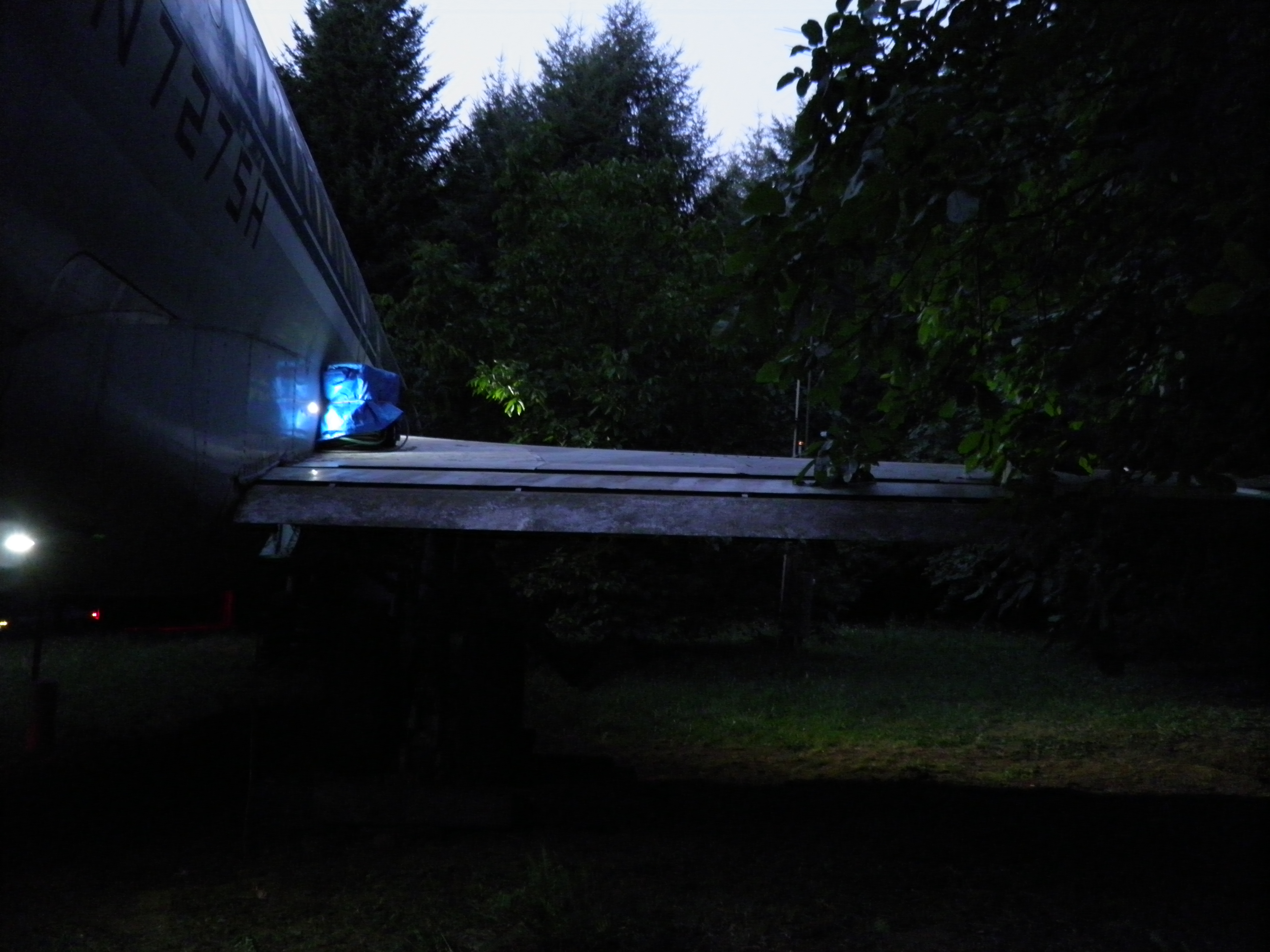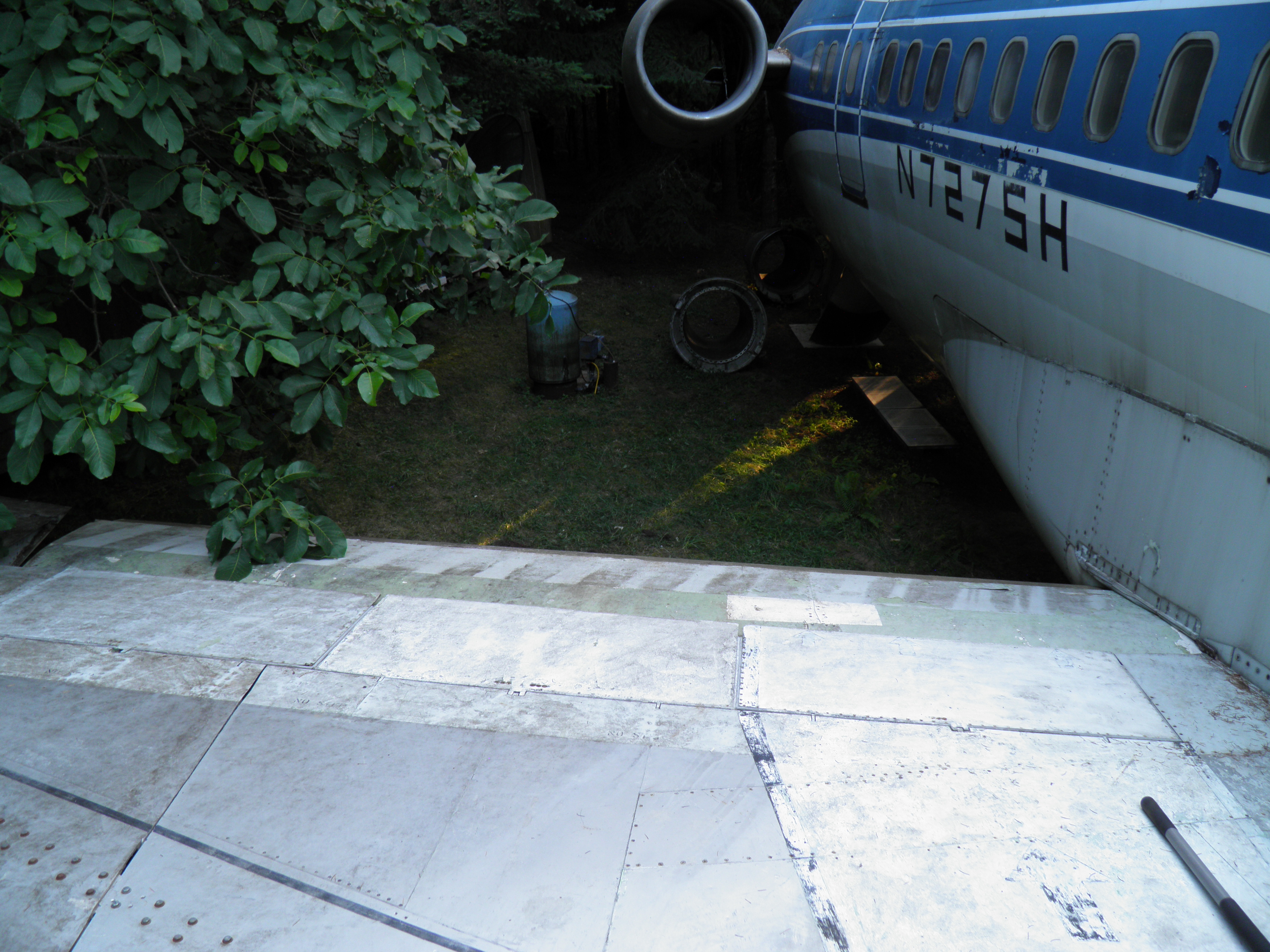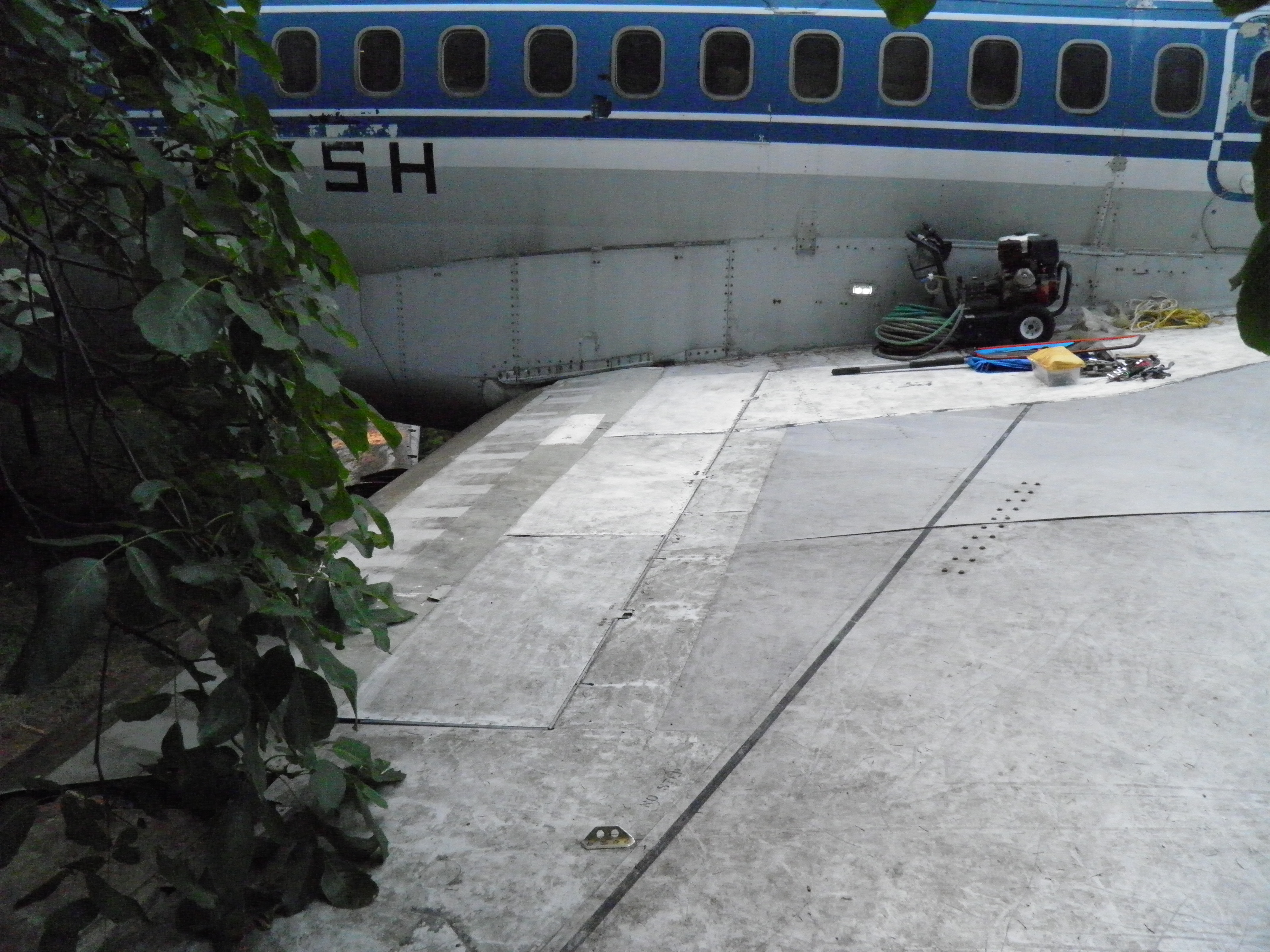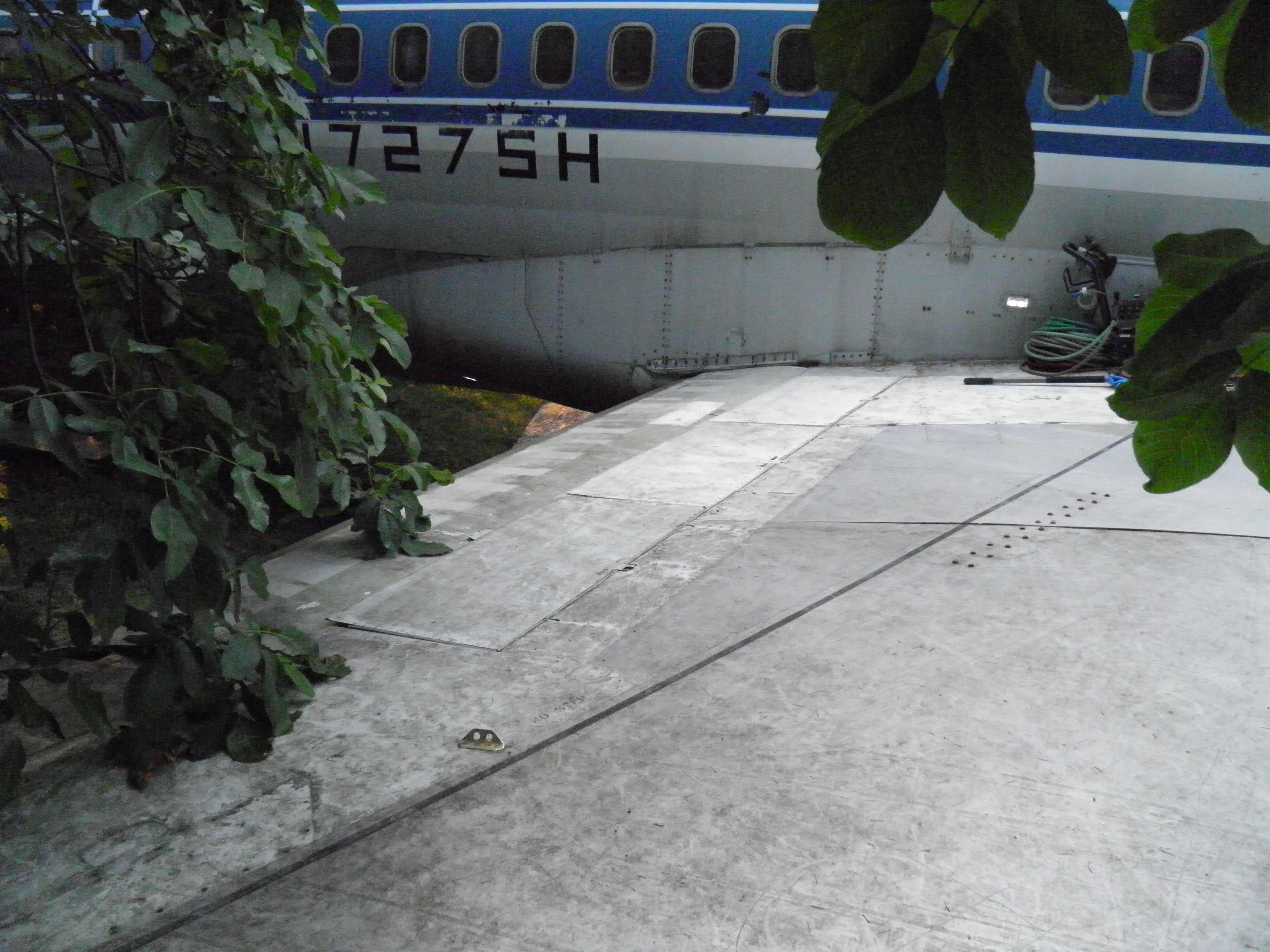 Exterior work included fabrication of a simple structure rendered from surplus computer room floor tiles which provides stair like access to the top of the right wing tip. The same tiles were also used to fabricate a simple porch over the turf the air stairs rest upon when extended, plus an elongated landing surface for the aft drain mast which disperses the gray water which exits that mast so no soil erosion occurs. In addition to functional benefits, these simple improvements significantly enhanced the visual appeal of the grounds.