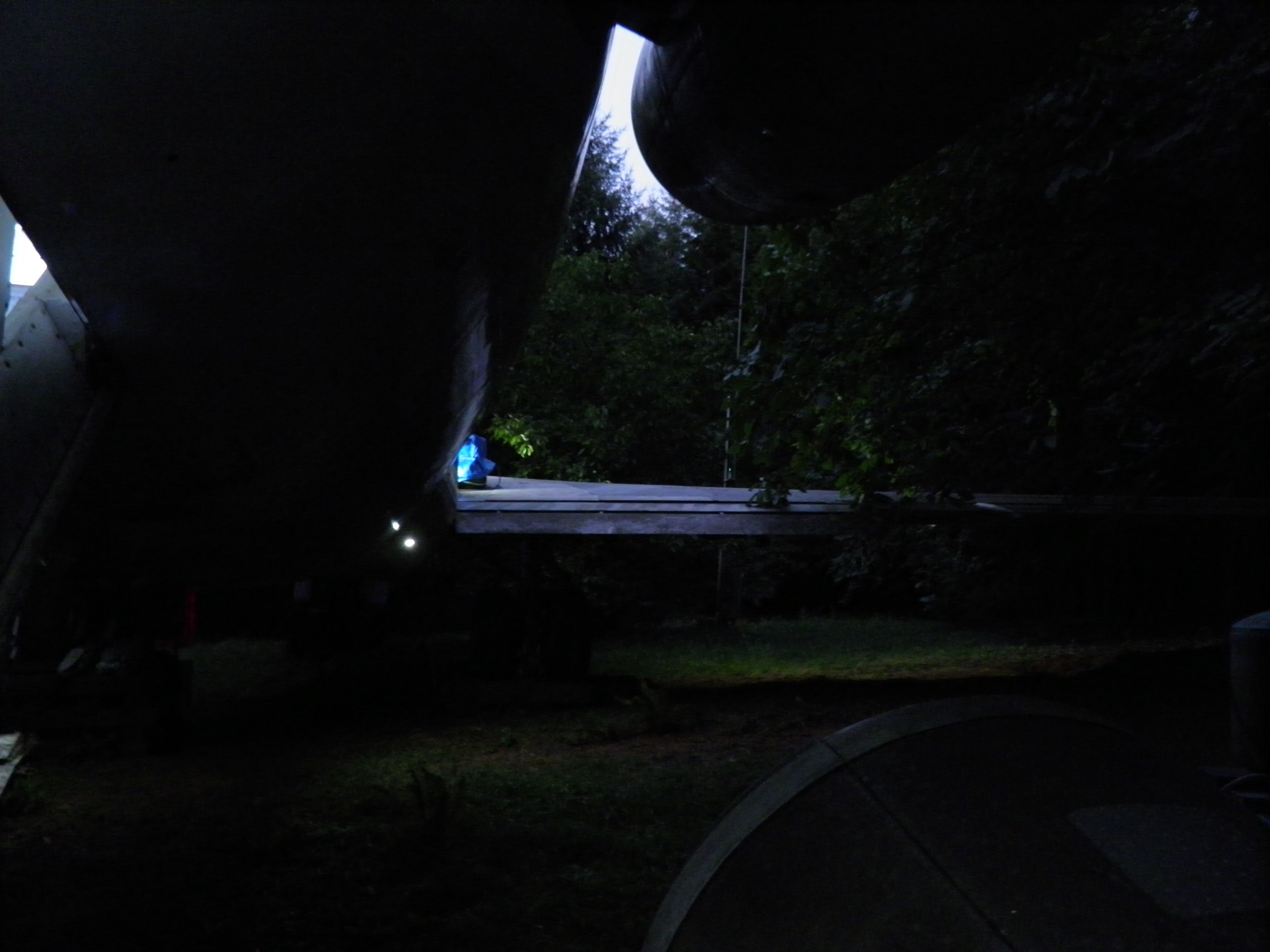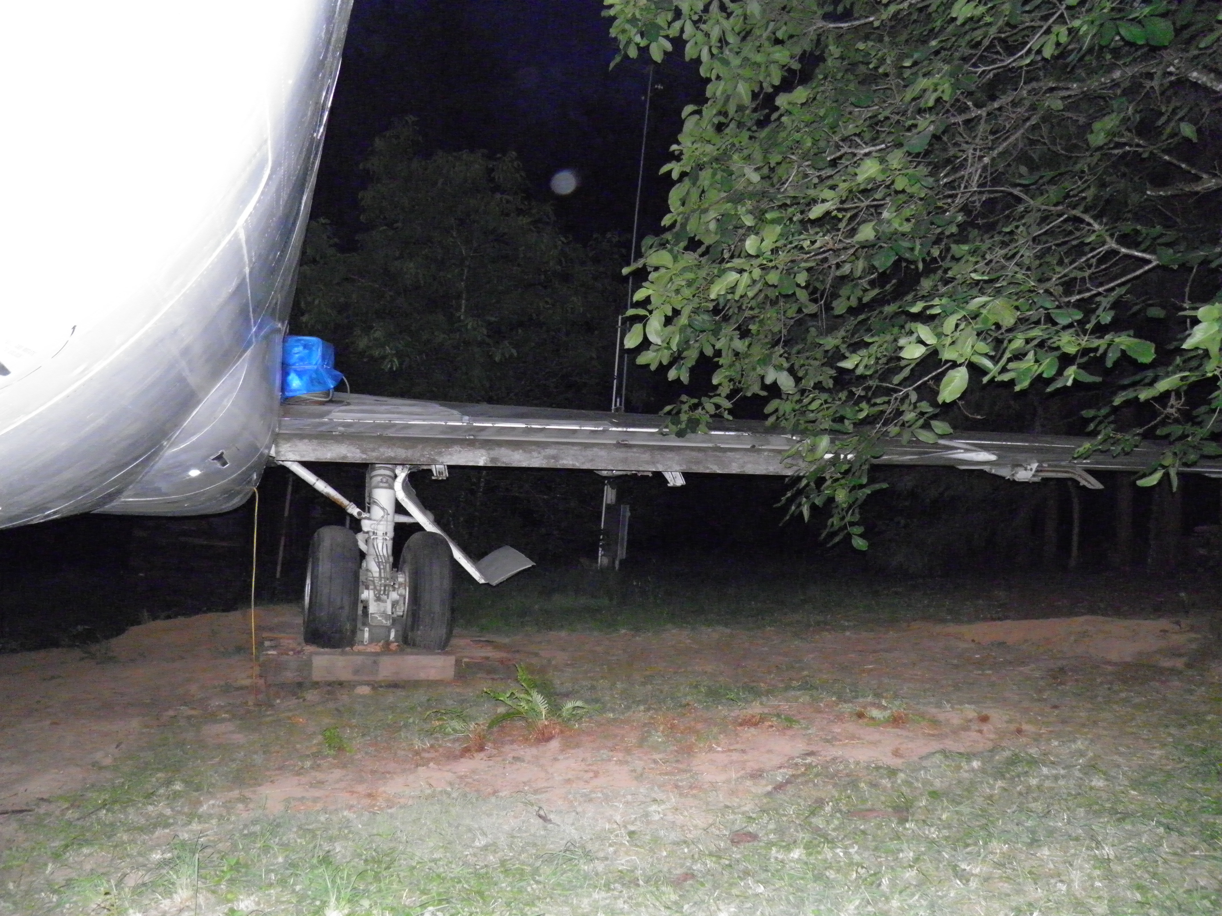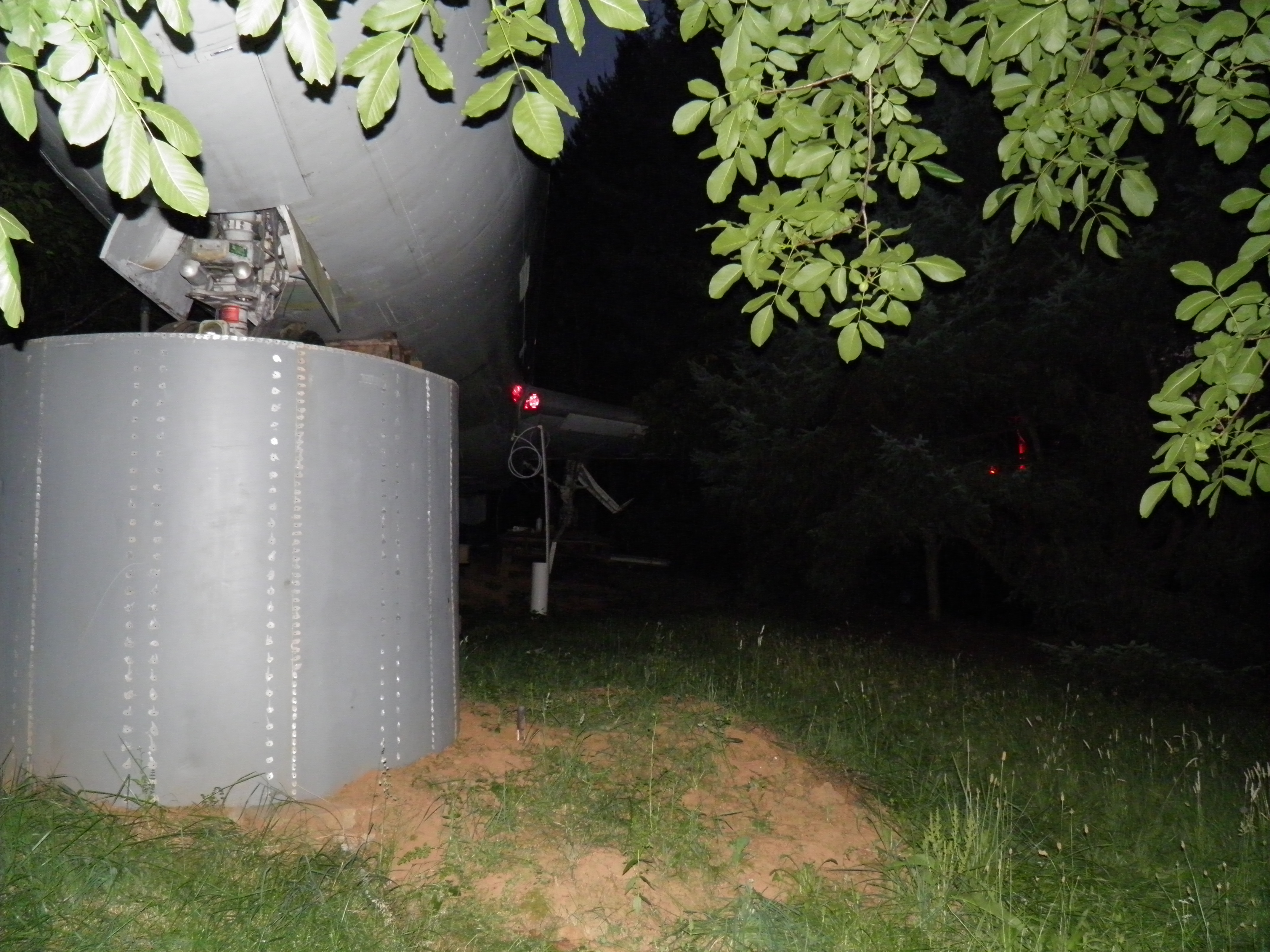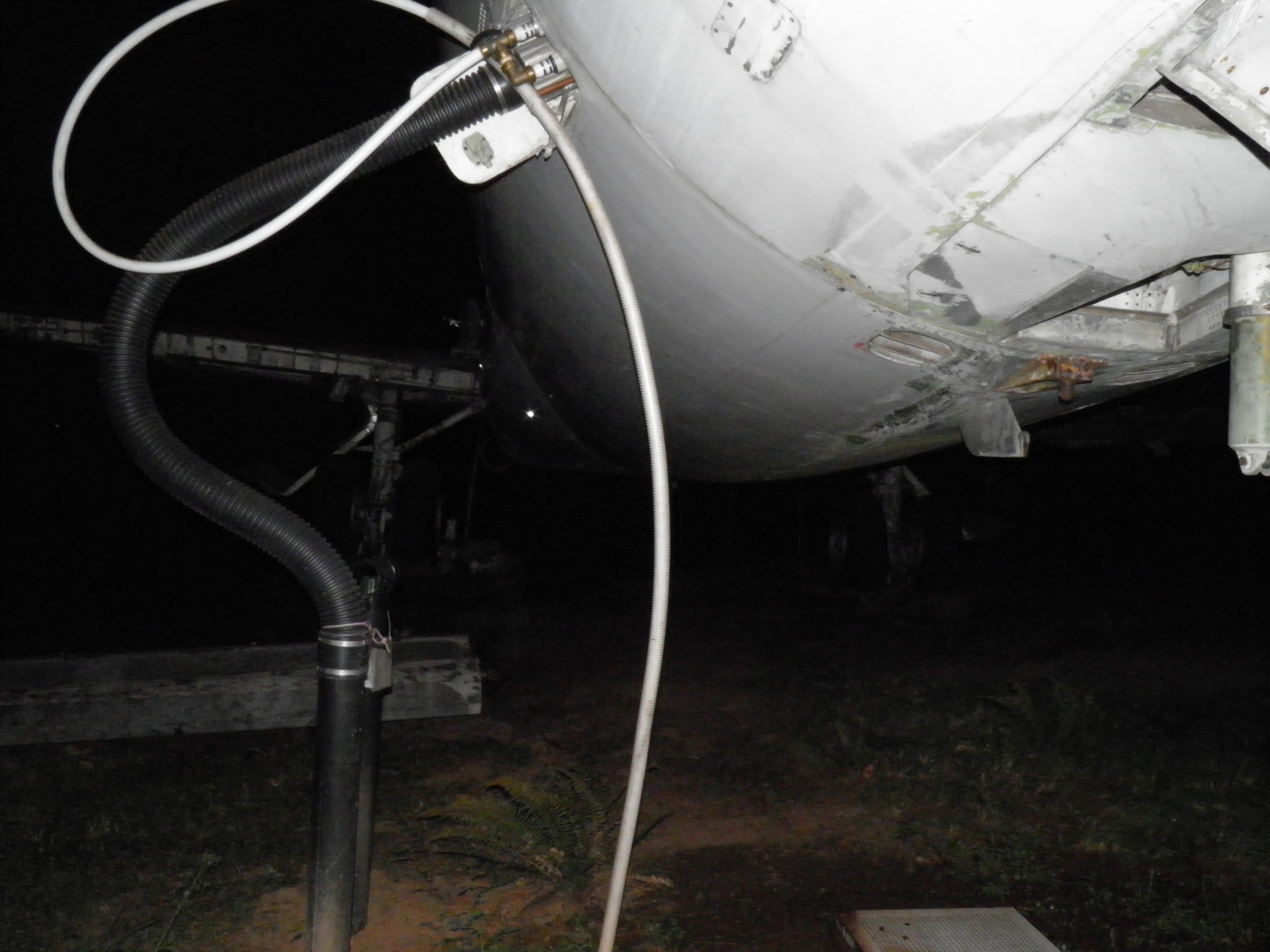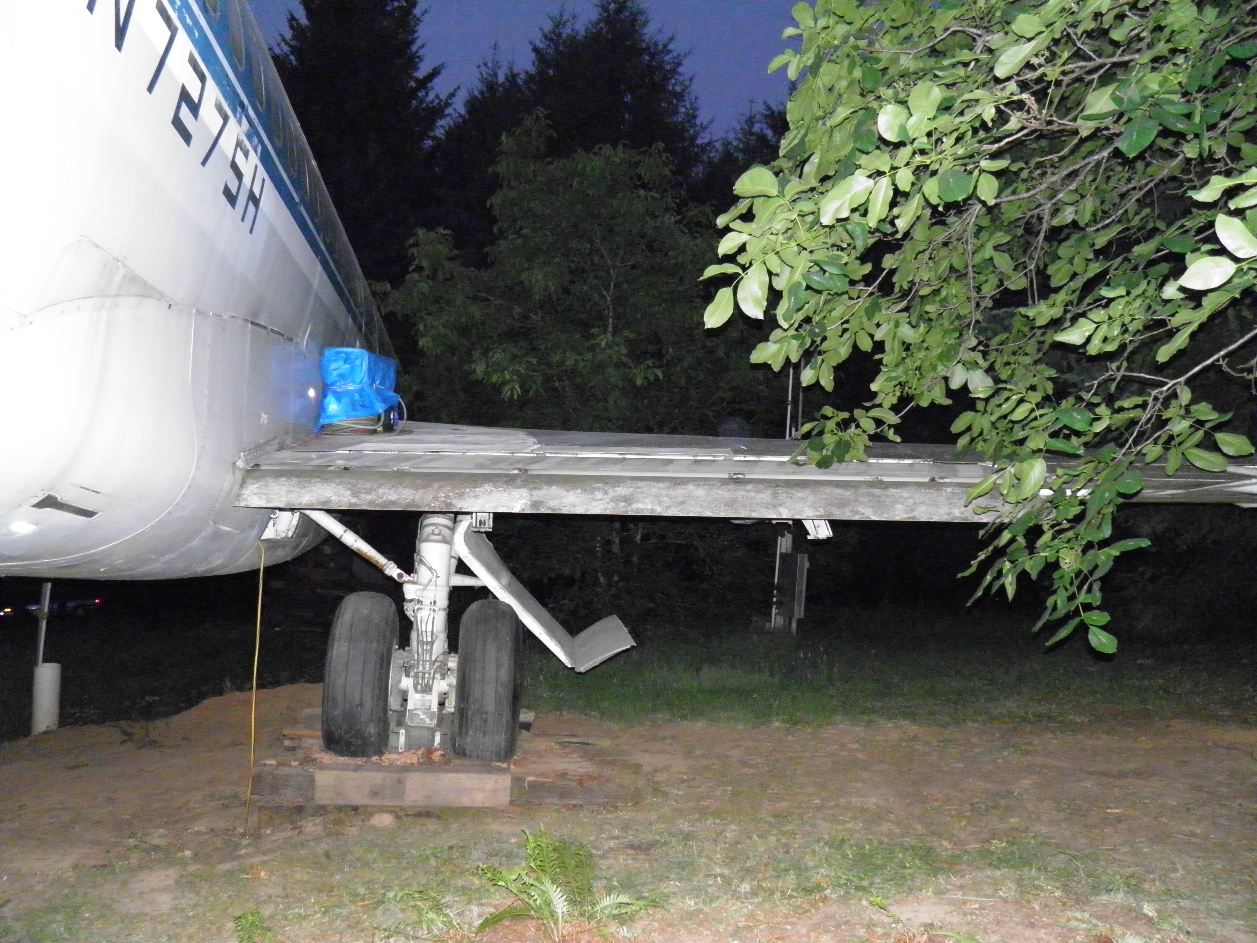 Exterior work included fabrication of a simple structure rendered from surplus computer room floor tiles which provides stair like access to the top of the right wing tip. The same tiles were also used to fabricate a simple porch over the turf the air stairs rest upon when extended, plus an elongated landing surface for the aft drain mast which disperses the gray water which exits that mast so no soil erosion occurs. In addition to functional benefits, these simple improvements significantly enhanced the visual appeal of the grounds.