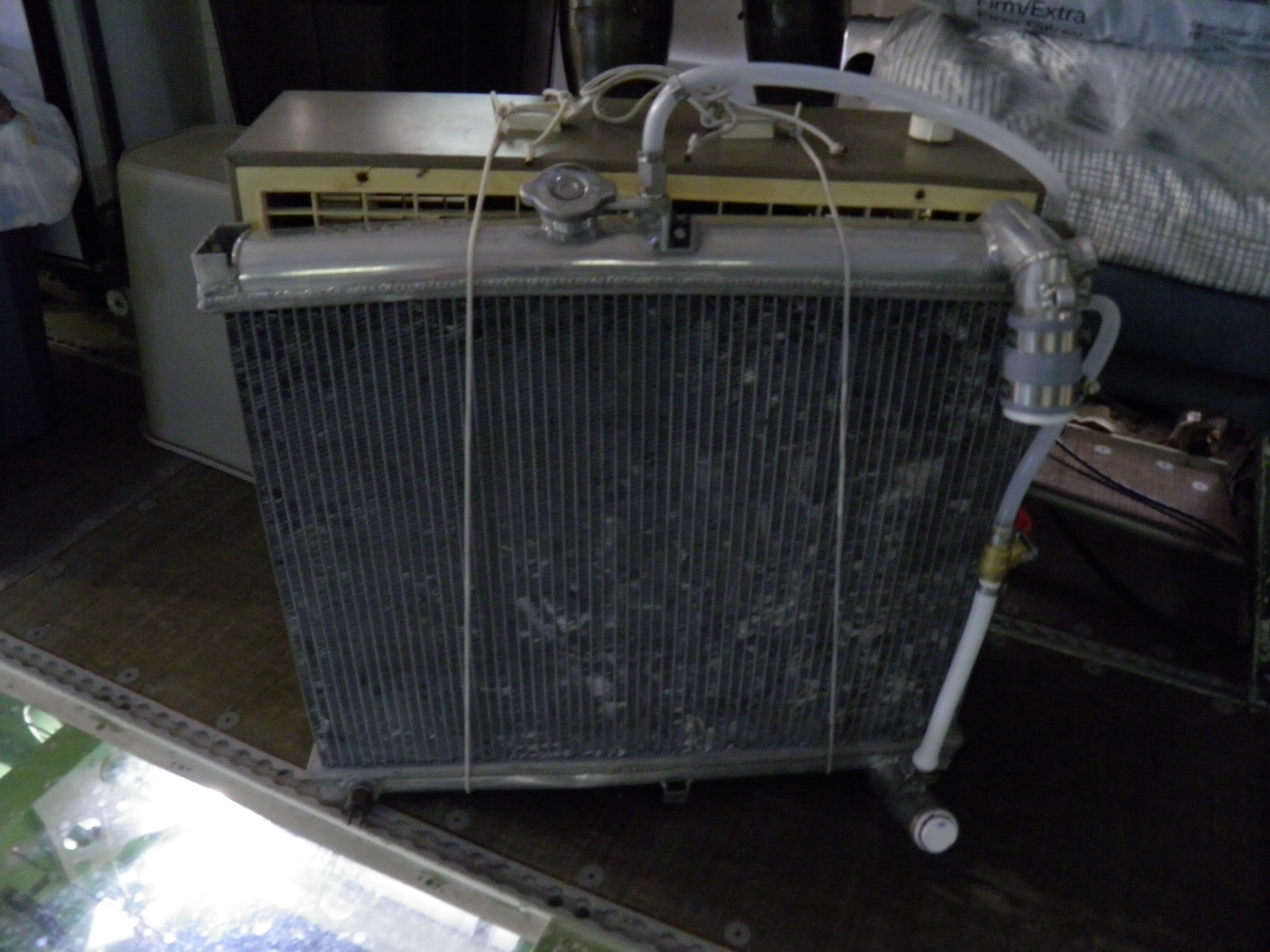 Returning to interior work, the initial working model of a well water based climate control system was built and is crudely operational. My well water is always 13 ¡C irrespective of the season or weather. So it provides a very economical medium to sink or source heat. In the current assembly the well water circulates through an old Mazda RX-7 aluminum radiator with a box fan simply strapped to its aft side. Upon exit the water is simply dumped overboard (currently simply through a condensation drain valve, but later through a drain mast). The system cools or heats the cabin air toward the 13 ¡C temperature of the well water. Obviously during cold weather an adjunct heat pump or other ancillary heating will be required. But during hot weather no additional cooling equipment will be required if the well water based system provides sufficient capacity.