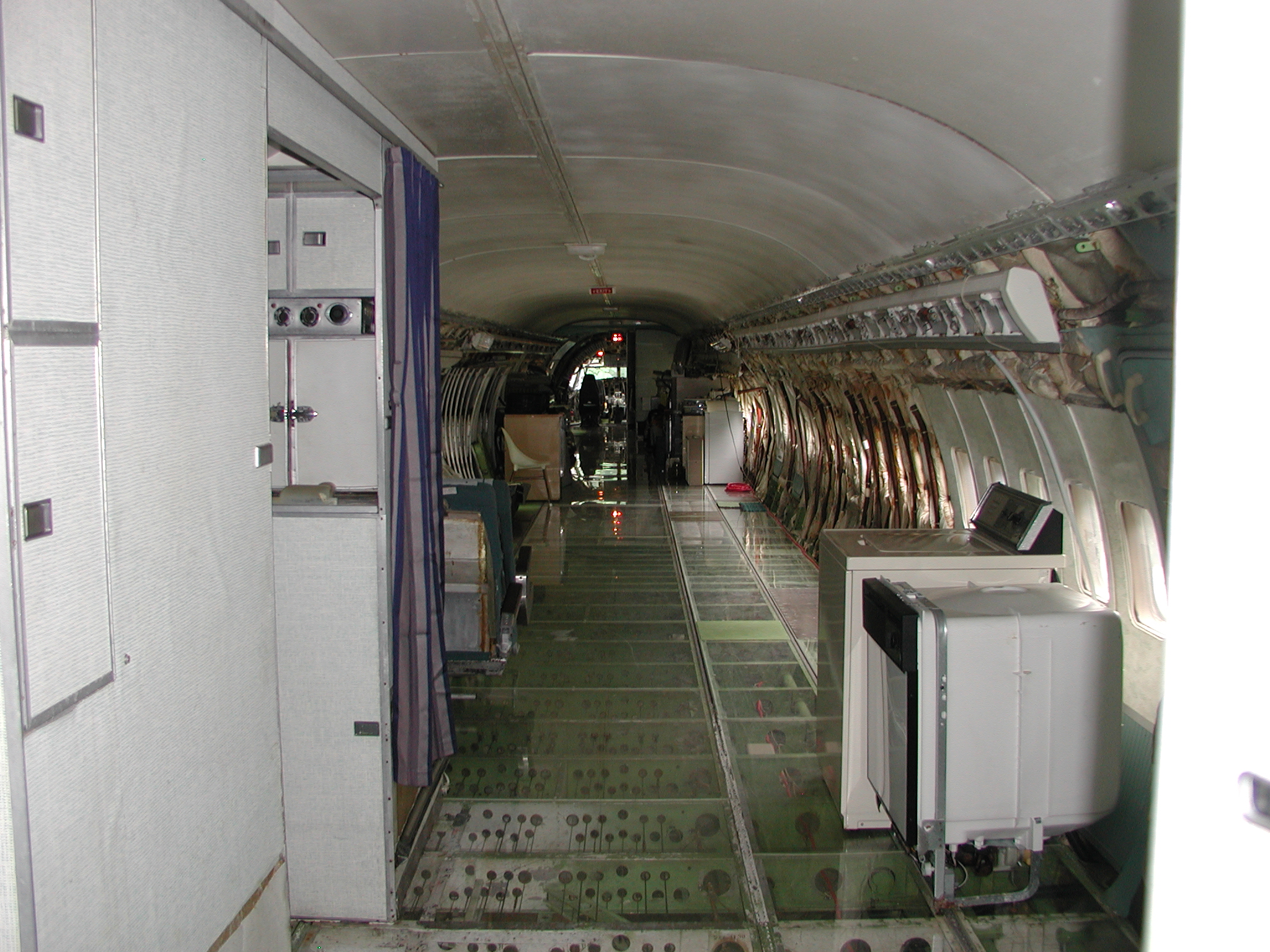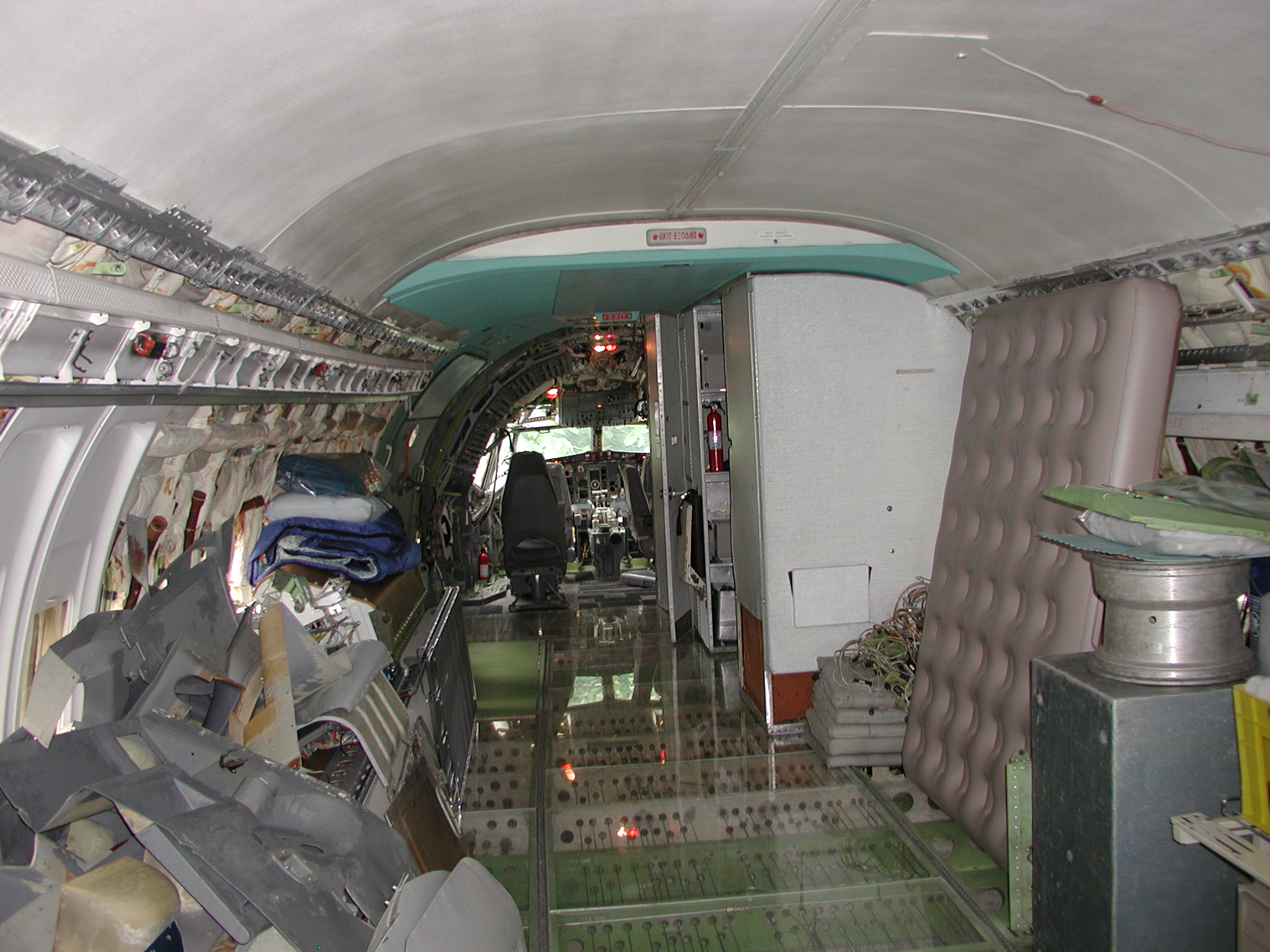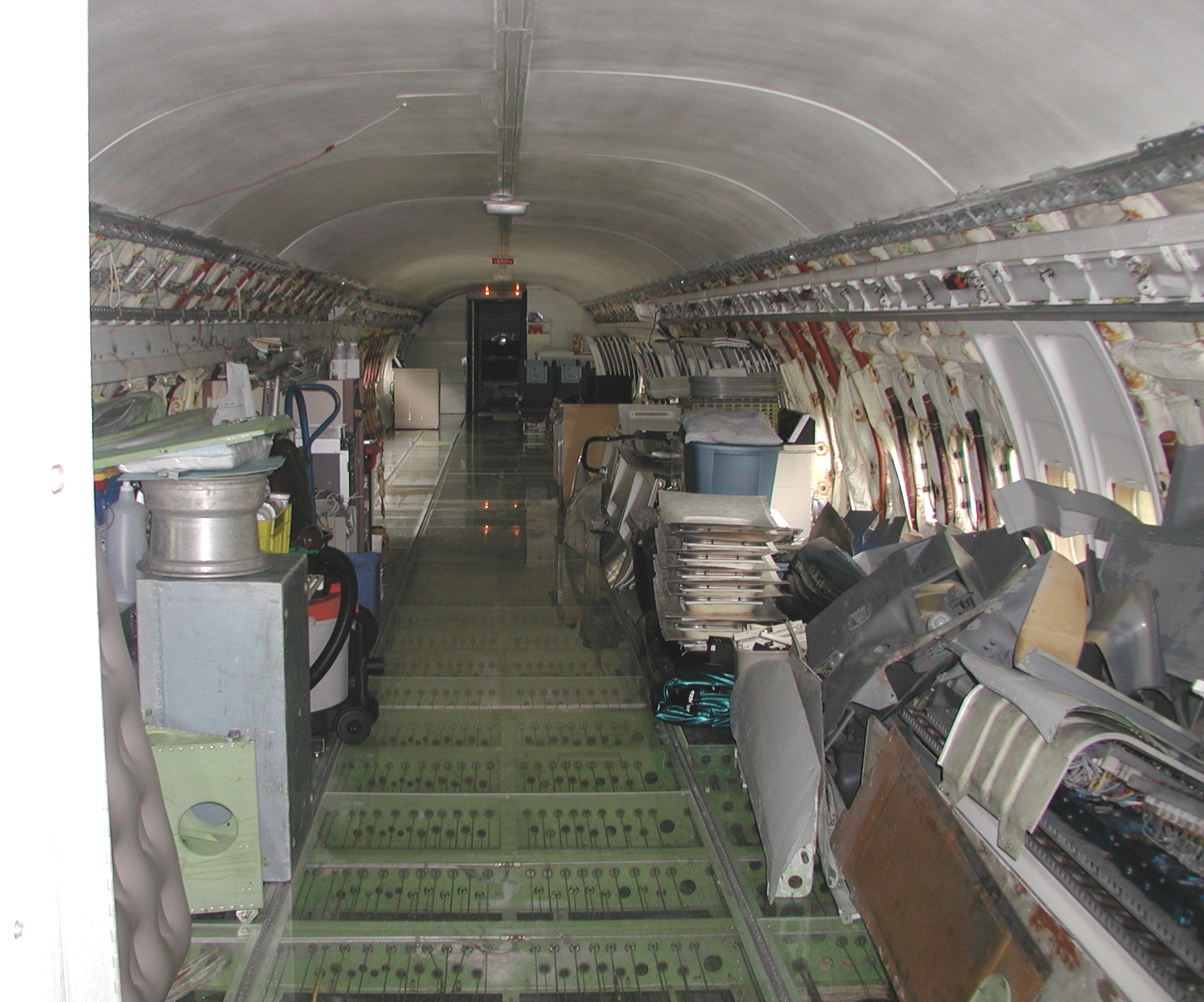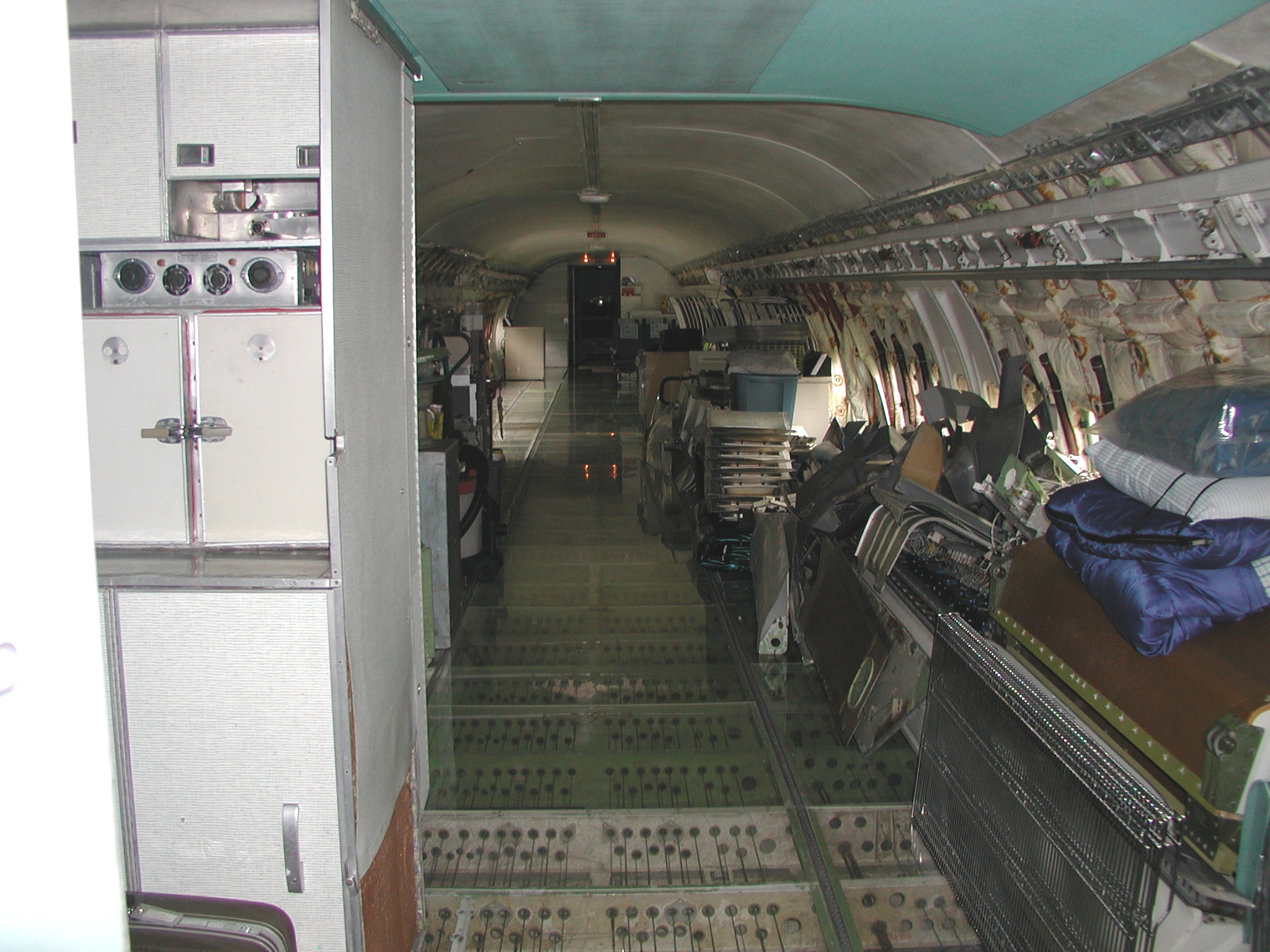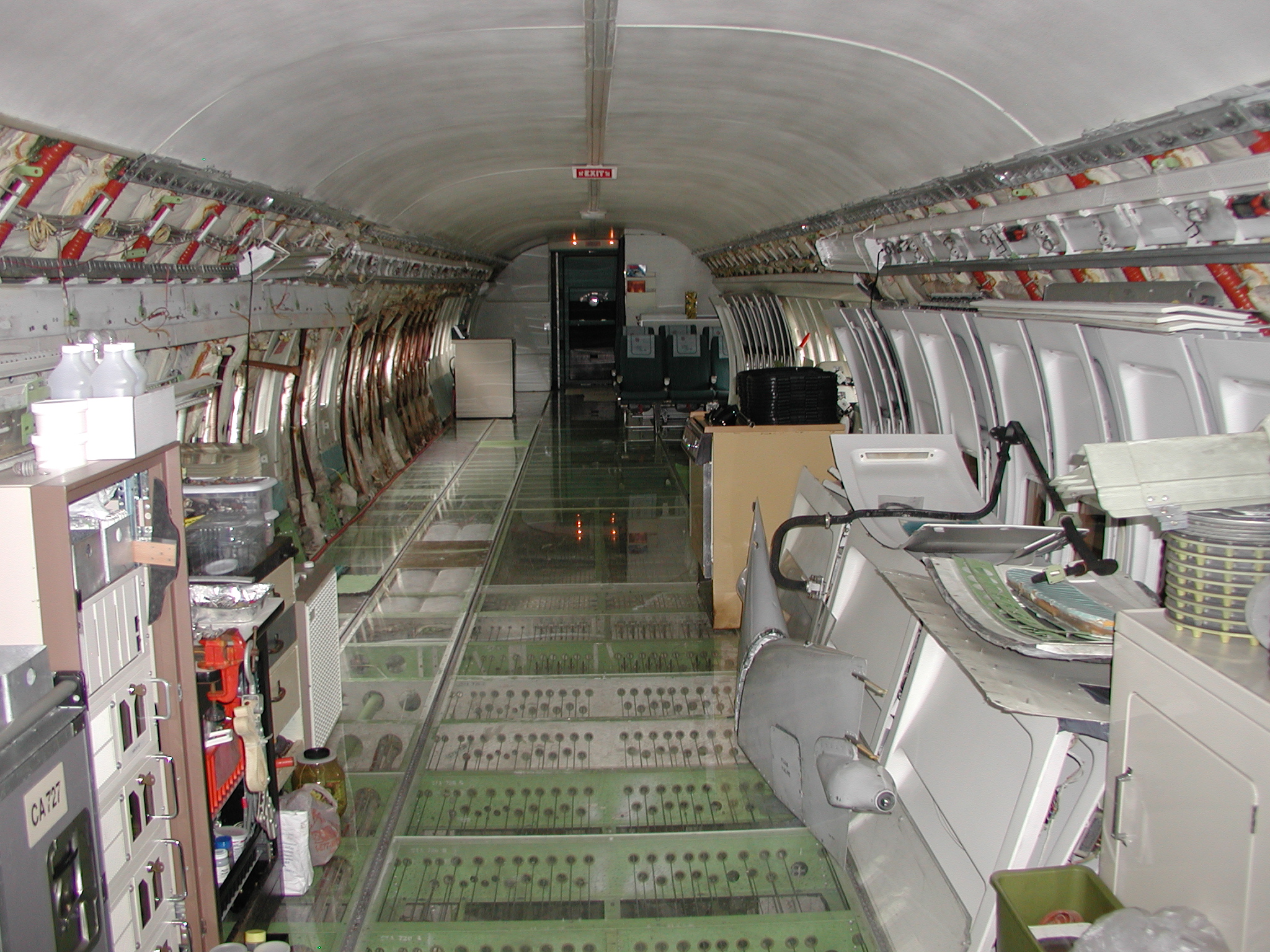 A film crew from Ireland shot a D. B. Cooper piece using my aircraft as a set a couple of weeks ago, which went well. It dovetailed very nicely with the need to clear material from the aft cabin to prepare for removal of the remaining old window panels and vacuum cleaning and pressure washing of the areas behind them, and pressure washing of the back sides of the fluorescent light tunnel, and the incandescent ceiling light panels. I cleared most of the material before the shoot, storing much of it in the forward cargo bay, and placing the cockpit seats in the cockpit. I also cleaned and reassembled another passenger seat row as you can see in the images. After the shoot I removed the remaining window panels from the right side. The remaining left side panels still need to be removed, then the cleaning needs to be accomplished, coordinating with hot weather so that the area will dry reasonably quickly afterward. After that, the new side panels with their fluorescent light wiring harnesses can be mounted when time permits, which should beautify the cabin substantially, and give me freedom to move things about in the cabin as I please.