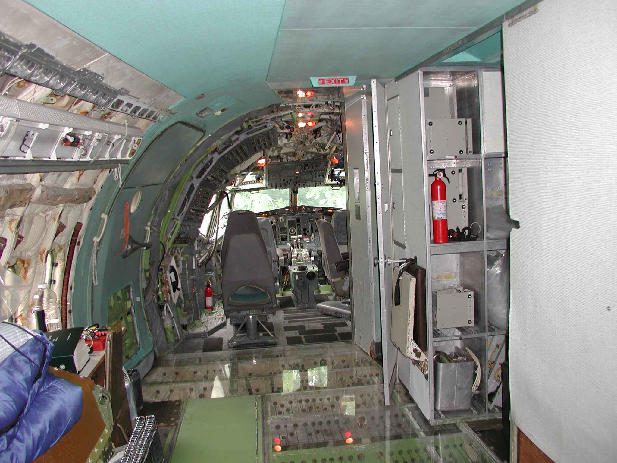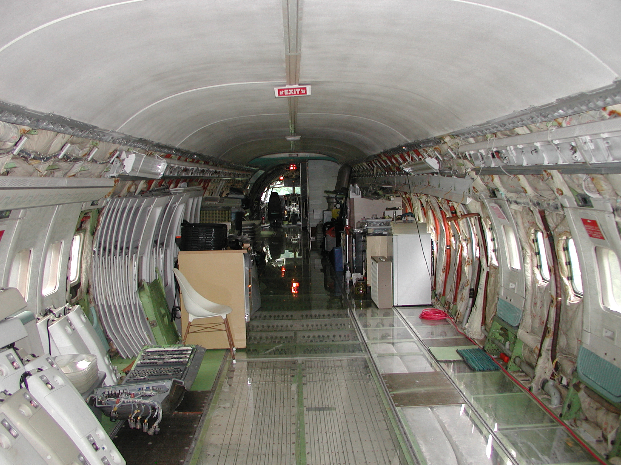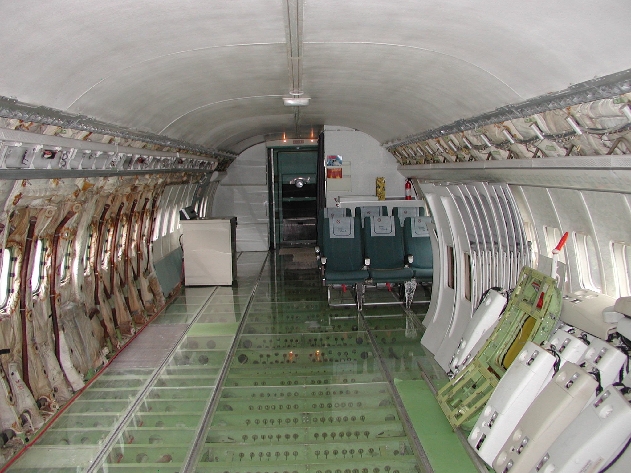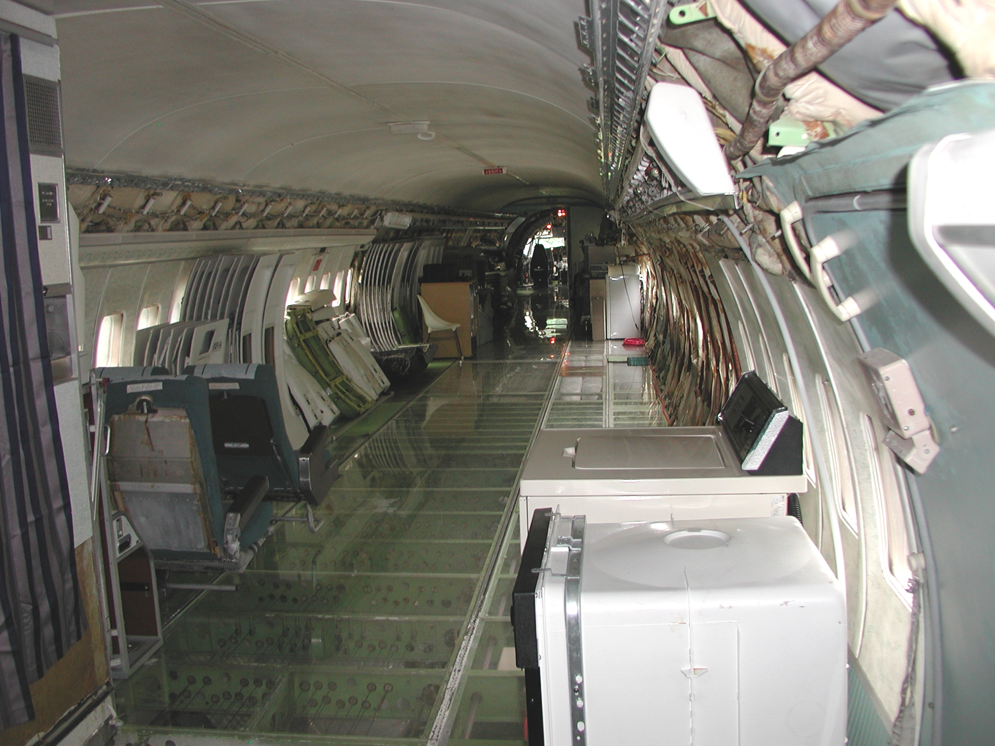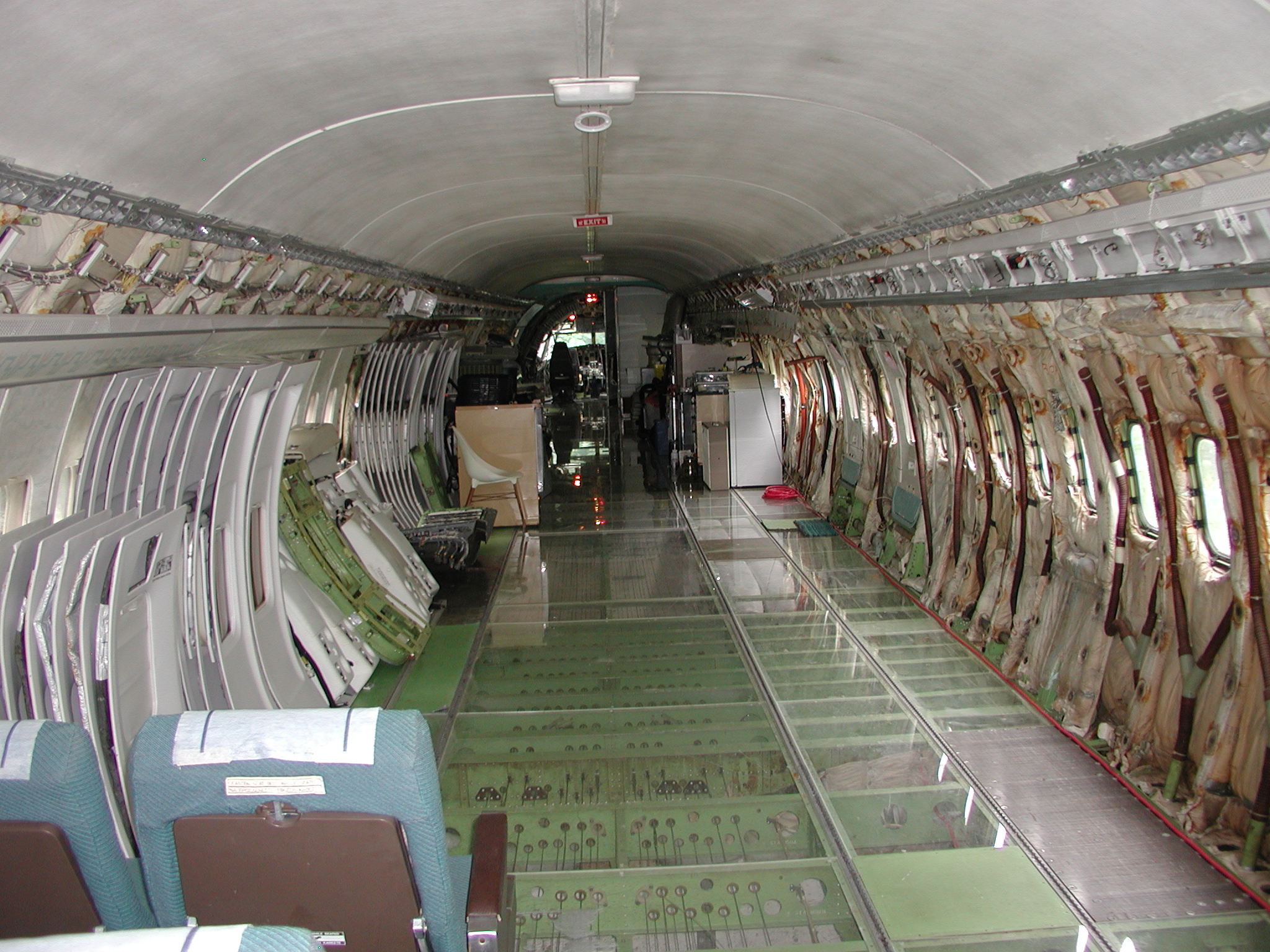 A film crew from Ireland shot a D. B. Cooper piece using my aircraft as a set a couple of weeks ago, which went well. It dovetailed very nicely with the need to clear material from the aft cabin to prepare for removal of the remaining old window panels and vacuum cleaning and pressure washing of the areas behind them, and pressure washing of the back sides of the fluorescent light tunnel, and the incandescent ceiling light panels. I cleared most of the material before the shoot, storing much of it in the forward cargo bay, and placing the cockpit seats in the cockpit. I also cleaned and reassembled another passenger seat row as you can see in the images. After the shoot I removed the remaining window panels from the right side. The remaining left side panels still need to be removed, then the cleaning needs to be accomplished, coordinating with hot weather so that the area will dry reasonably quickly afterward. After that, the new side panels with their fluorescent light wiring harnesses can be mounted when time permits, which should beautify the cabin substantially, and give me freedom to move things about in the cabin as I please.
