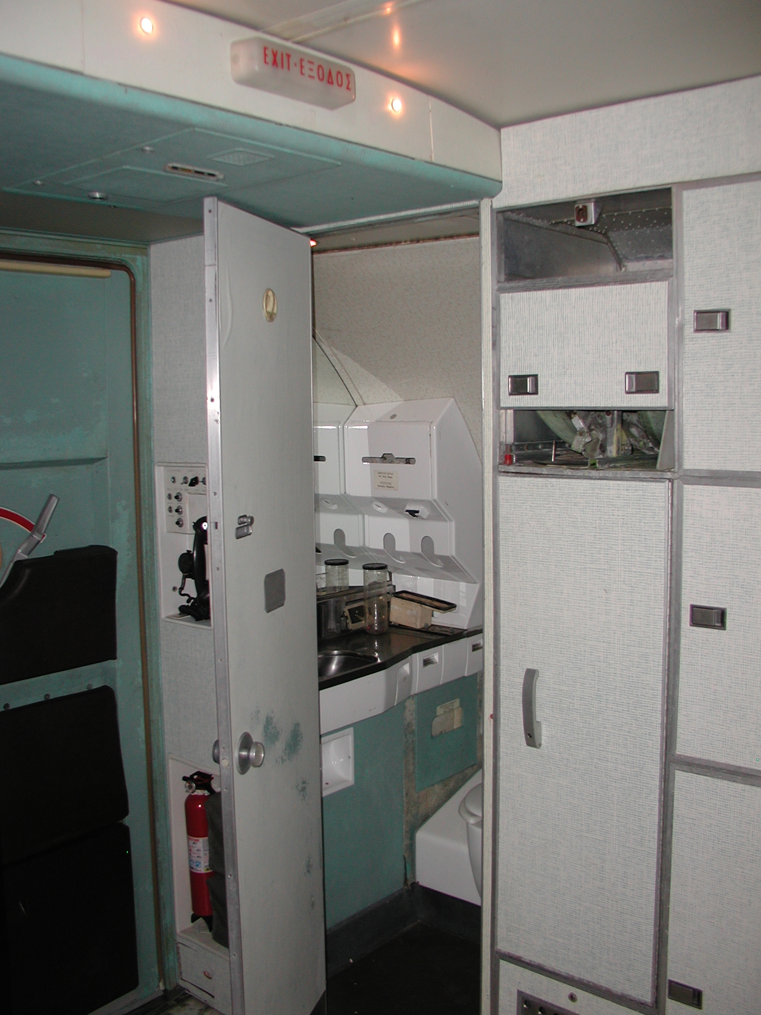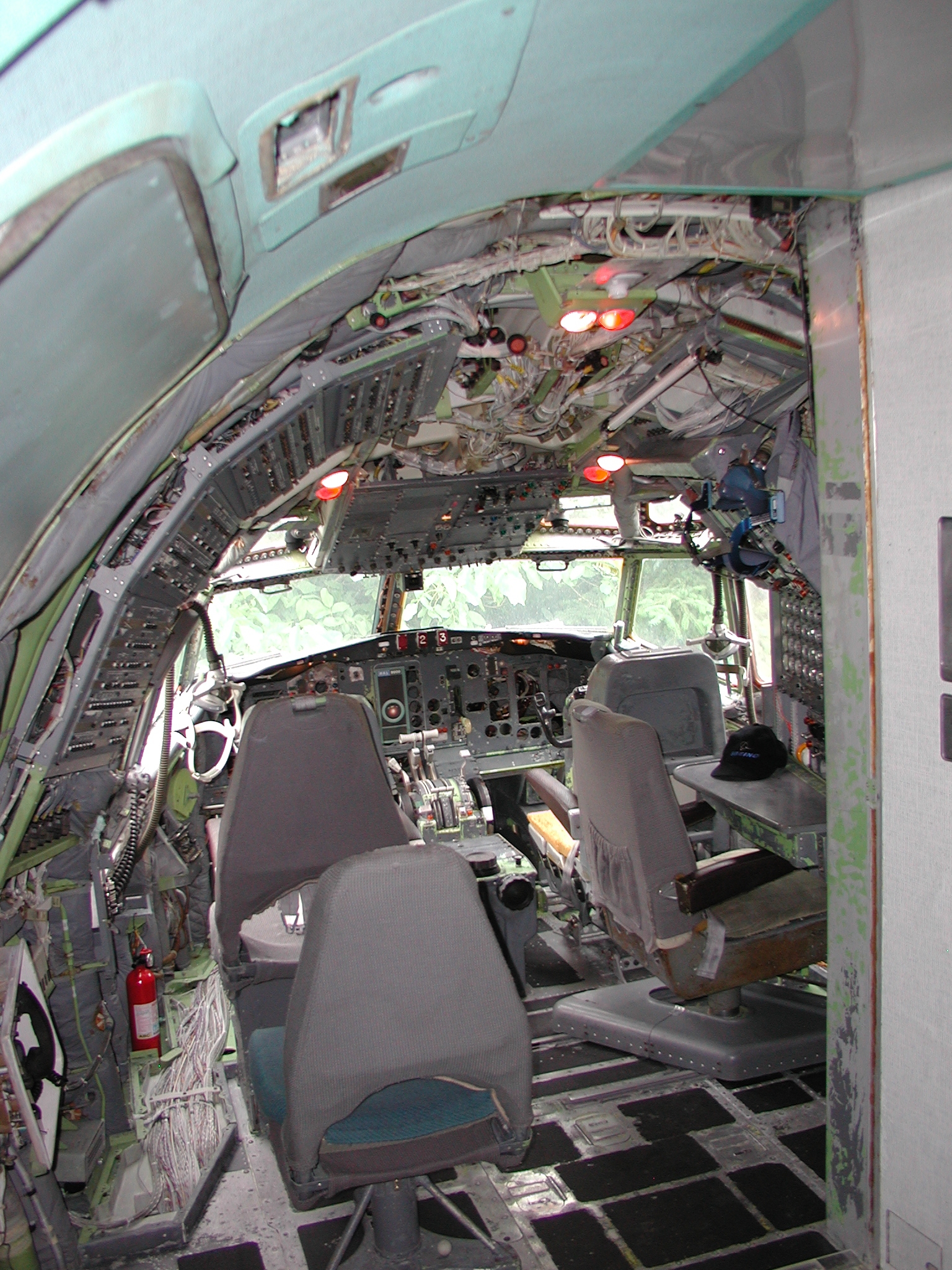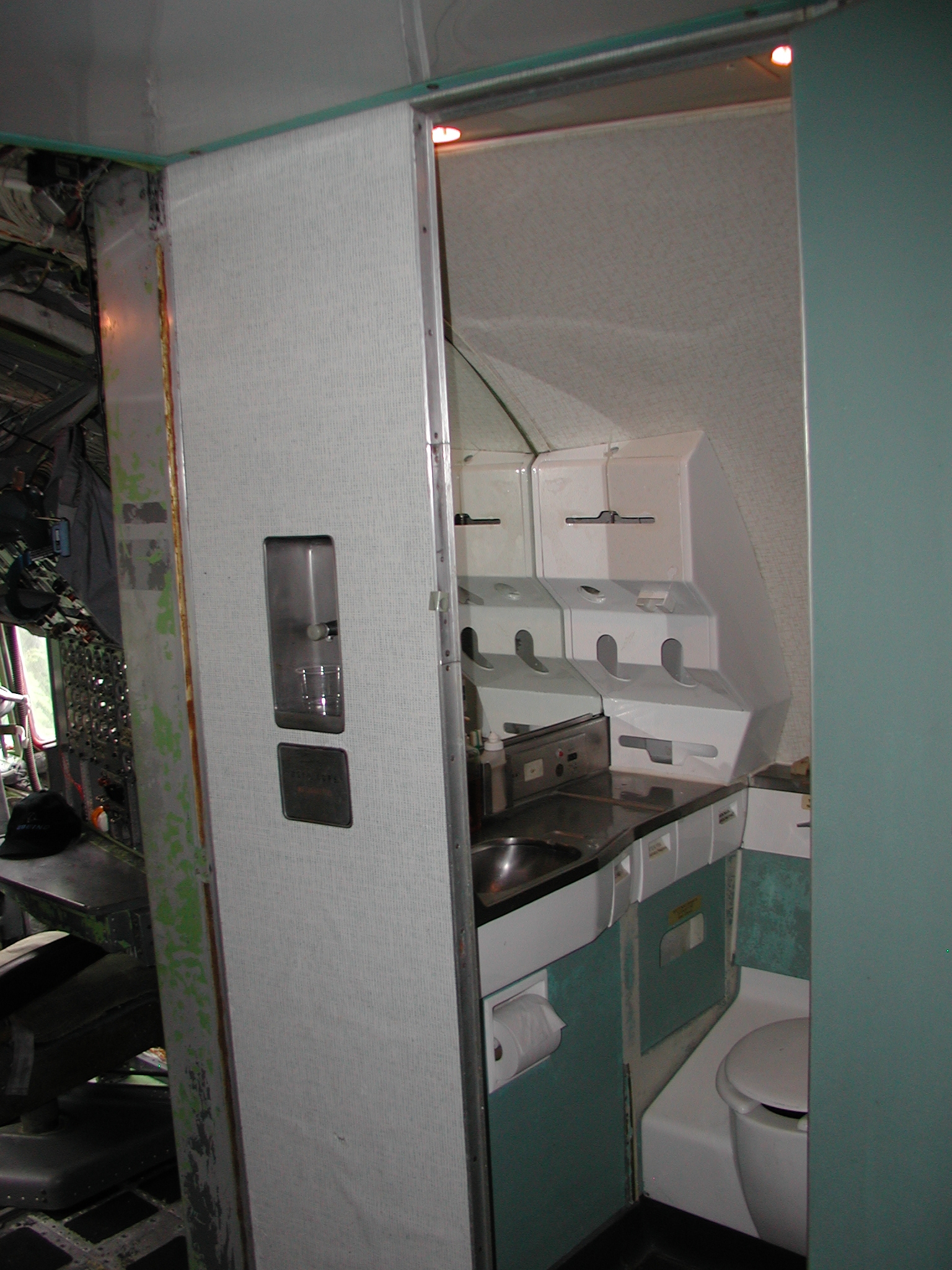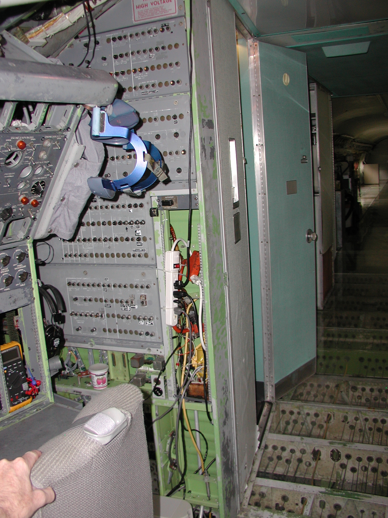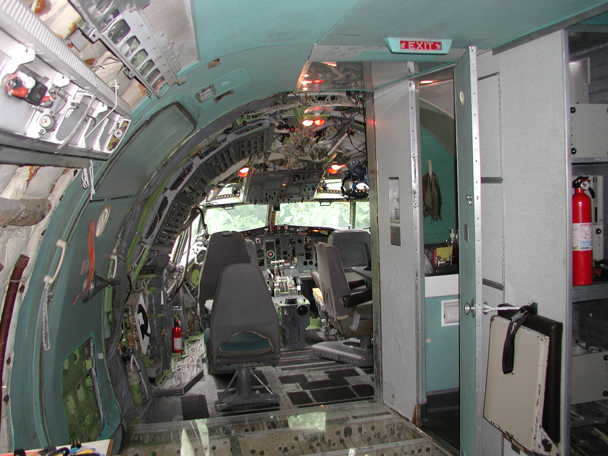 A film crew from Ireland shot a D. B. Cooper piece using my aircraft as a set a couple of weeks ago, which went well. It dovetailed very nicely with the need to clear material from the aft cabin to prepare for removal of the remaining old window panels and vacuum cleaning and pressure washing of the areas behind them, and pressure washing of the back sides of the fluorescent light tunnel, and the incandescent ceiling light panels. I cleared most of the material before the shoot, storing much of it in the forward cargo bay, and placing the cockpit seats in the cockpit. I also cleaned and reassembled another passenger seat row as you can see in the images. After the shoot I removed the remaining window panels from the right side. The remaining left side panels still need to be removed, then the cleaning needs to be accomplished, coordinating with hot weather so that the area will dry reasonably quickly afterward. After that, the new side panels with their fluorescent light wiring harnesses can be mounted when time permits, which should beautify the cabin substantially, and give me freedom to move things about in the cabin as I please.