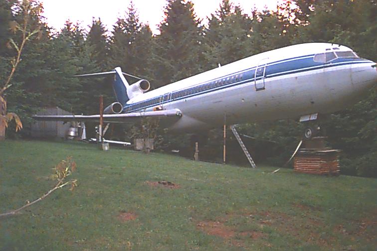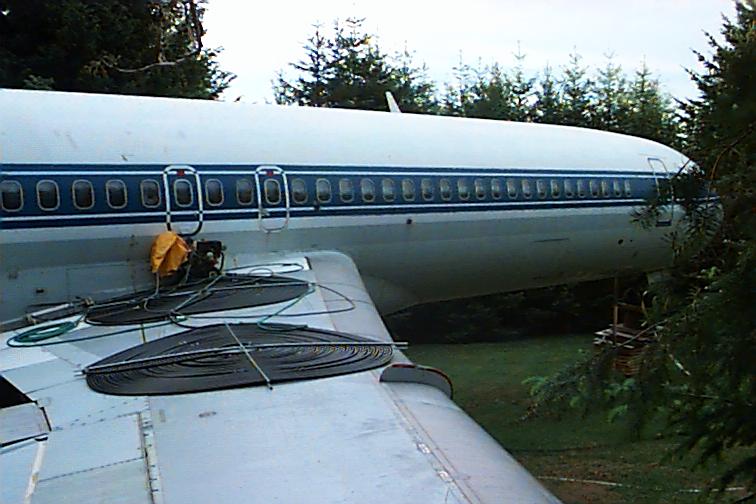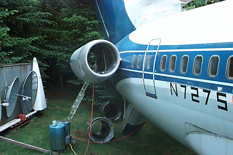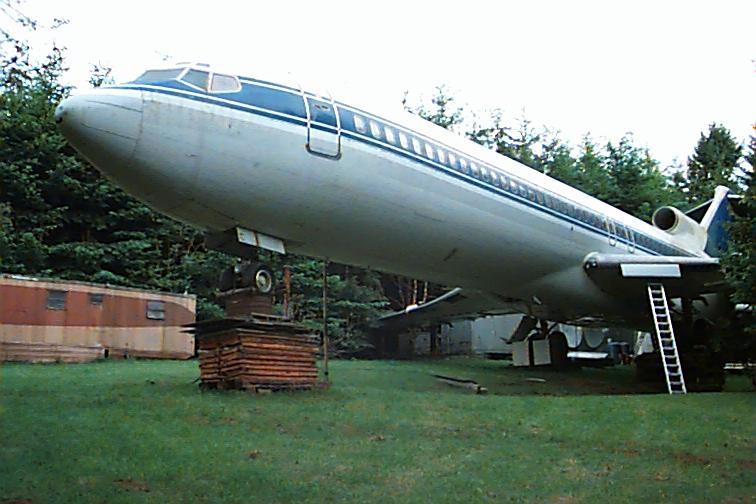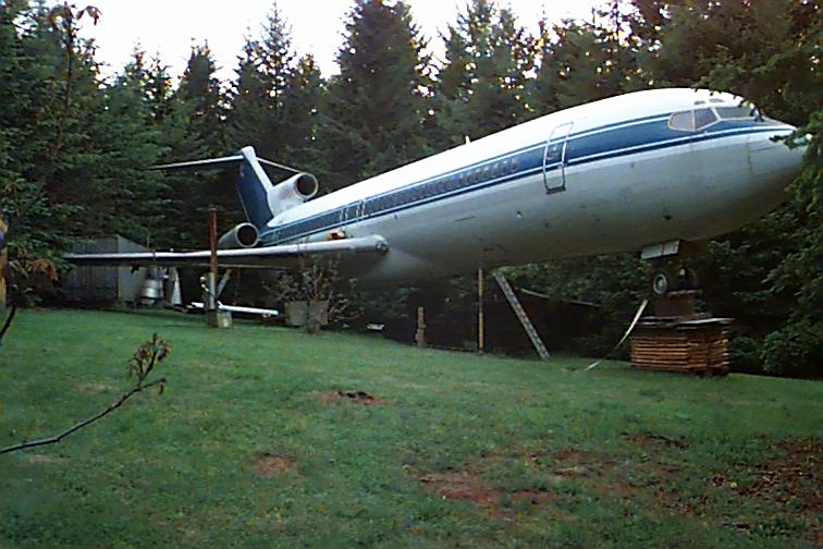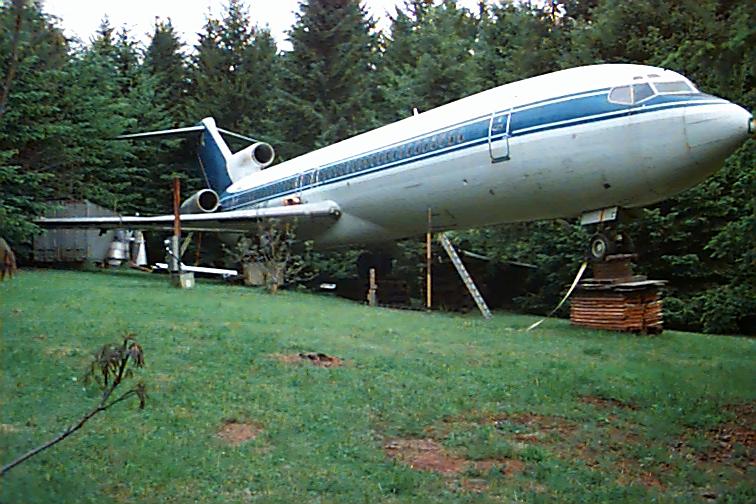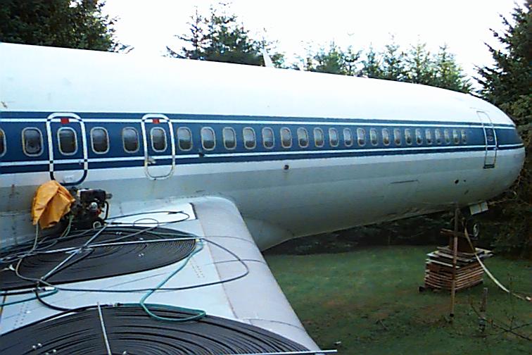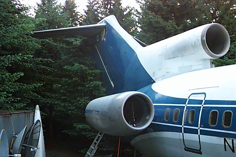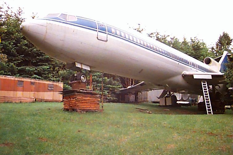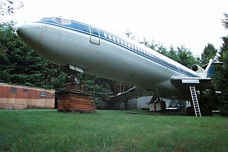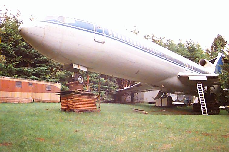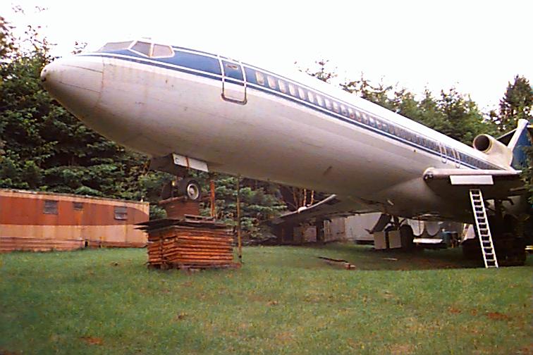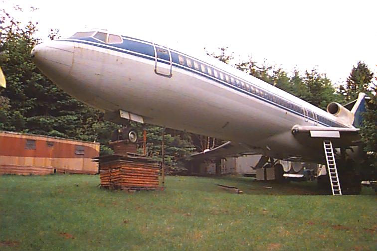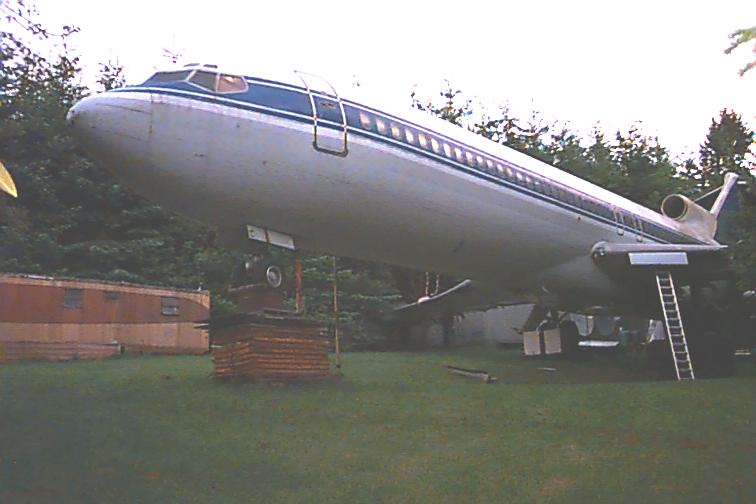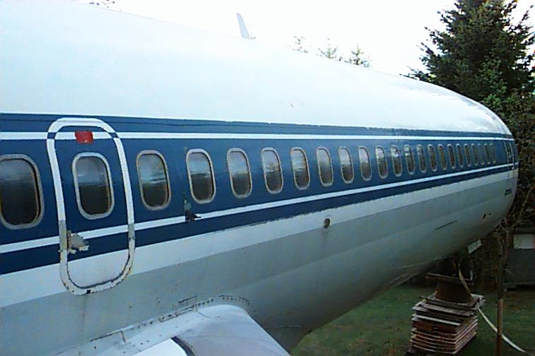 The aircraft looks more rough in these images than it does in reality, as best I can judge. Extensive pressure washing has caused a lot of paint removal, most of which comes off as chips, leaving surfaces looking like they're corroded in these images, even though in most cases they aren't. Paint loss is a necessary evil at this time. In fact, I'd prefer that all the overcoat paint (as opposed to the underlying corrosion preventative primer) come off when pressure washed, but that's not it's nature. When the more important things are completed, and I've moved in, I'll attend to beautification with a new coating of some sort - hopefully something much longer lasting than traditional paint. Maybe I can eventually get it to look like the Braniff 727 in the first image, which was obviously a new aircraft at the time the image was captured, right out of the paint shop (courtesy Boeing).