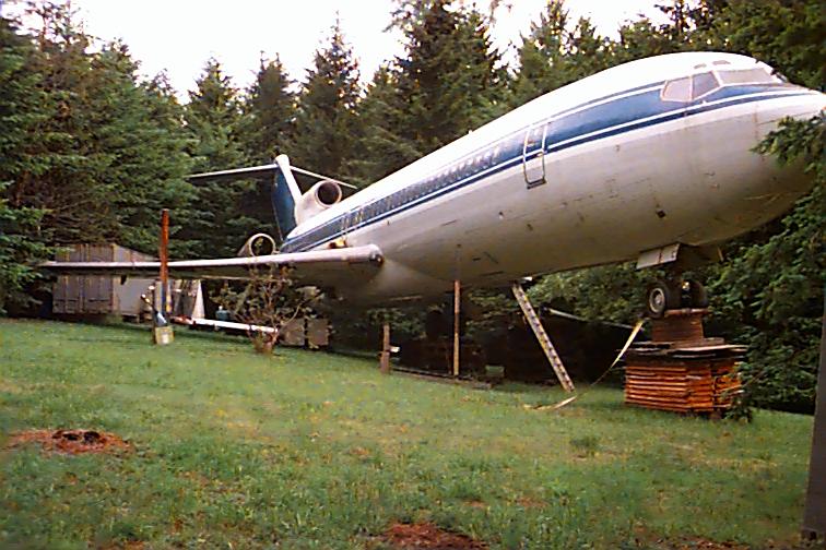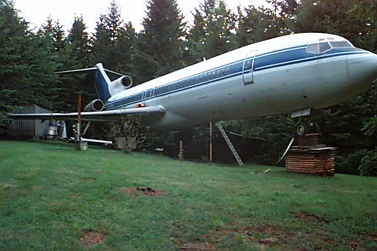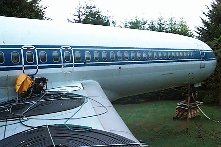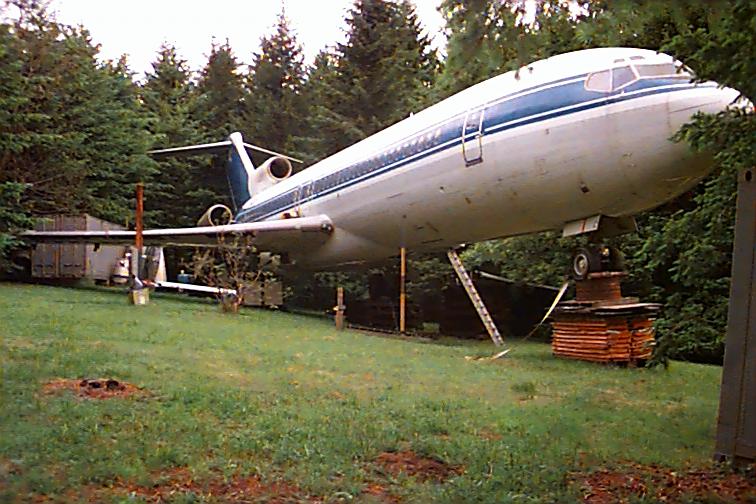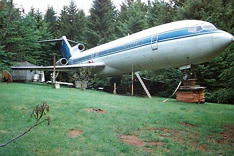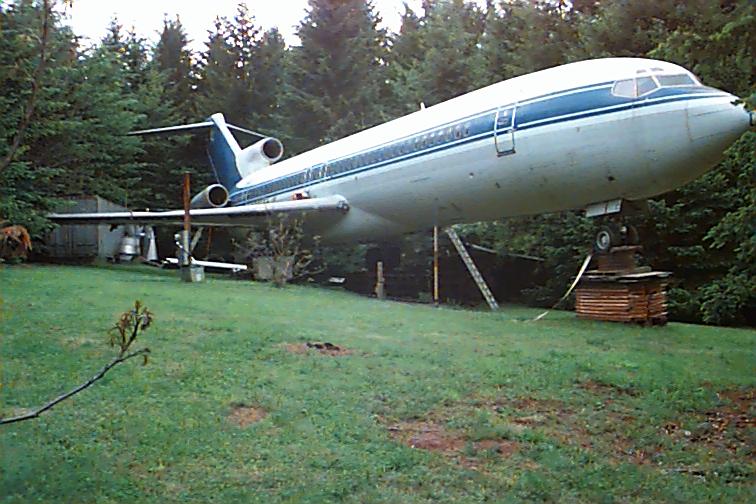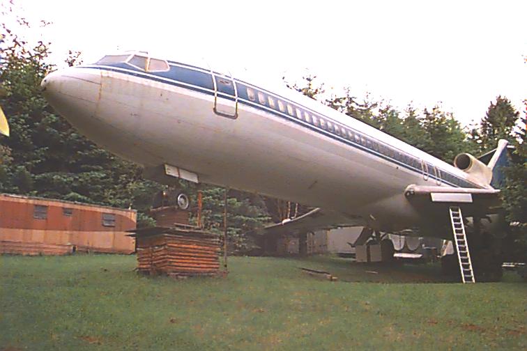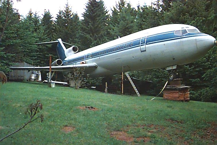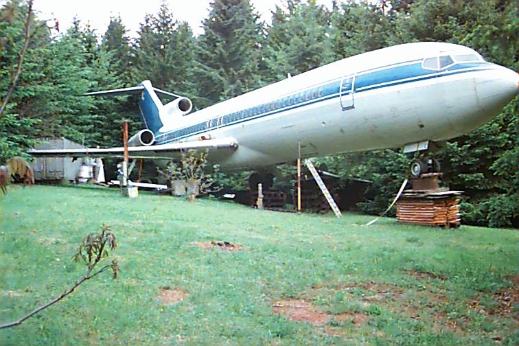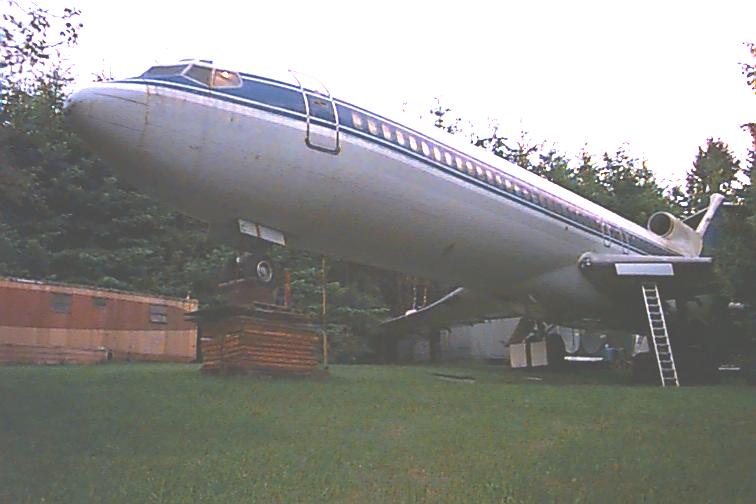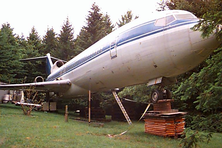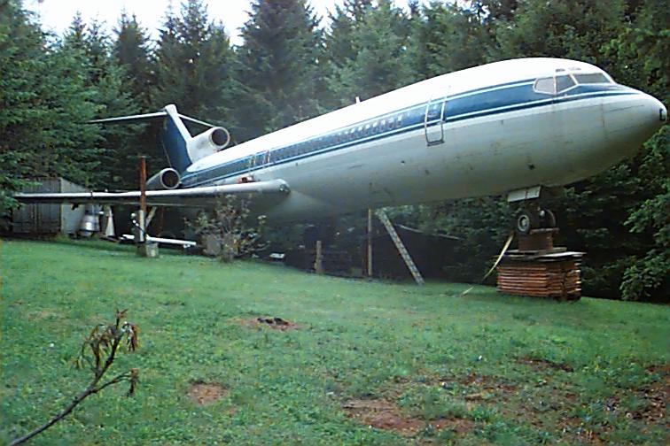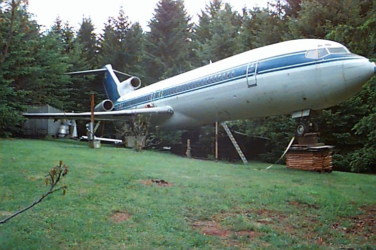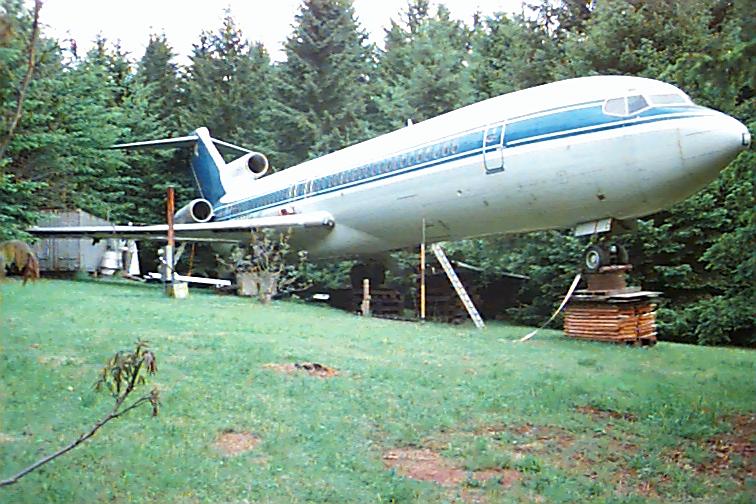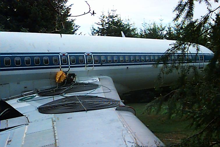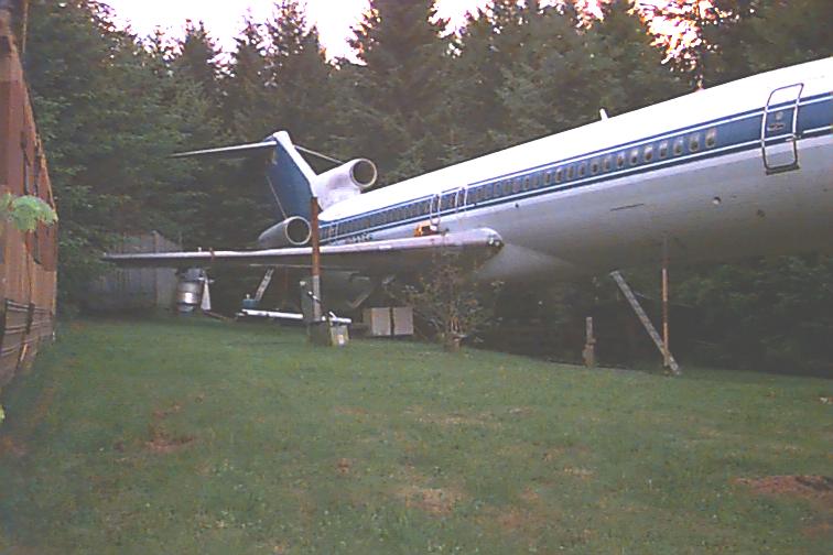 The aircraft looks more rough in these images than it does in reality, as best I can judge. Extensive pressure washing has caused a lot of paint removal, most of which comes off as chips, leaving surfaces looking like they're corroded in these images, even though in most cases they aren't. Paint loss is a necessary evil at this time. In fact, I'd prefer that all the overcoat paint (as opposed to the underlying corrosion preventative primer) come off when pressure washed, but that's not it's nature. When the more important things are completed, and I've moved in, I'll attend to beautification with a new coating of some sort - hopefully something much longer lasting than traditional paint. Maybe I can eventually get it to look like the Braniff 727 in the first image, which was obviously a new aircraft at the time the image was captured, right out of the paint shop (courtesy Boeing).