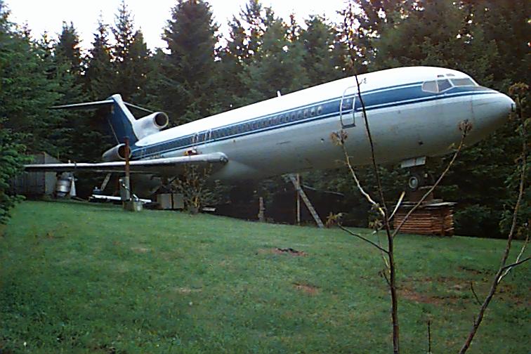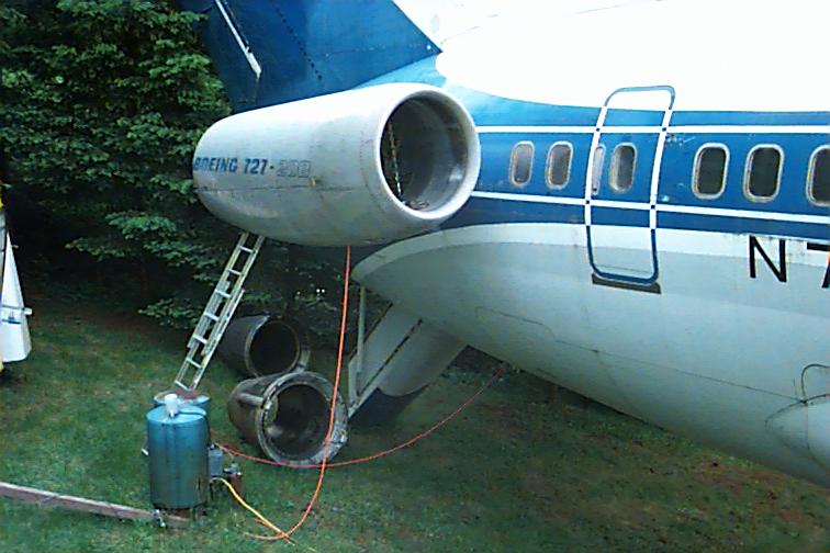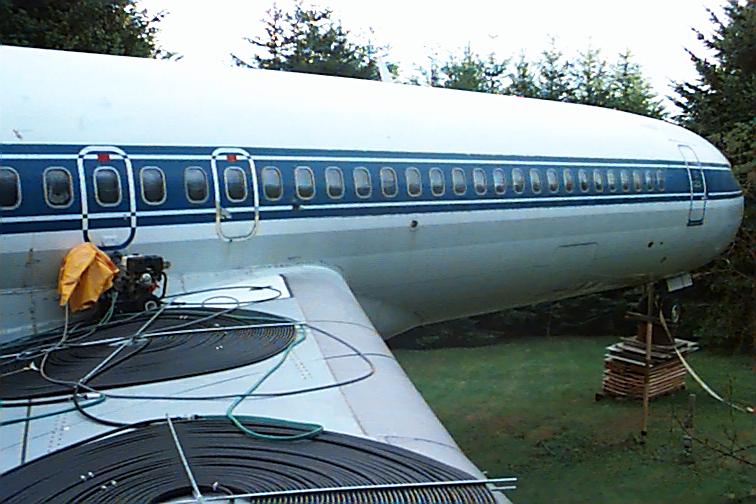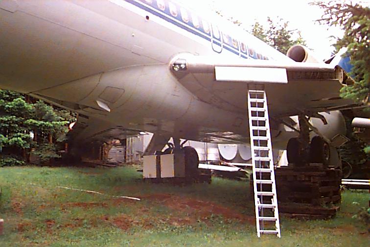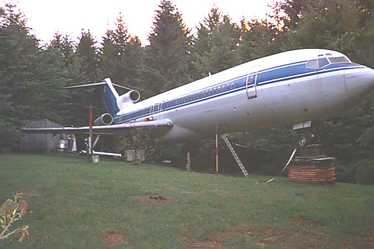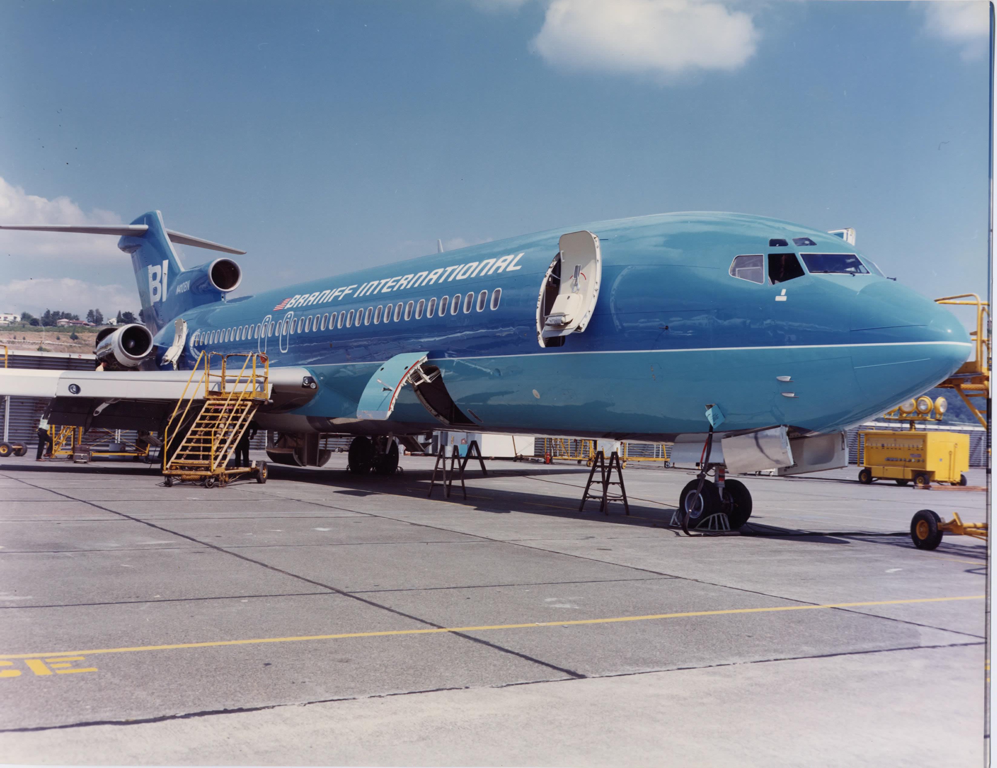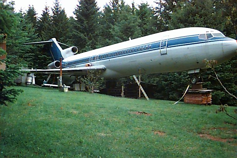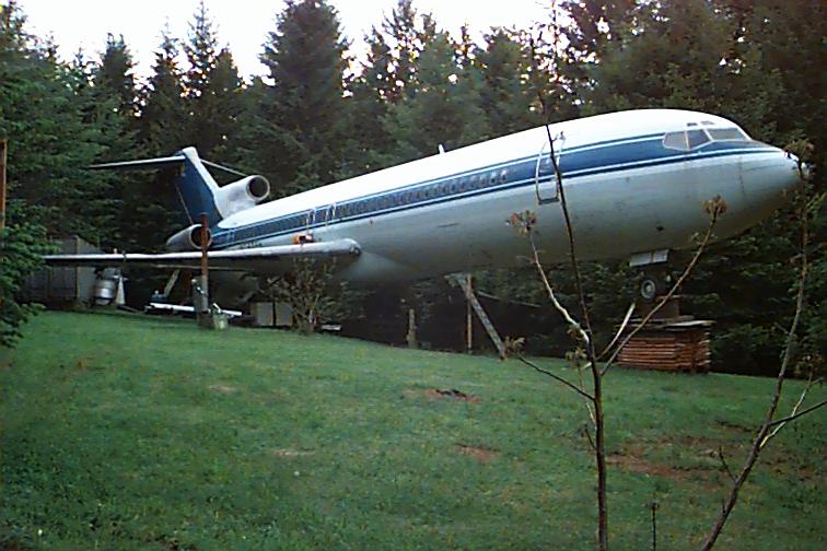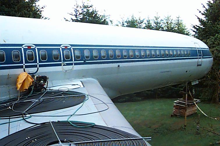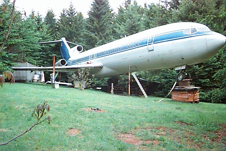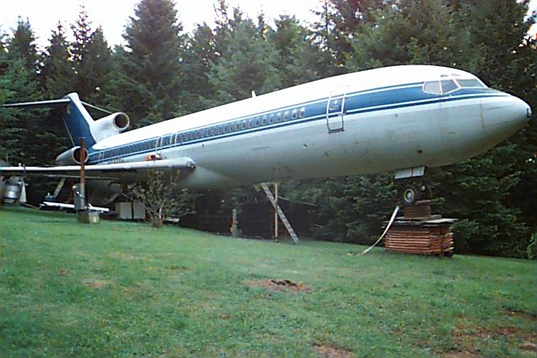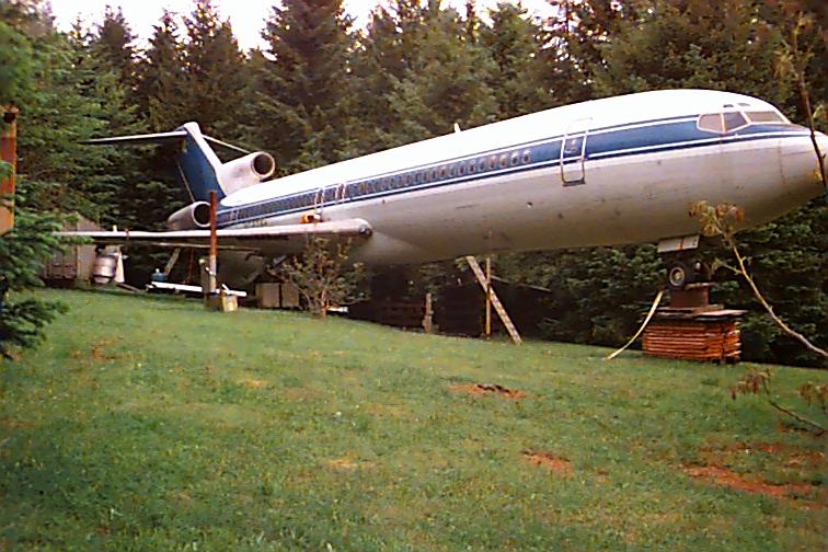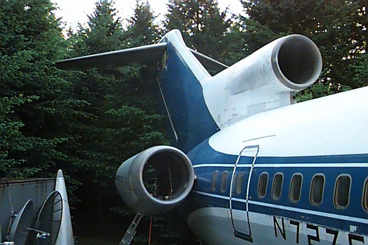 The aircraft looks more rough in these images than it does in reality, as best I can judge. Extensive pressure washing has caused a lot of paint removal, most of which comes off as chips, leaving surfaces looking like they're corroded in these images, even though in most cases they aren't. Paint loss is a necessary evil at this time. In fact, I'd prefer that all the overcoat paint (as opposed to the underlying corrosion preventative primer) come off when pressure washed, but that's not it's nature. When the more important things are completed, and I've moved in, I'll attend to beautification with a new coating of some sort - hopefully something much longer lasting than traditional paint. Maybe I can eventually get it to look like the Braniff 727 in the first image, which was obviously a new aircraft at the time the image was captured, right out of the paint shop (courtesy Boeing).