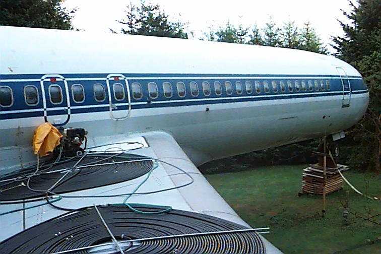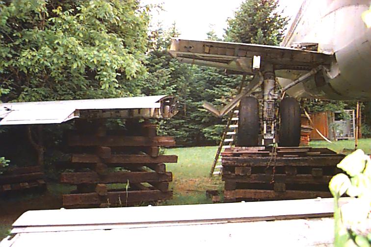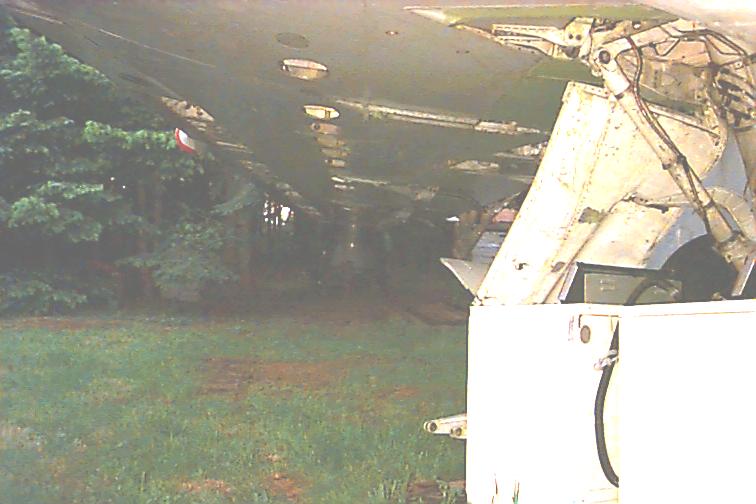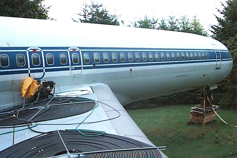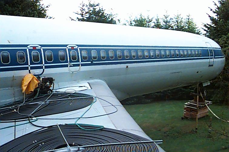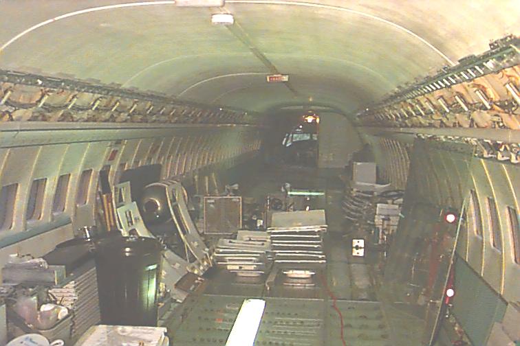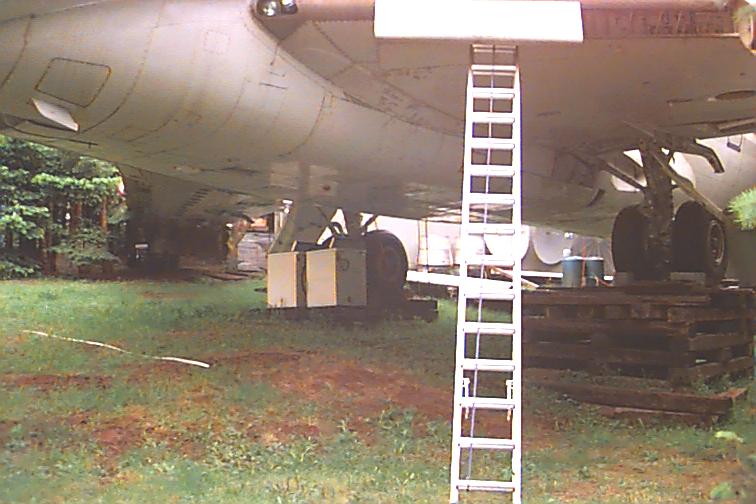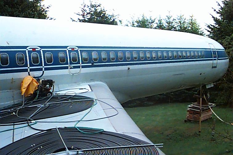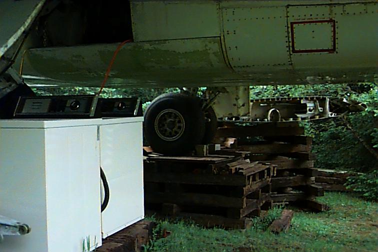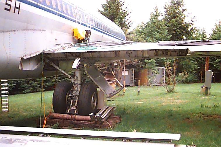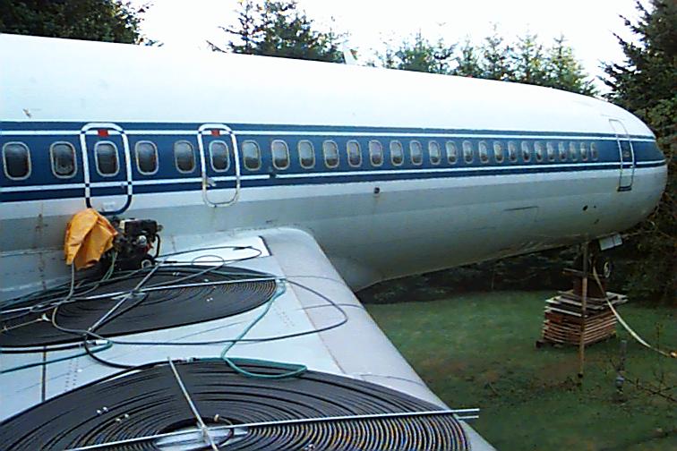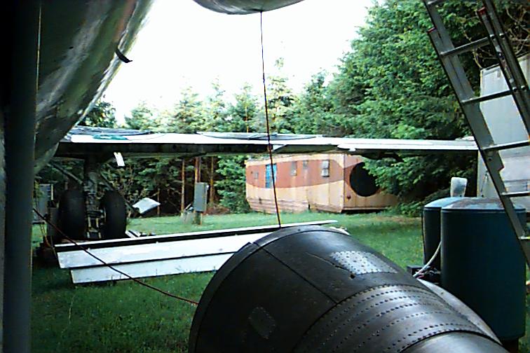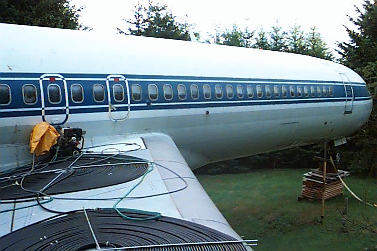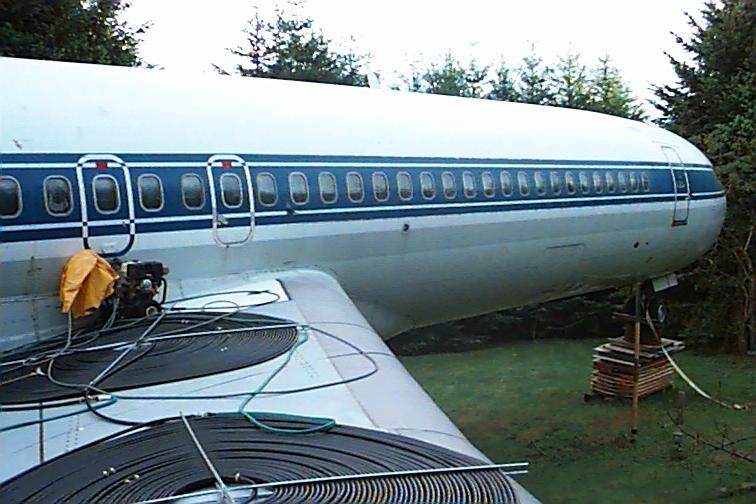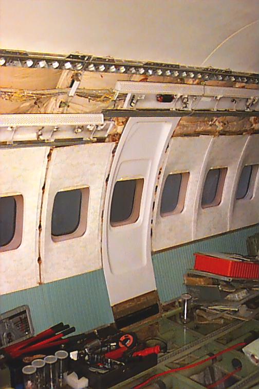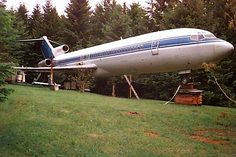 The aircraft looks more rough in these images than it does in reality, as best I can judge. Extensive pressure washing has caused a lot of paint removal, most of which comes off as chips, leaving surfaces looking like they're corroded in these images, even though in most cases they aren't. Paint loss is a necessary evil at this time. In fact, I'd prefer that all the overcoat paint (as opposed to the underlying corrosion preventative primer) come off when pressure washed, but that's not it's nature. When the more important things are completed, and I've moved in, I'll attend to beautification with a new coating of some sort - hopefully something much longer lasting than traditional paint. Maybe I can eventually get it to look like the Braniff 727 in the first image, which was obviously a new aircraft at the time the image was captured, right out of the paint shop (courtesy Boeing).