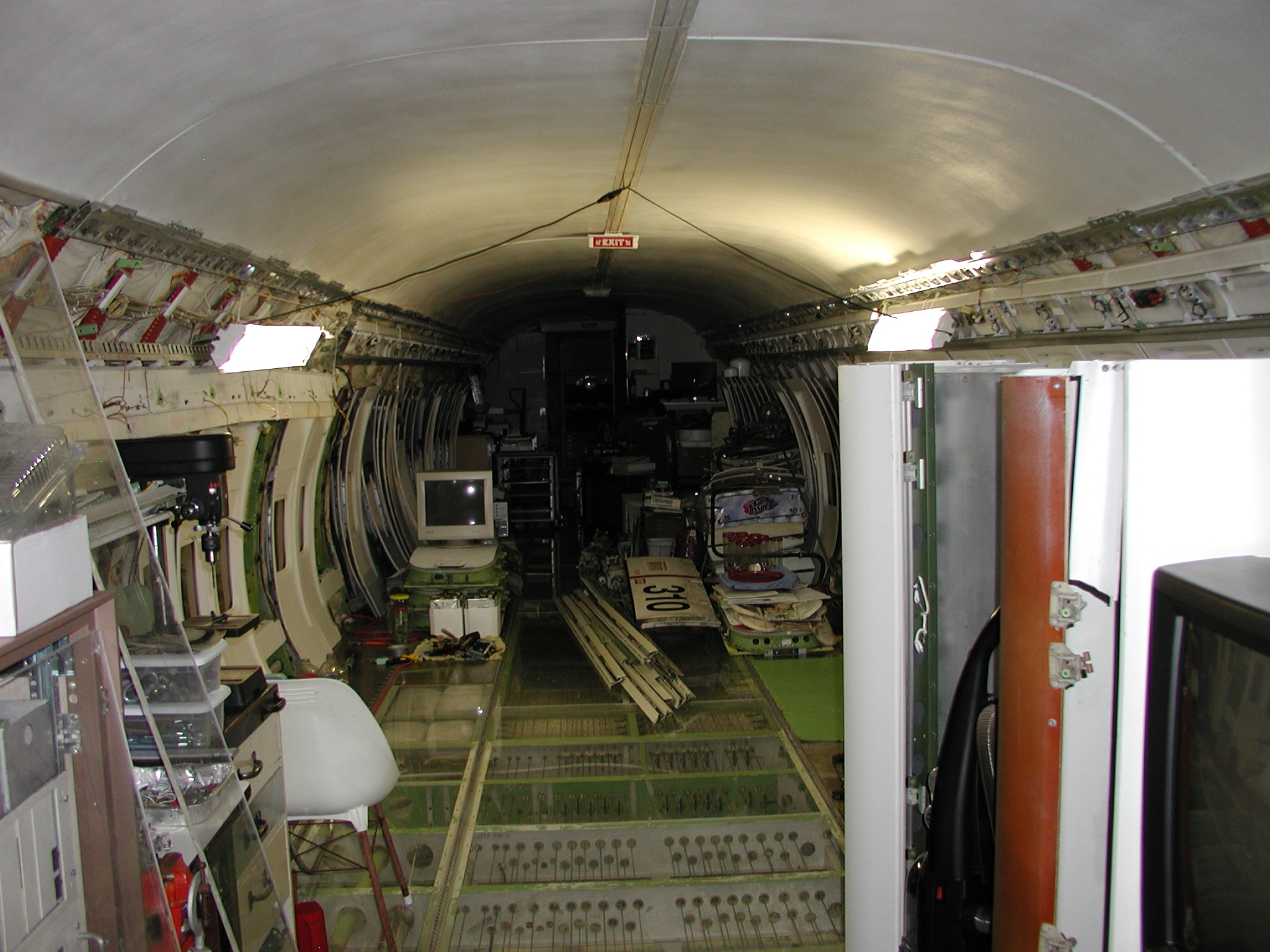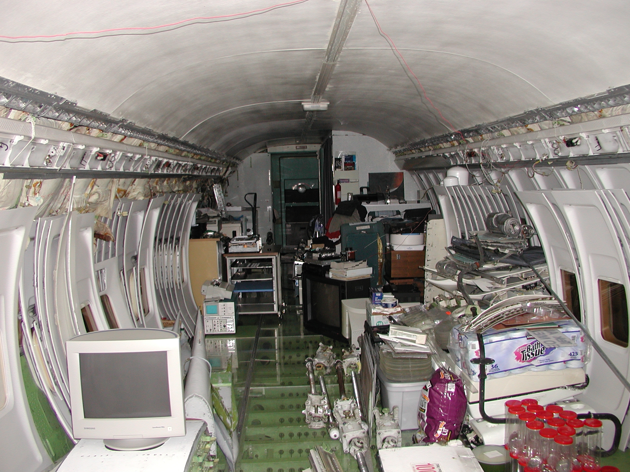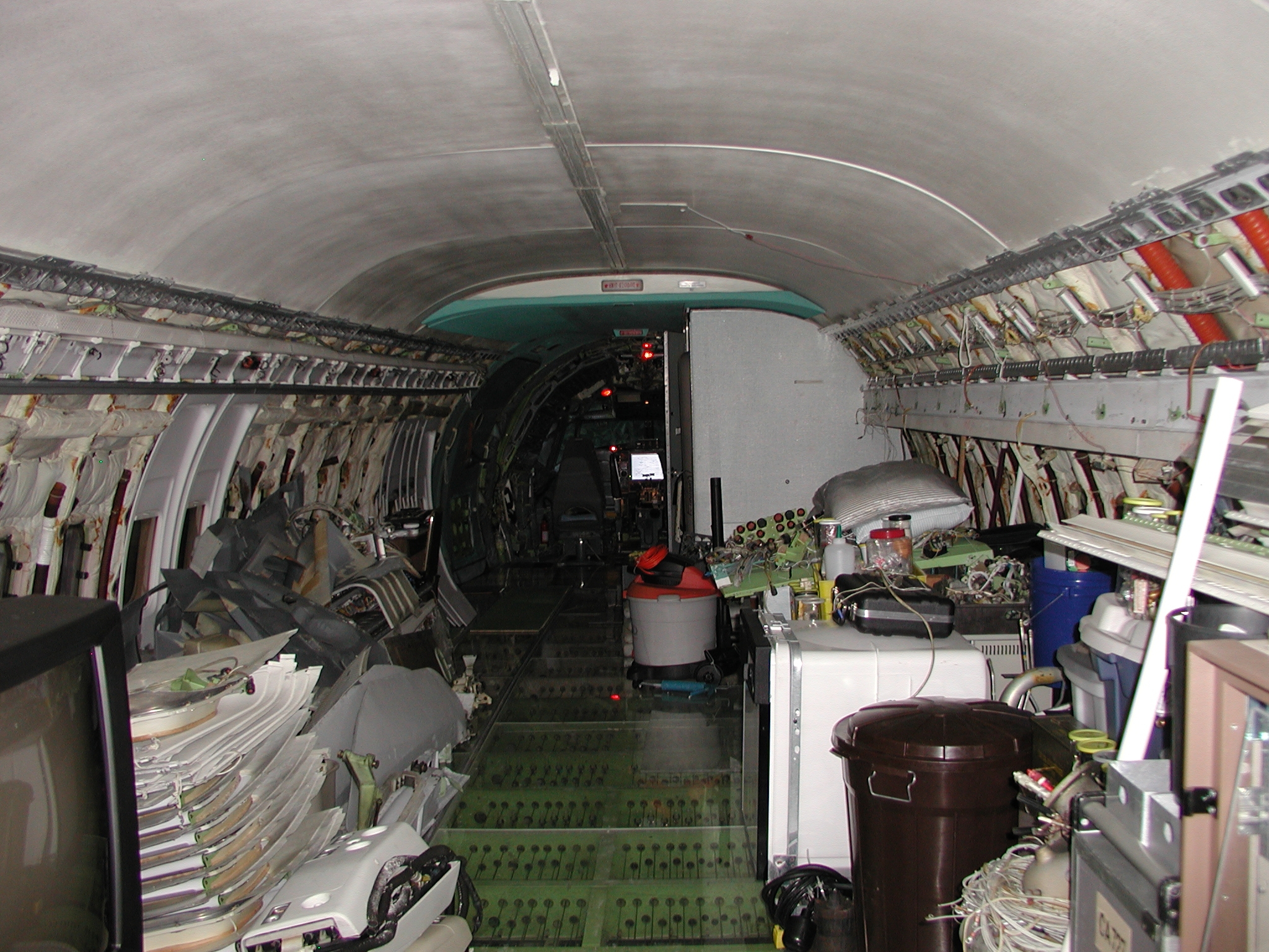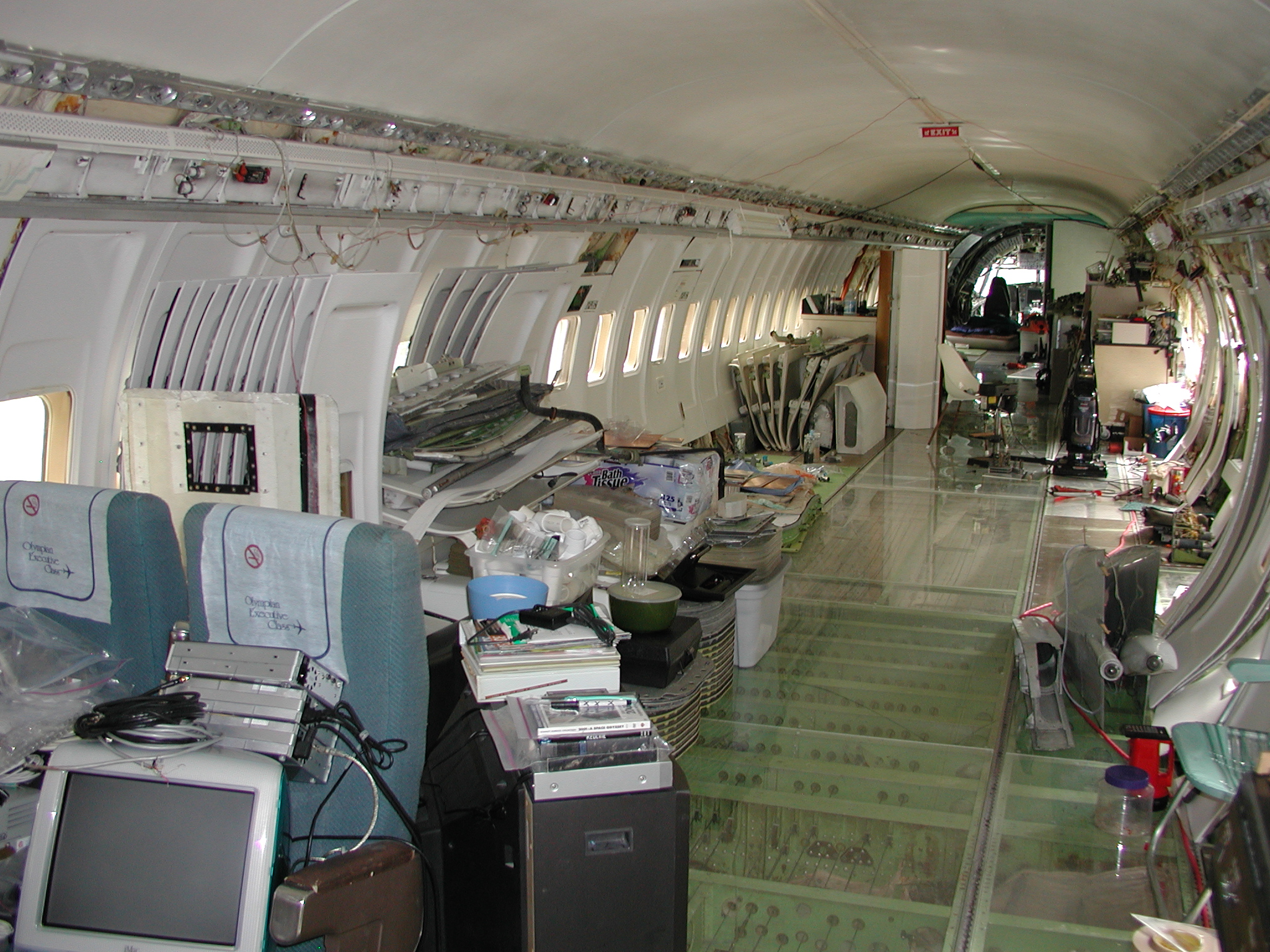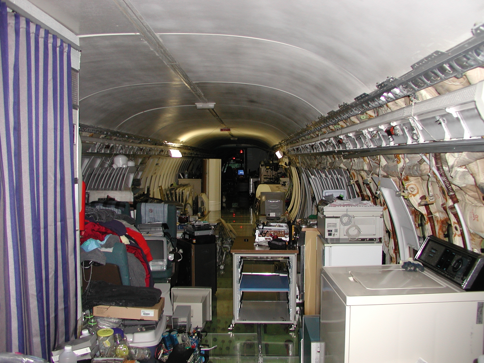The clutter that overwhelms the cabin is the result of pressure washing the last of the components acquired from the Lake City Florida 727 freighter during December 2004 to January 2005, plus a lot of pressure washed personal domestic possessions that I've moved out of the disgusting old mobile home, before the mice and mold render them unrecoverable even by my substantial pressure washer. This is no small task - I've accumulated more artifacts over the years than I can reasonably manage (yet less than I need it sometimes seems), and any that have been in the mobile home have to be thoroughly cleaned before I'll allow them in the aircraft. For electronics, including TVs, stereos, computers, work related instruments, and similar items, this means disassembling them, pressure washing the individual sections, moving them into the very dry cabin (due to frequent operation of an air dehydrator), then reassembling and testing them once thoroughly dry. It's a lot of work, but it fully restores them to showroom condition (in terms of cleanliness), and thus makes them compatible with the aircraft. Frankly, it's either that or discard them - the mobile home is that badly degraded (it's genuinely disgusting). Most items will simply sit in the aircraft for later use, although some serve to inform or entertain me during work breaks or as background to work. This effort is ongoing - I'm trying to complete as much pressure washing as possible before the weather degrades, and hope to essentially finish it by winter, reducing the mobile home to the barest of basics (and cheapest, since remaining items may be unrecoverable later).