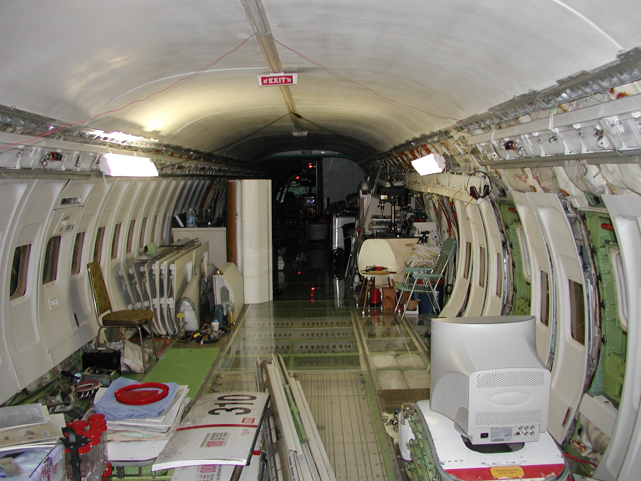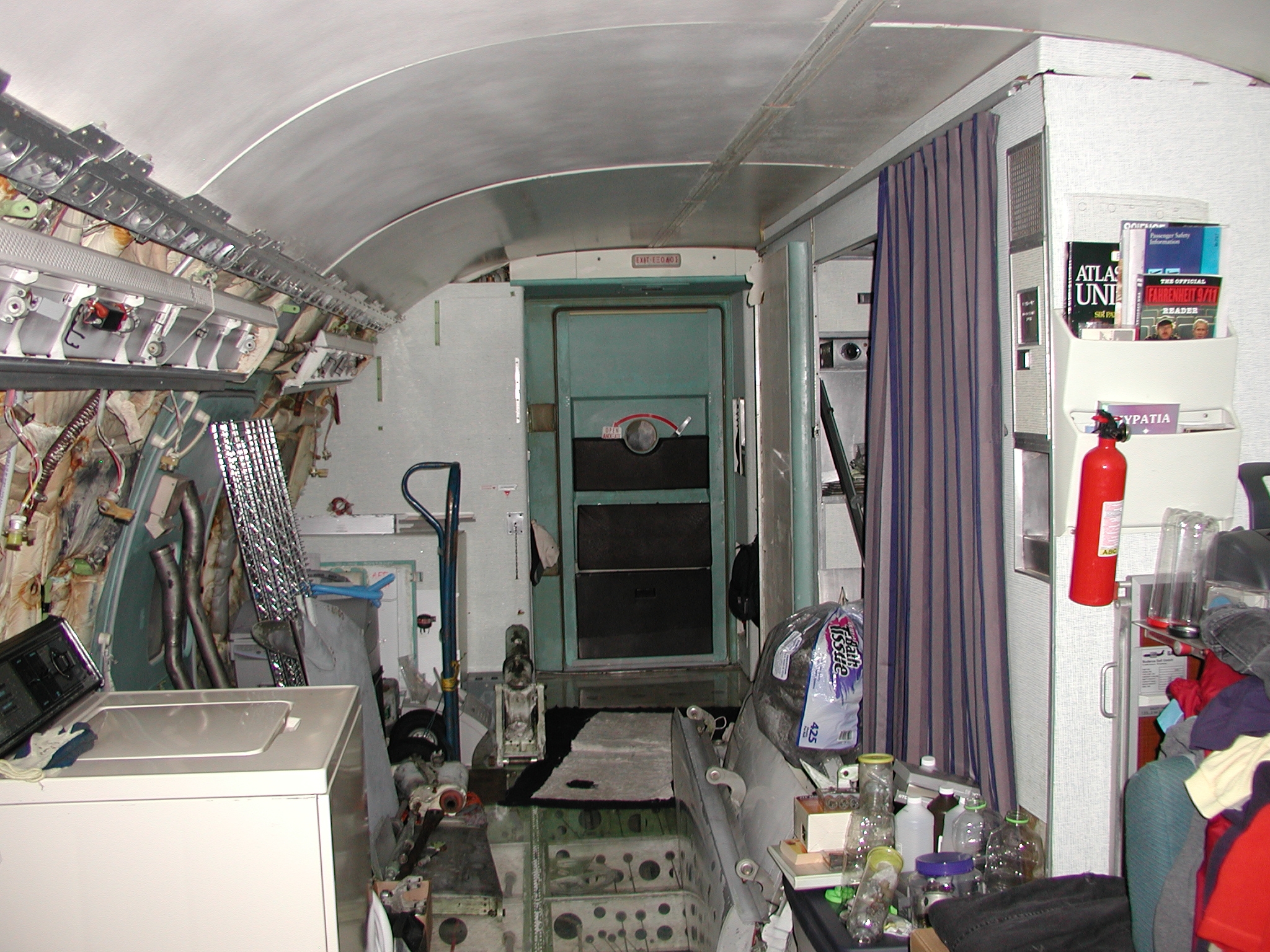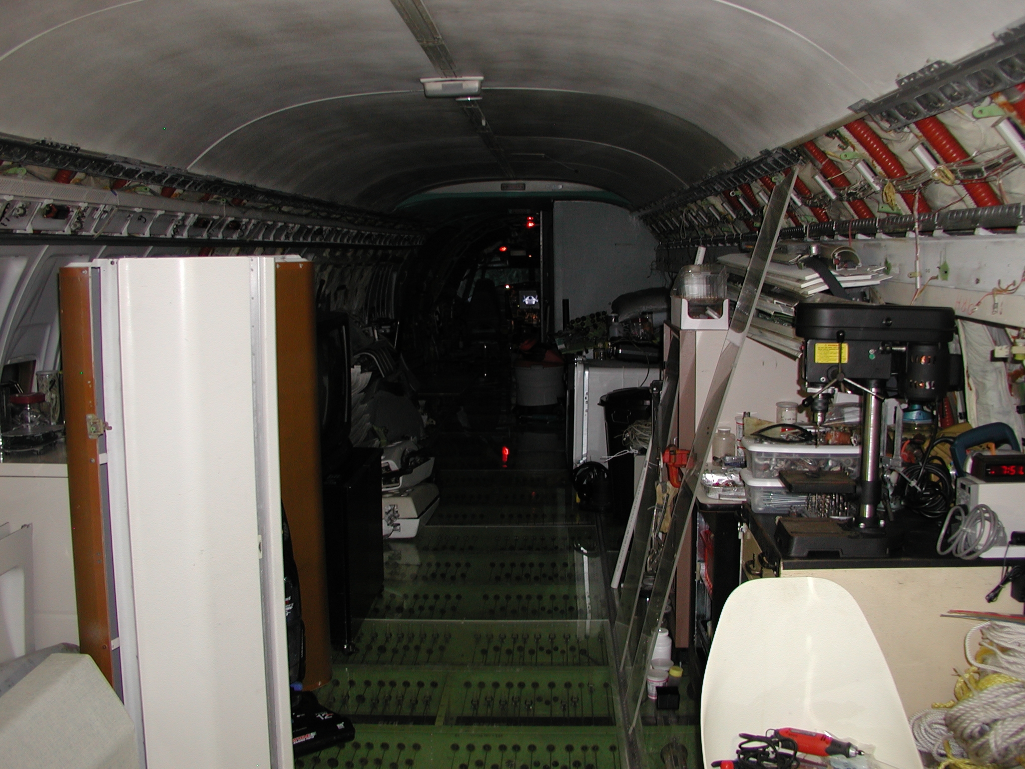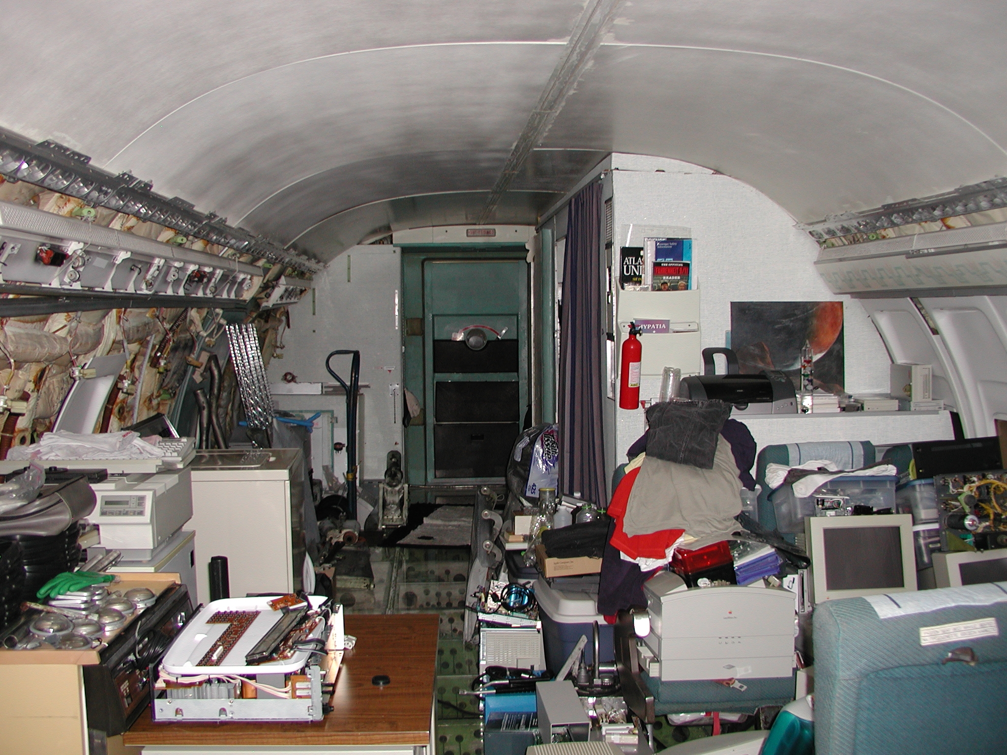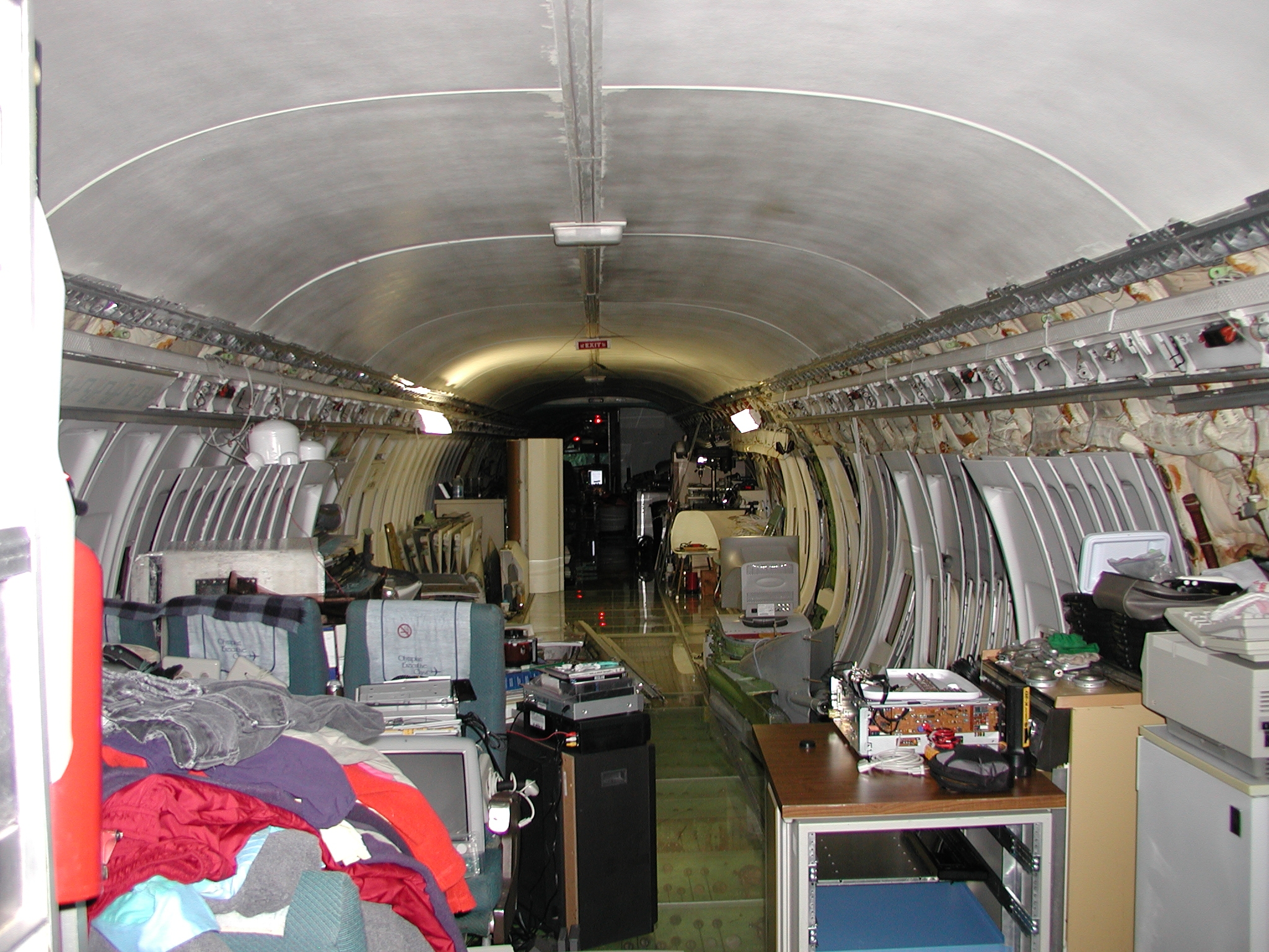 The clutter that overwhelms the cabin is the result of pressure washing the last of the components acquired from the Lake City Florida 727 freighter during December 2004 to January 2005, plus a lot of pressure washed personal domestic possessions that I've moved out of the disgusting old mobile home, before the mice and mold render them unrecoverable even by my substantial pressure washer. This is no small task - I've accumulated more artifacts over the years than I can reasonably manage (yet less than I need it sometimes seems), and any that have been in the mobile home have to be thoroughly cleaned before I'll allow them in the aircraft. For electronics, including TVs, stereos, computers, work related instruments, and similar items, this means disassembling them, pressure washing the individual sections, moving them into the very dry cabin (due to frequent operation of an air dehydrator), then reassembling and testing them once thoroughly dry. It's a lot of work, but it fully restores them to showroom condition (in terms of cleanliness), and thus makes them compatible with the aircraft. Frankly, it's either that or discard them - the mobile home is that badly degraded (it's genuinely disgusting). Most items will simply sit in the aircraft for later use, although some serve to inform or entertain me during work breaks or as background to work. This effort is ongoing - I'm trying to complete as much pressure washing as possible before the weather degrades, and hope to essentially finish it by winter, reducing the mobile home to the barest of basics (and cheapest, since remaining items may be unrecoverable later).