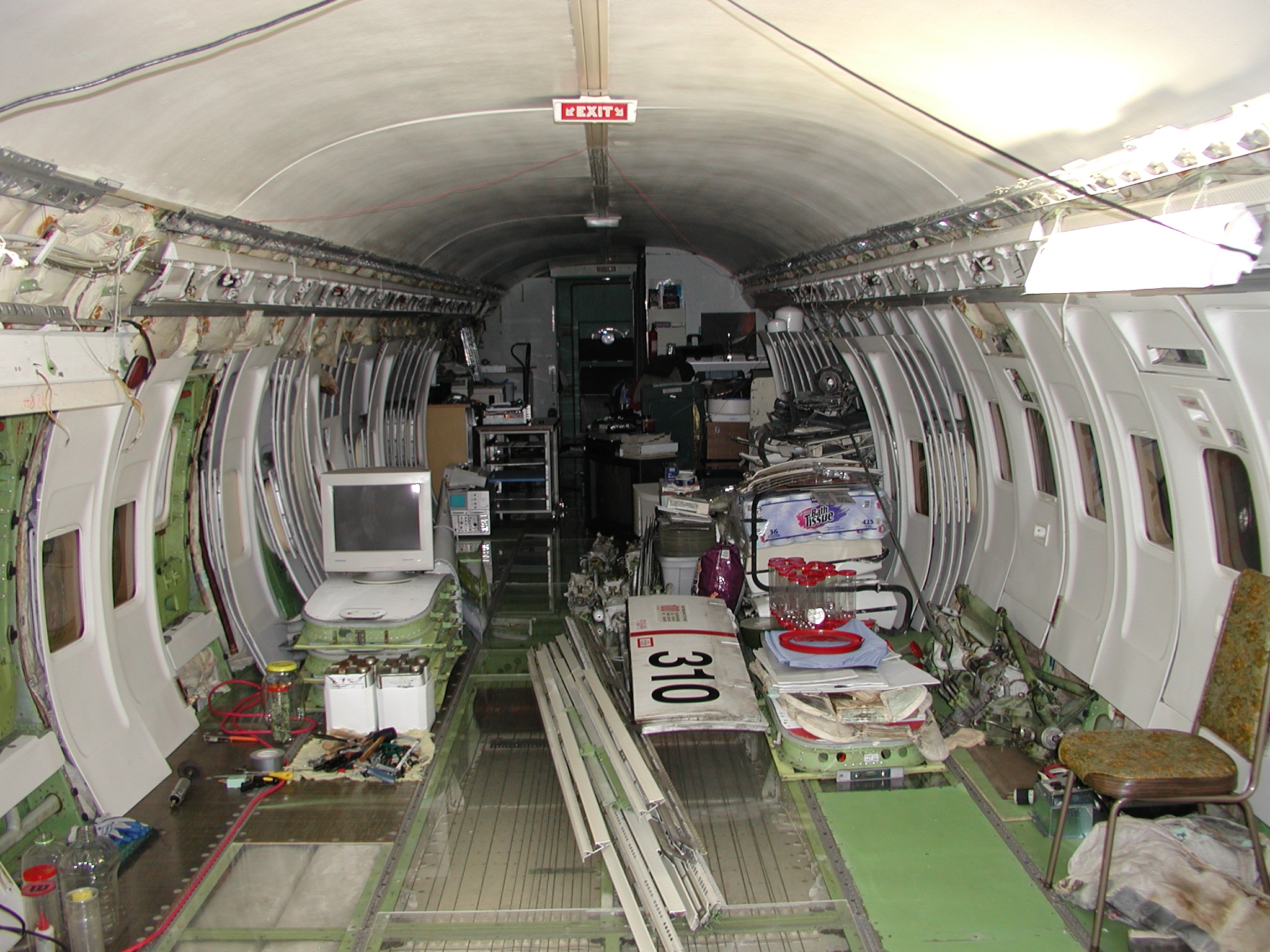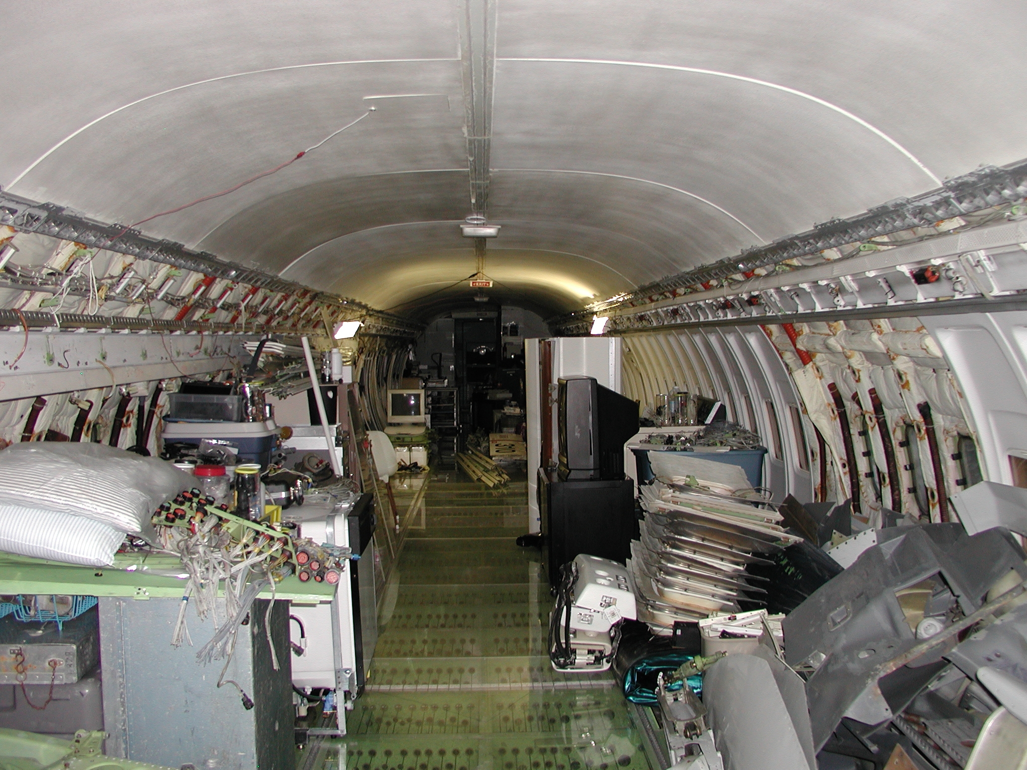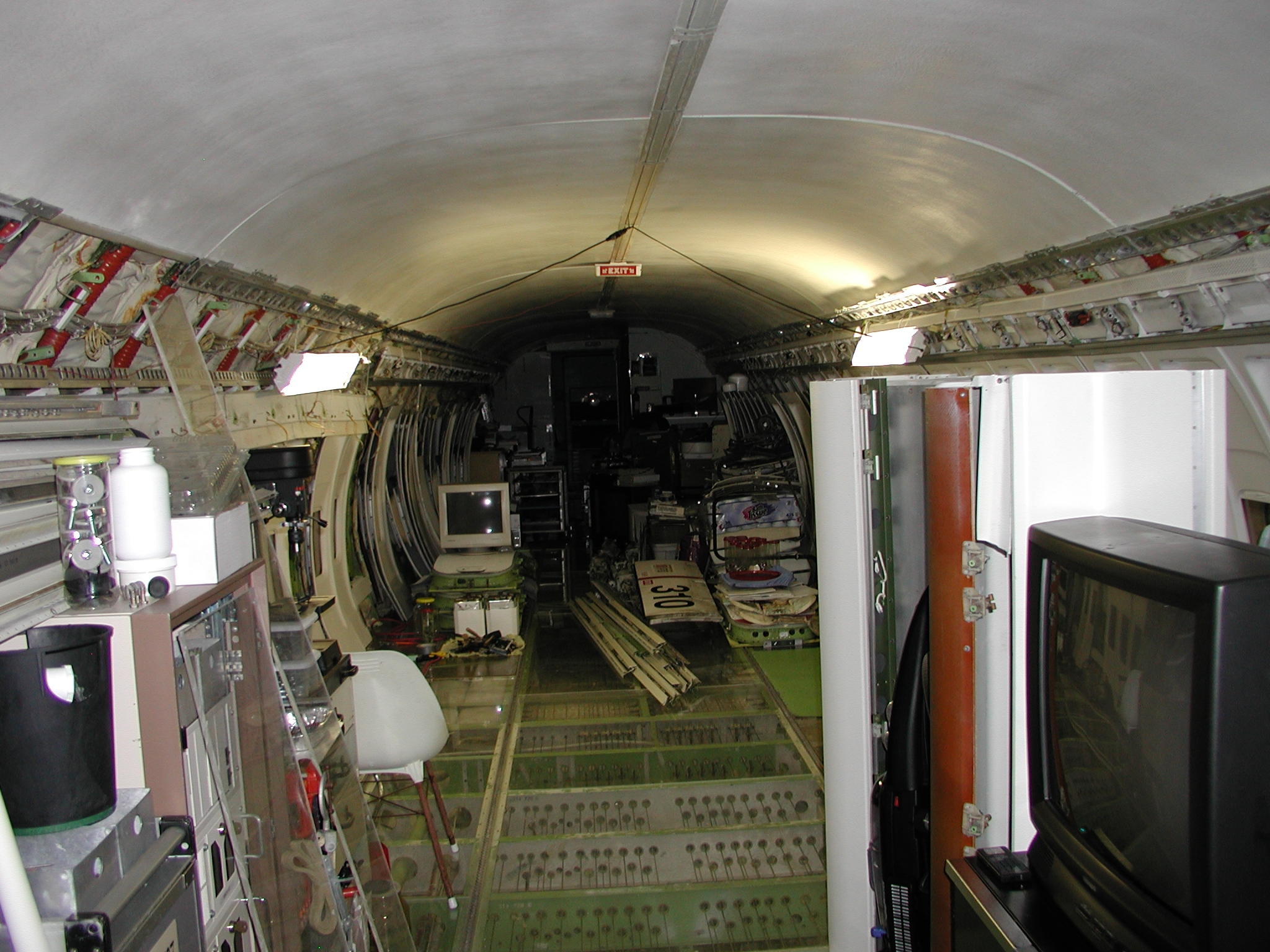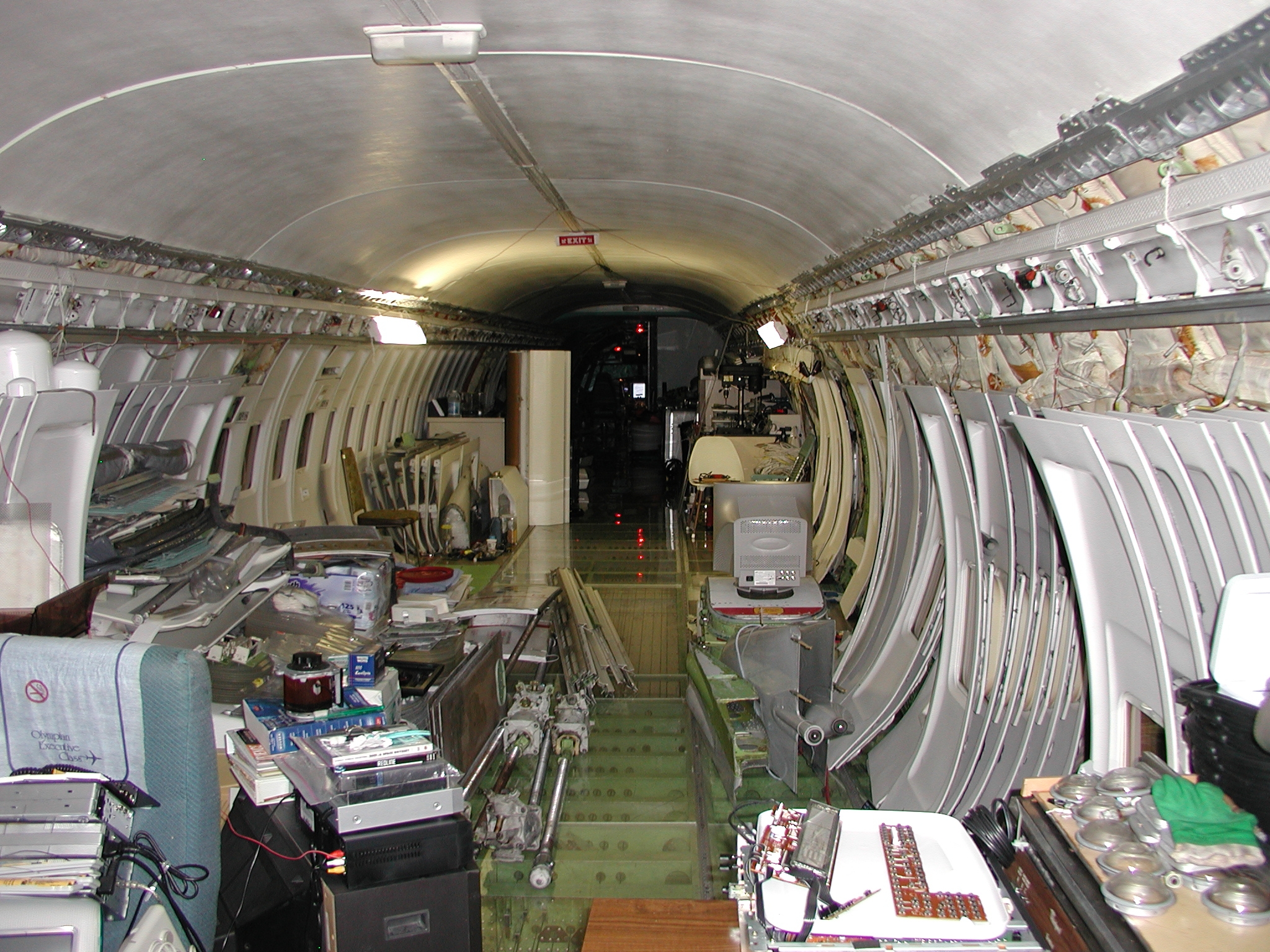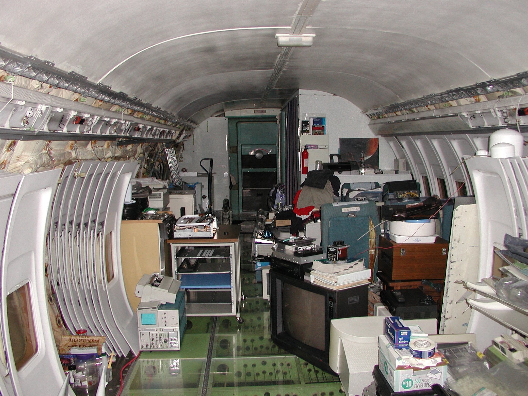 The clutter that overwhelms the cabin is the result of pressure washing the last of the components acquired from the Lake City Florida 727 freighter during December 2004 to January 2005, plus a lot of pressure washed personal domestic possessions that I've moved out of the disgusting old mobile home, before the mice and mold render them unrecoverable even by my substantial pressure washer. This is no small task - I've accumulated more artifacts over the years than I can reasonably manage (yet less than I need it sometimes seems), and any that have been in the mobile home have to be thoroughly cleaned before I'll allow them in the aircraft. For electronics, including TVs, stereos, computers, work related instruments, and similar items, this means disassembling them, pressure washing the individual sections, moving them into the very dry cabin (due to frequent operation of an air dehydrator), then reassembling and testing them once thoroughly dry. It's a lot of work, but it fully restores them to showroom condition (in terms of cleanliness), and thus makes them compatible with the aircraft. Frankly, it's either that or discard them - the mobile home is that badly degraded (it's genuinely disgusting). Most items will simply sit in the aircraft for later use, although some serve to inform or entertain me during work breaks or as background to work. This effort is ongoing - I'm trying to complete as much pressure washing as possible before the weather degrades, and hope to essentially finish it by winter, reducing the mobile home to the barest of basics (and cheapest, since remaining items may be unrecoverable later).