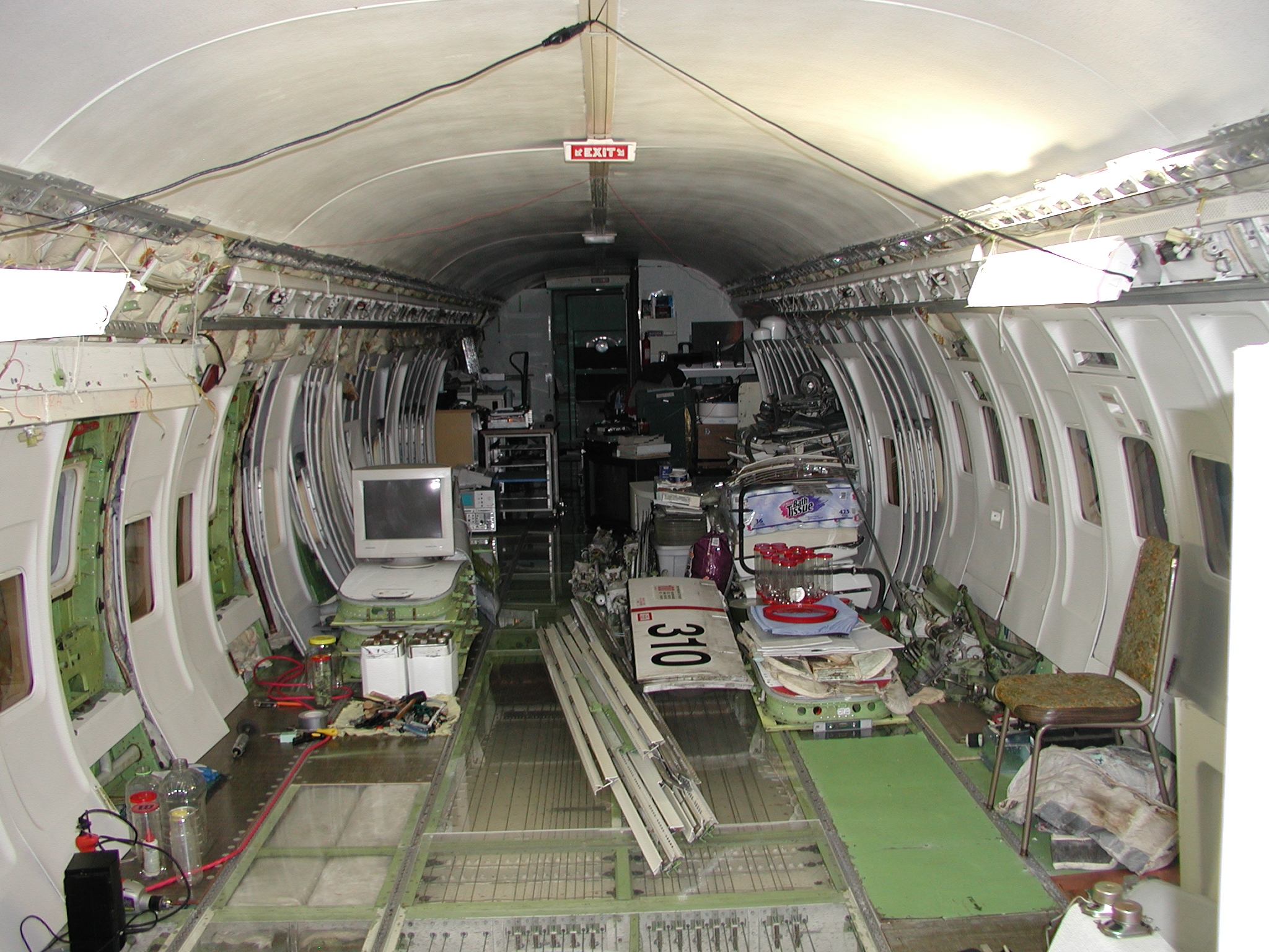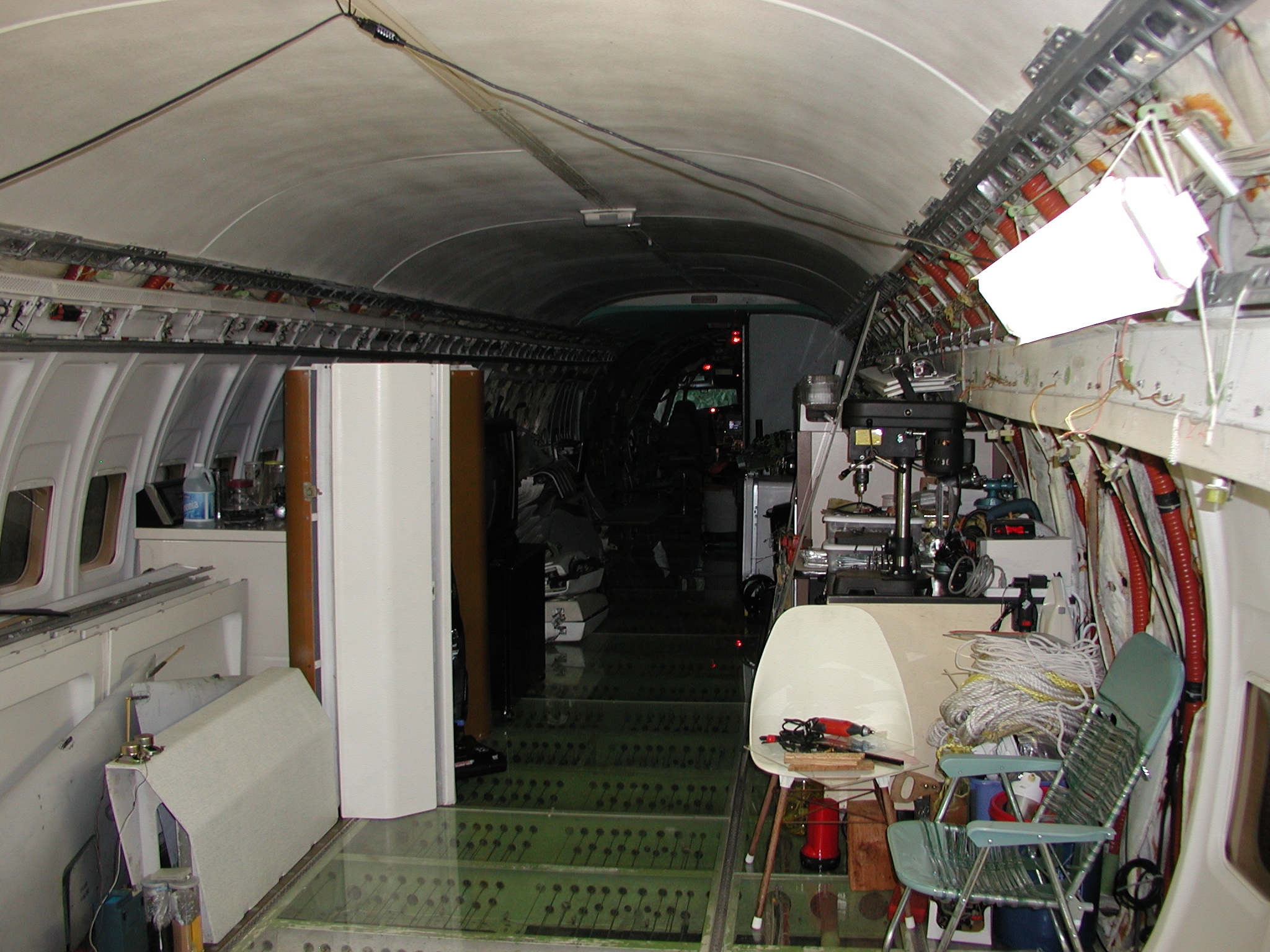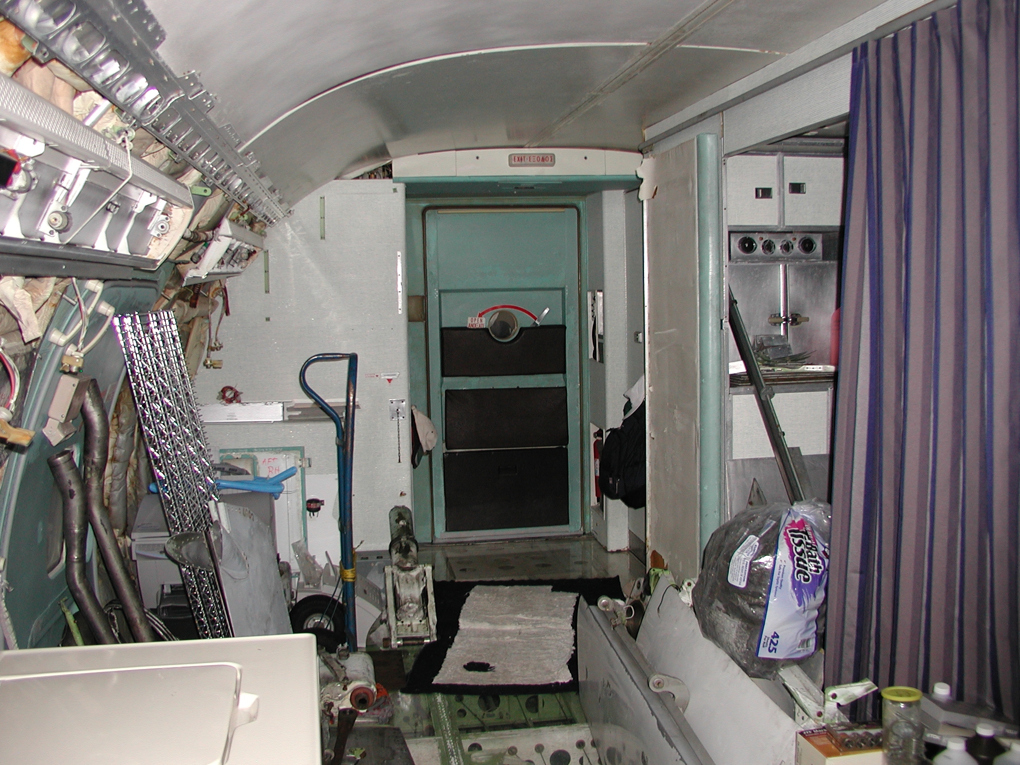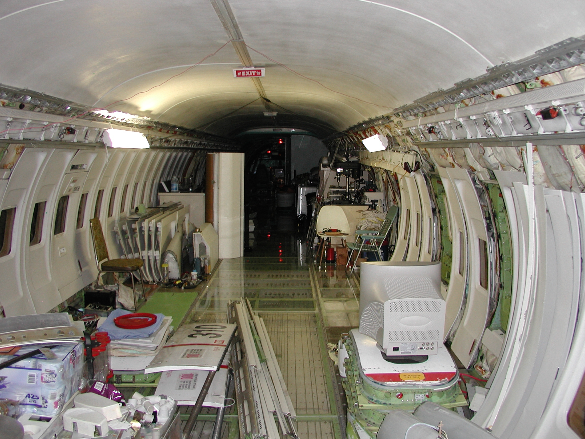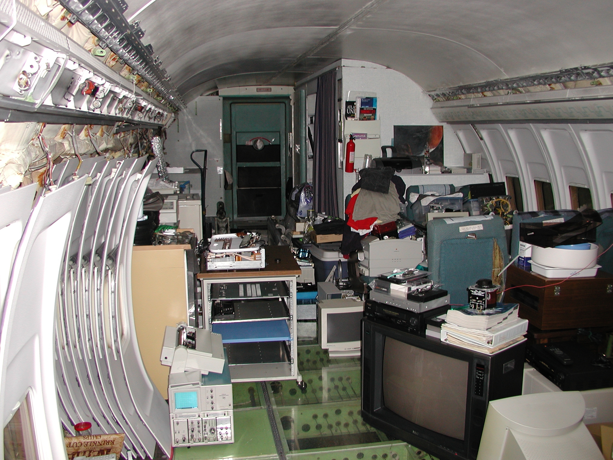 The clutter that overwhelms the cabin is the result of pressure washing the last of the components acquired from the Lake City Florida 727 freighter during December 2004 to January 2005, plus a lot of pressure washed personal domestic possessions that I've moved out of the disgusting old mobile home, before the mice and mold render them unrecoverable even by my substantial pressure washer. This is no small task - I've accumulated more artifacts over the years than I can reasonably manage (yet less than I need it sometimes seems), and any that have been in the mobile home have to be thoroughly cleaned before I'll allow them in the aircraft. For electronics, including TVs, stereos, computers, work related instruments, and similar items, this means disassembling them, pressure washing the individual sections, moving them into the very dry cabin (due to frequent operation of an air dehydrator), then reassembling and testing them once thoroughly dry. It's a lot of work, but it fully restores them to showroom condition (in terms of cleanliness), and thus makes them compatible with the aircraft. Frankly, it's either that or discard them - the mobile home is that badly degraded (it's genuinely disgusting). Most items will simply sit in the aircraft for later use, although some serve to inform or entertain me during work breaks or as background to work. This effort is ongoing - I'm trying to complete as much pressure washing as possible before the weather degrades, and hope to essentially finish it by winter, reducing the mobile home to the barest of basics (and cheapest, since remaining items may be unrecoverable later).