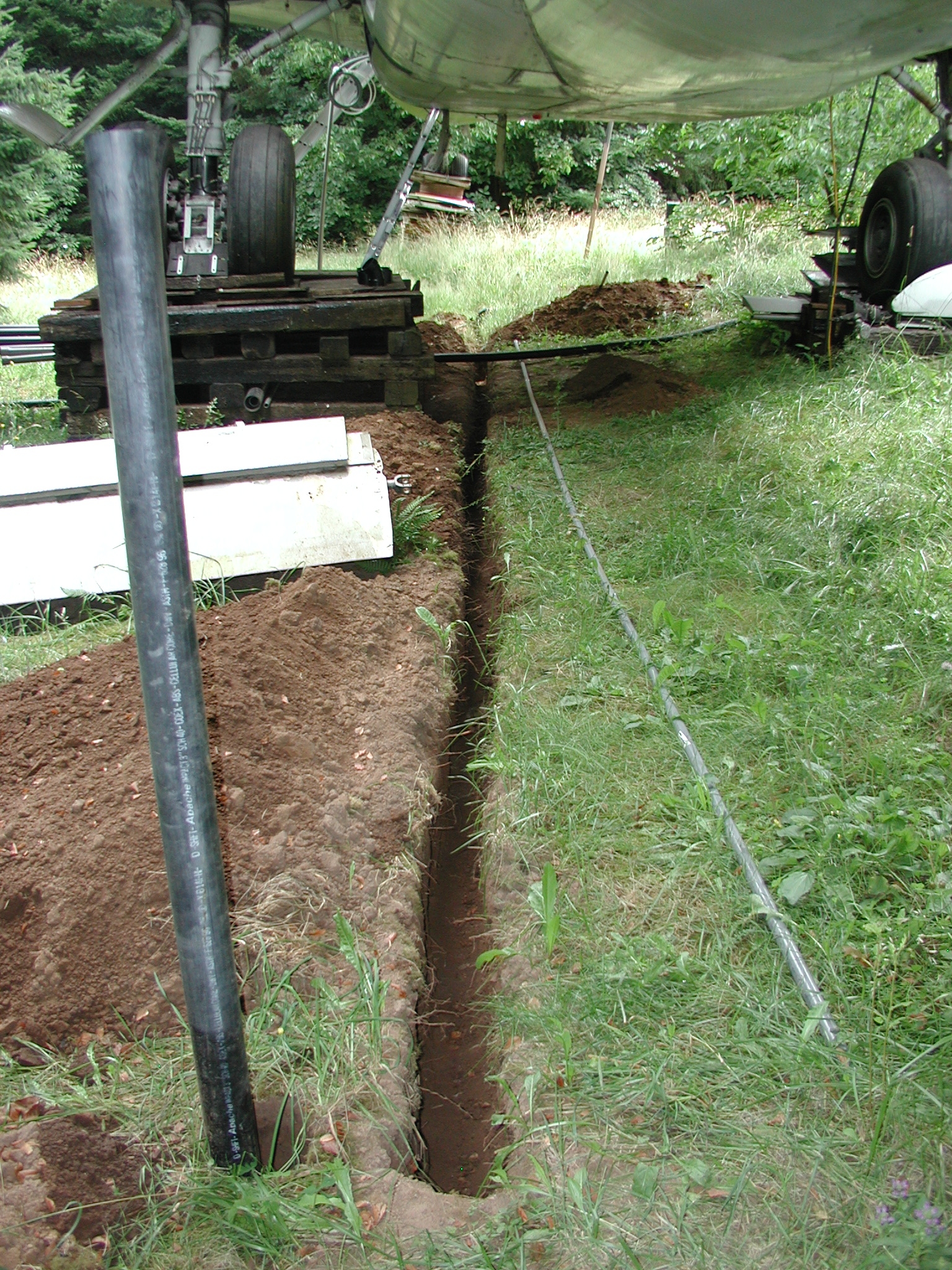 But there are limits to what I can legally do now. I don't have the funds to build the three landing gear support pillars, and won't for very roughly 18 months. That's an enormous frustration. And it's a big risk since the aircraft would not remain on the current railroad tie and foam panel platforms during an earthquake. But I can't spend money I don't have - patience is necessary. And since I can't build the pillars yet, in practical terms there's no point in applying for a building permit, which would just stagnate until the pillars (in provincial building terms the foundation) can be constructed. And thus other infrastructure work can go only so far - I can plan and experiment, but of course I can't fill trenches or finalize most items. But I did finalize the water system connection (I hope I don't get busted). And I plan to add the permanent telecom and TV antenna connections soon. I dug a trench for the sewer line for the aft lavs, by hand as usual. And I purchased enough 4" sewer pipe to make the connection to the septic tank, which is just to the right side of the nose. It's yet another trench which will remain open for years...