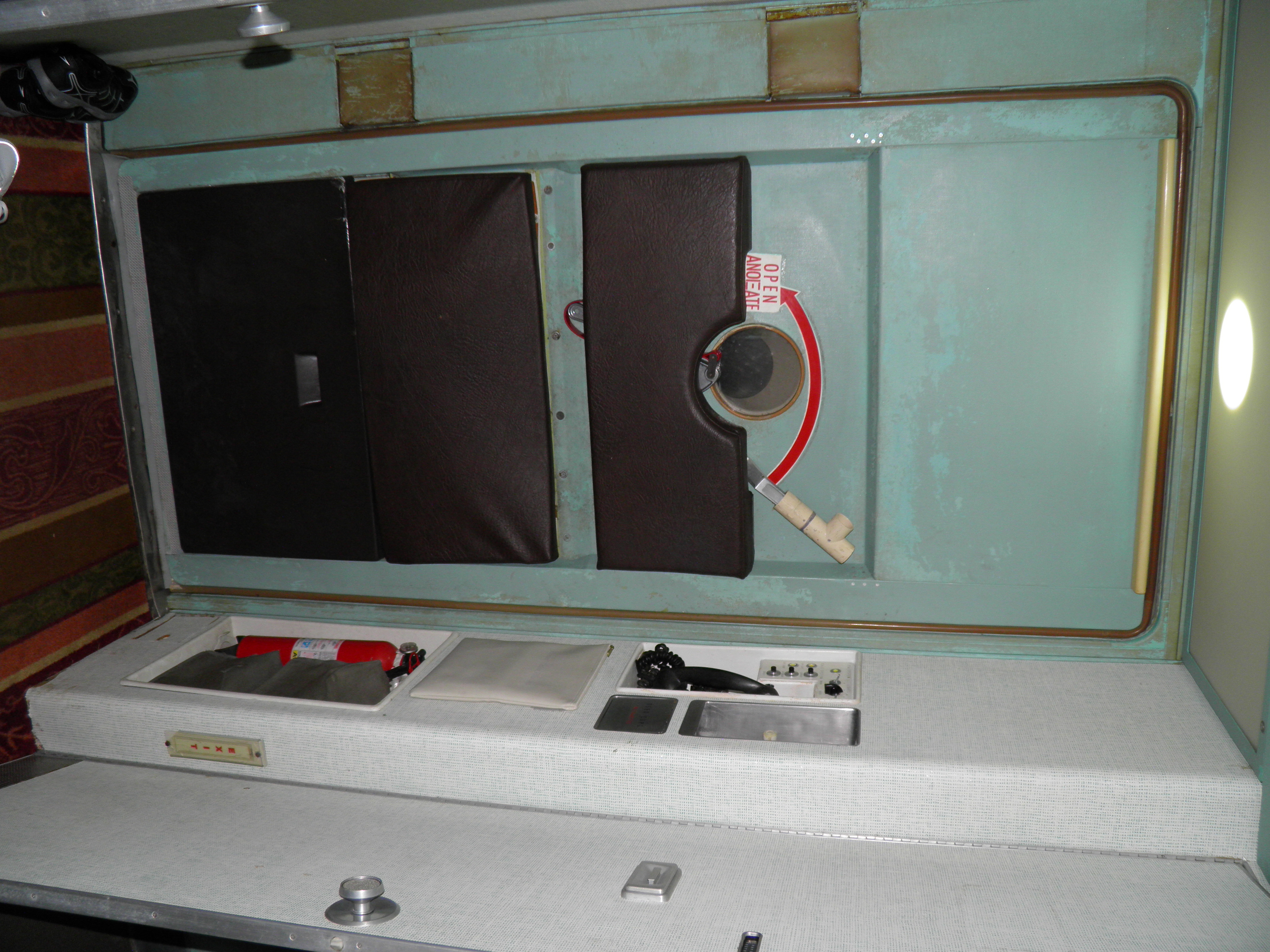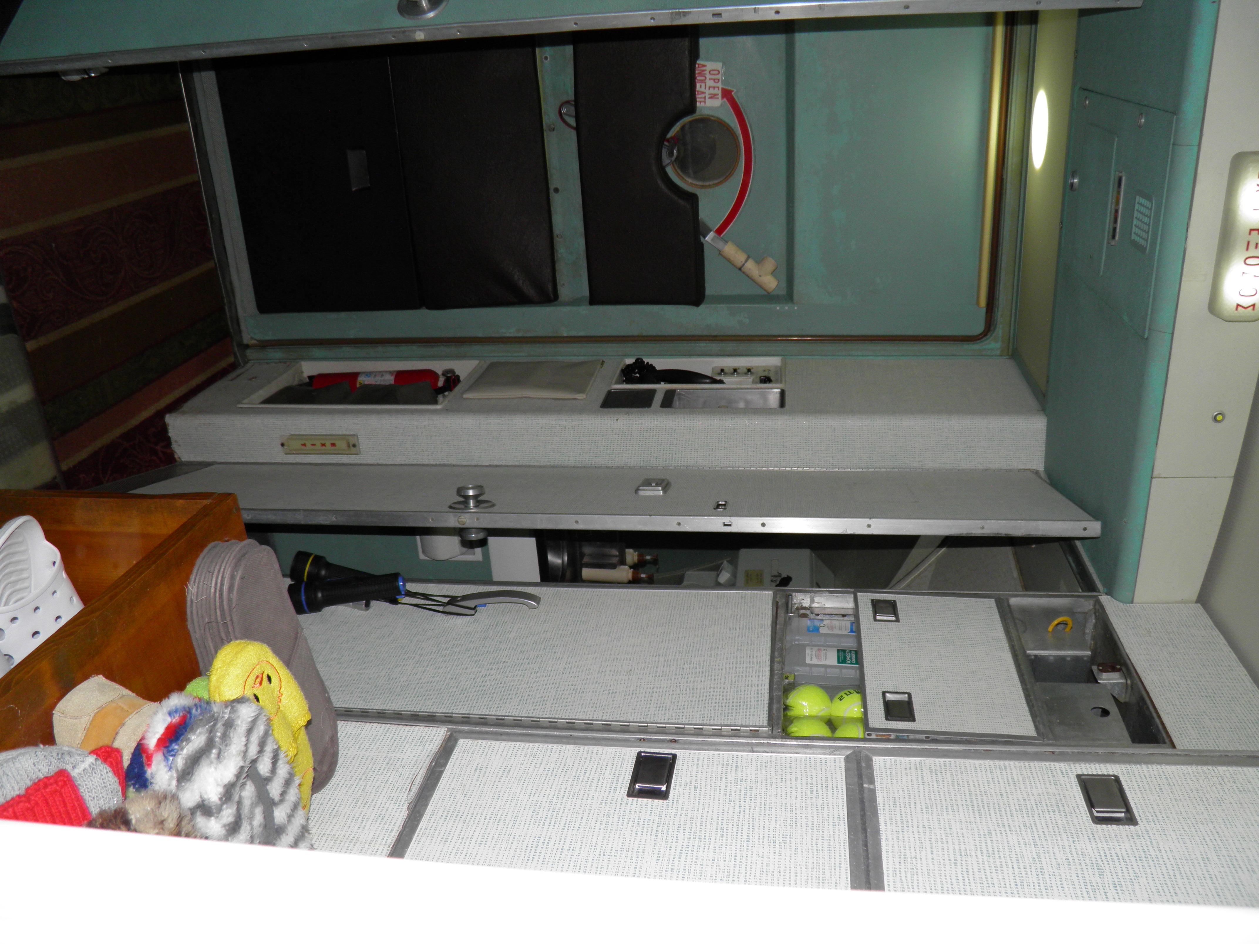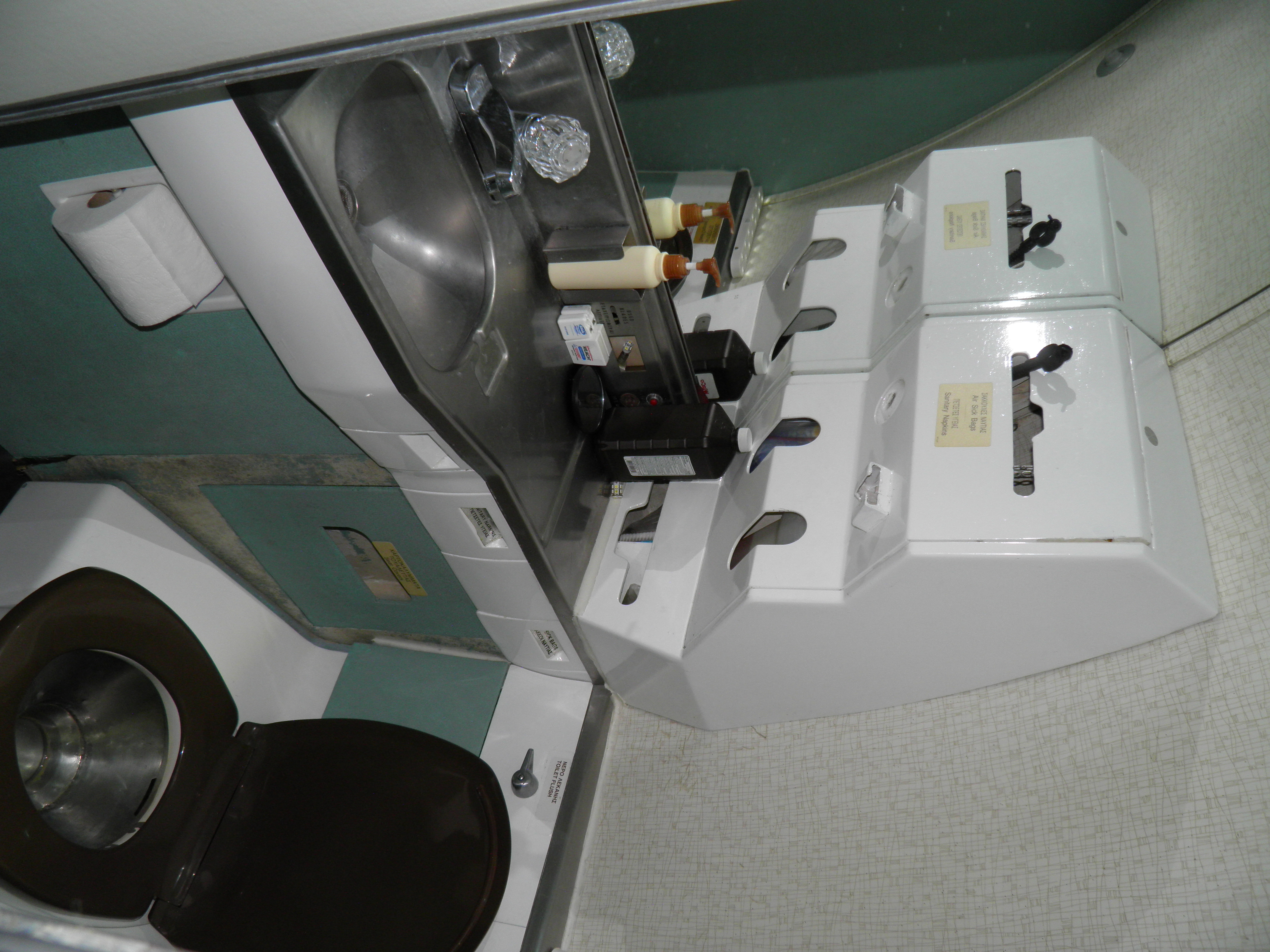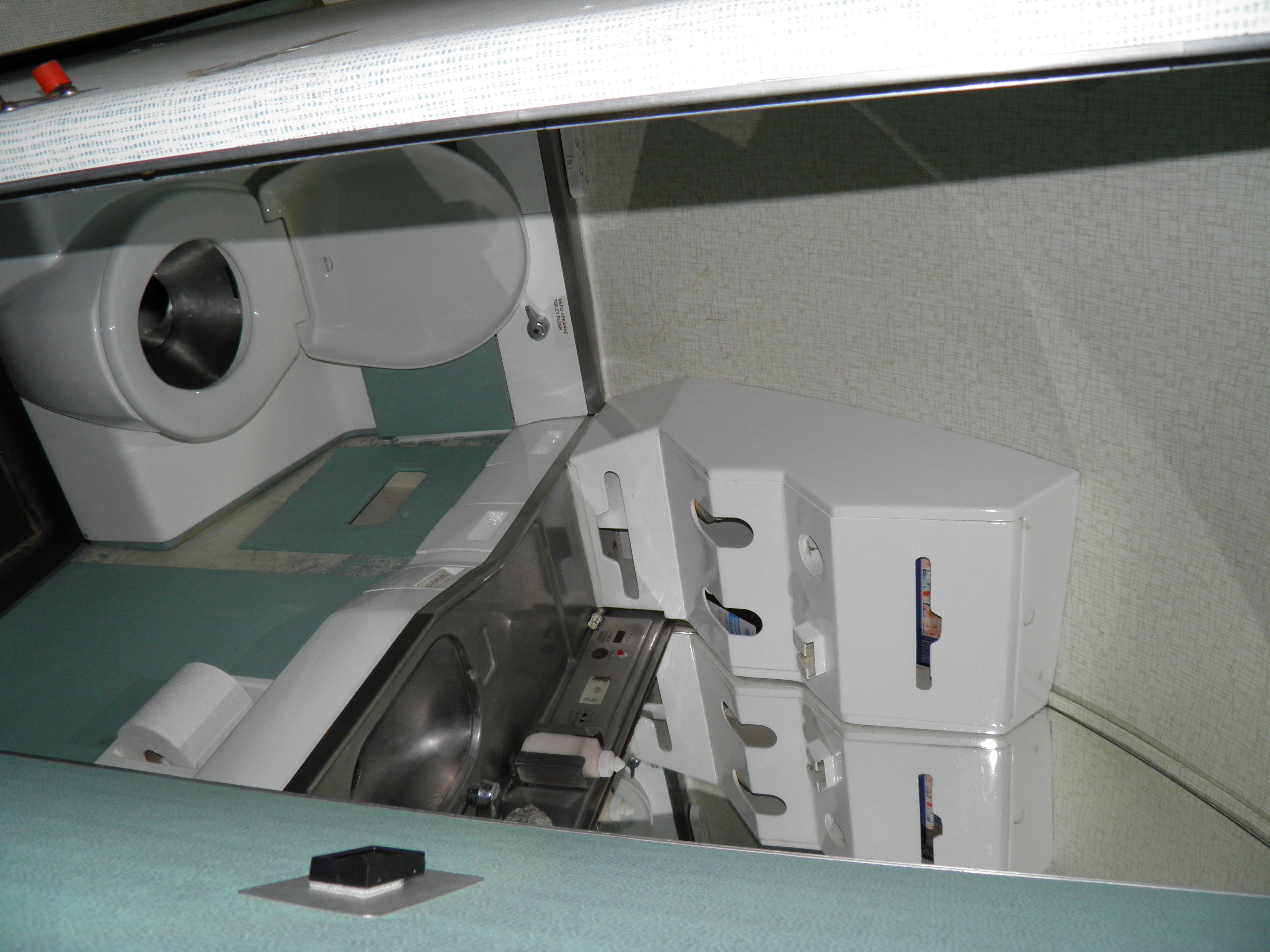Both aft lavatory toilets are now fully functional, but hot water still needs to be connected to the wash basins (cold is connected), a light fixture in the right aft lavatory repaired, and the mirror light fixtures in both aft lavatories need to be converted from florescent to LED based illumination. Some wall or door panel structures and their color treatment need to be repaired or refined as well.