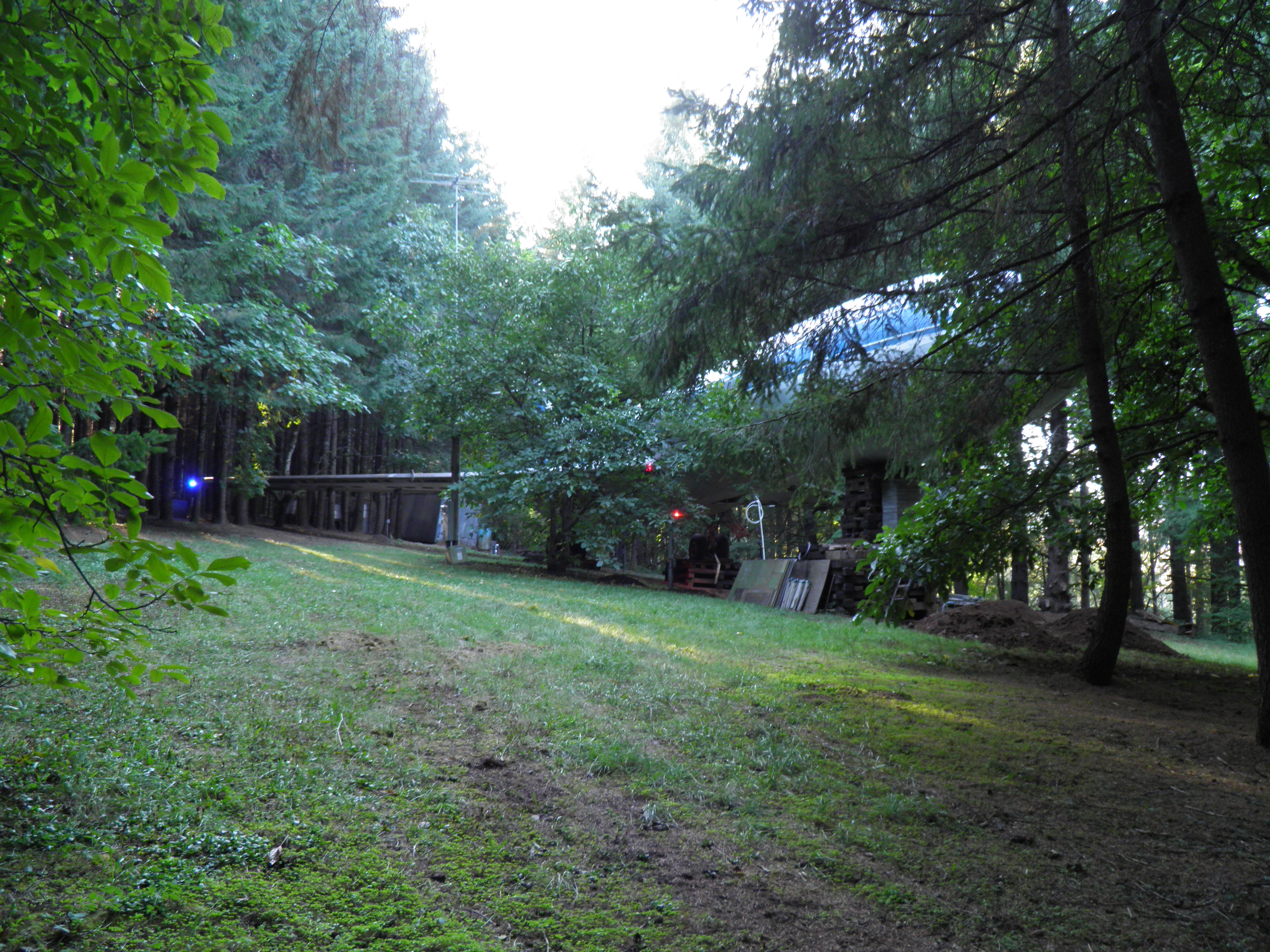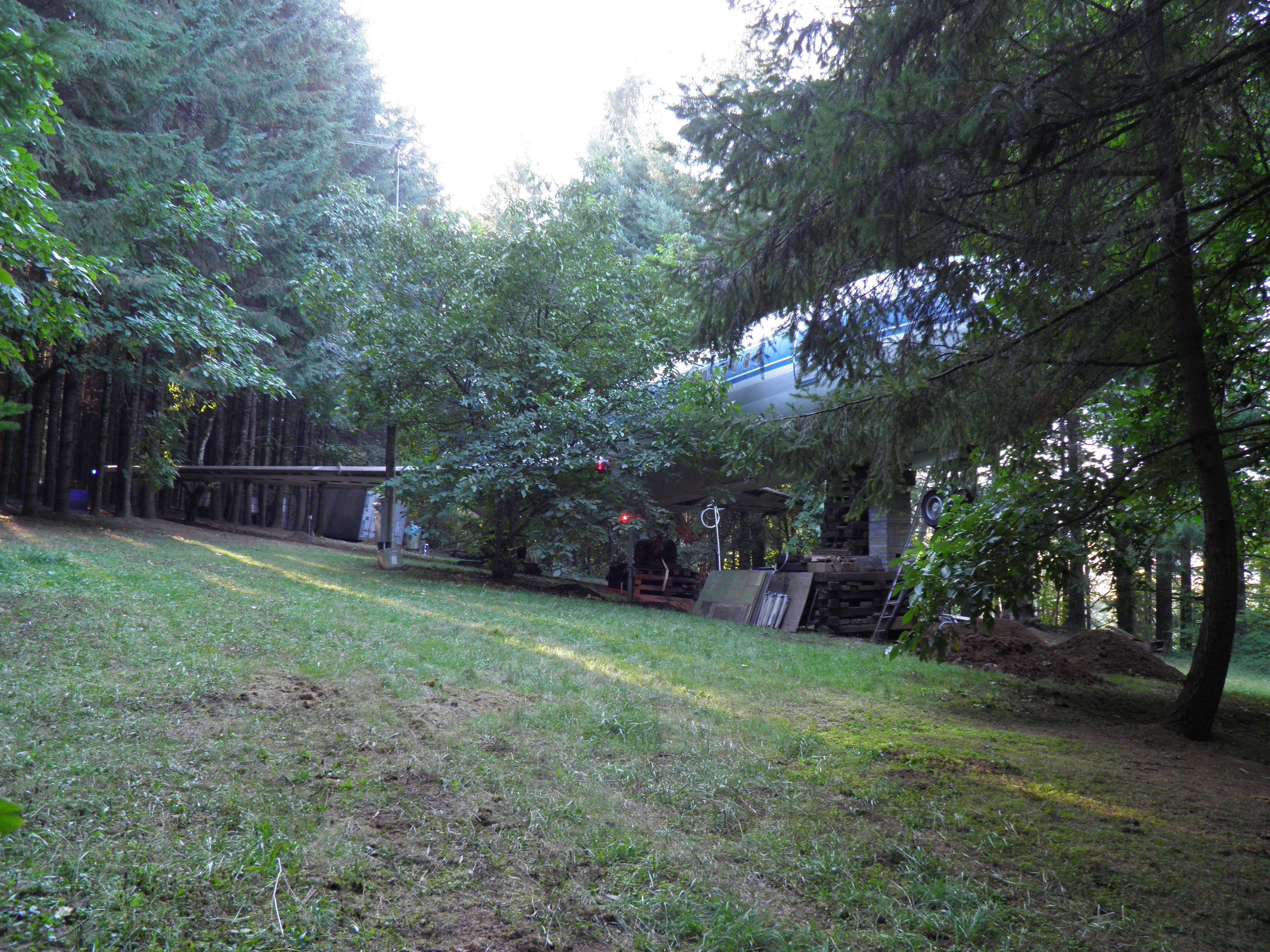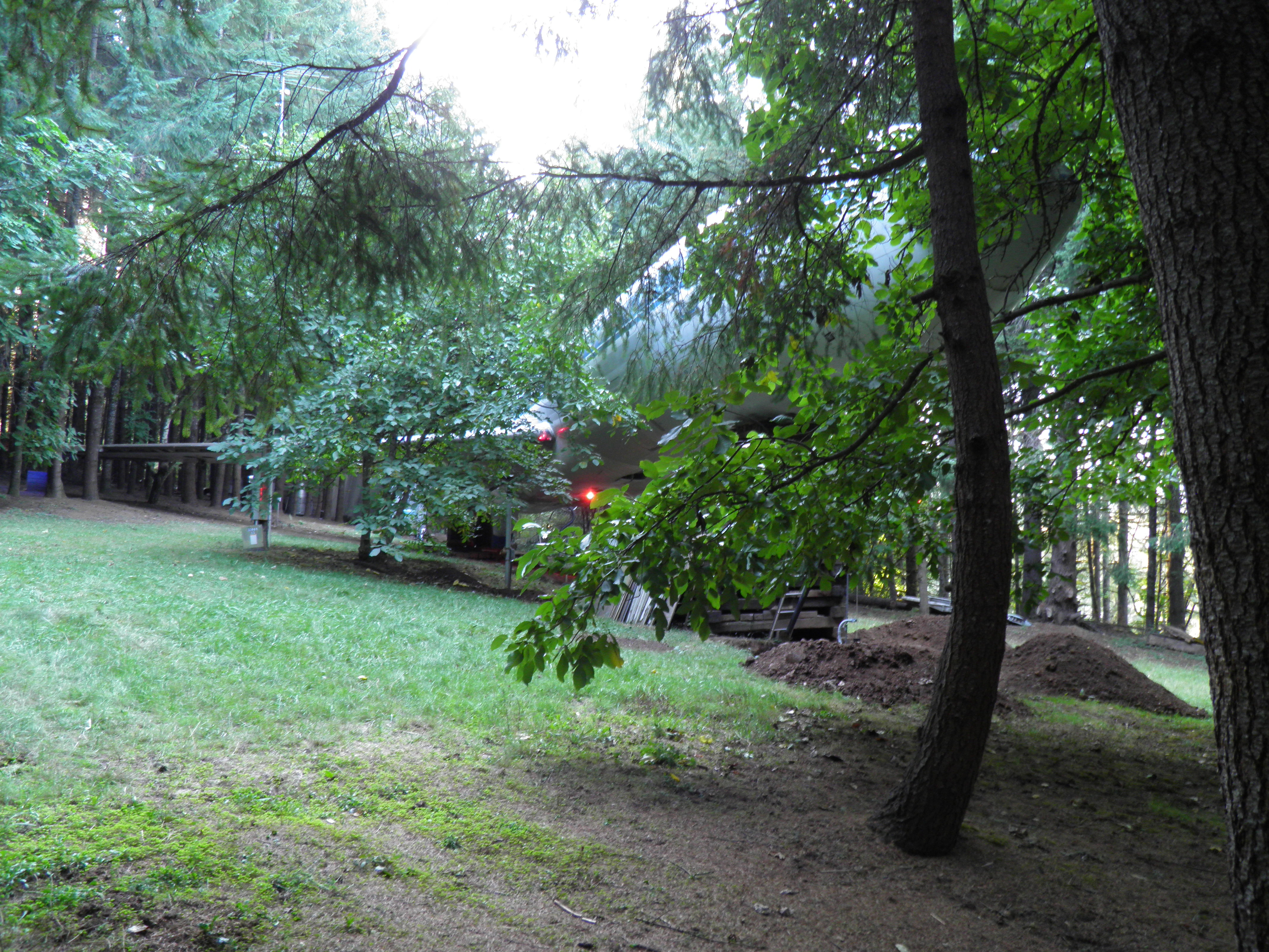 Most though not quite all of the pressure washing is complete but the front landing gear support structure remains incomplete (no rebar has been fabricated and no concrete poured, a disappointment), and my west storage van, though now thoroughly clean, was moved only a modest portion of the distance to its final destination. But all the ugly material in my forest south of my right wing was fully relocated and my wind generator is substantially (though not completely) installed (currently it's temporarily connected only to my right outboard landing light).