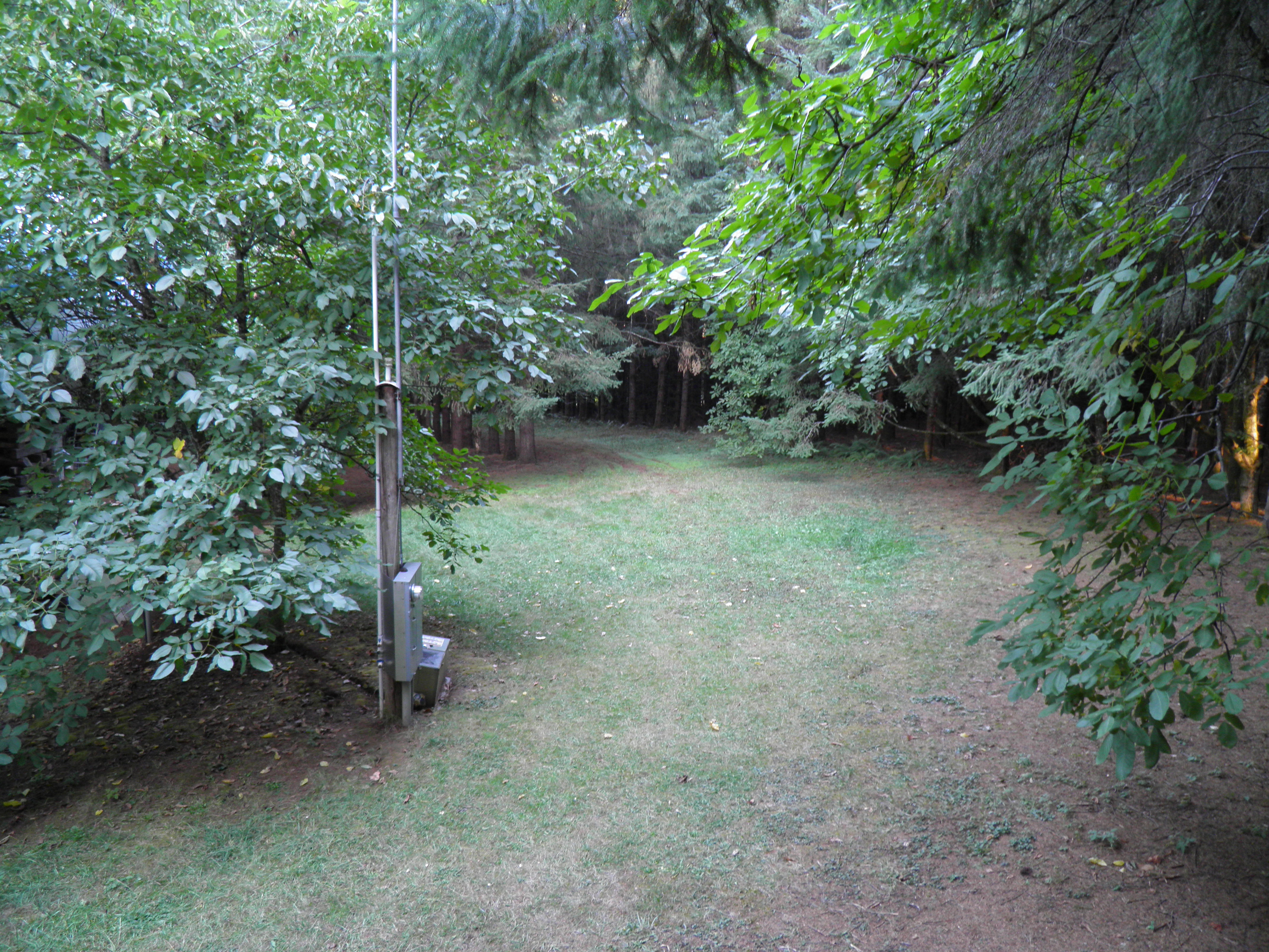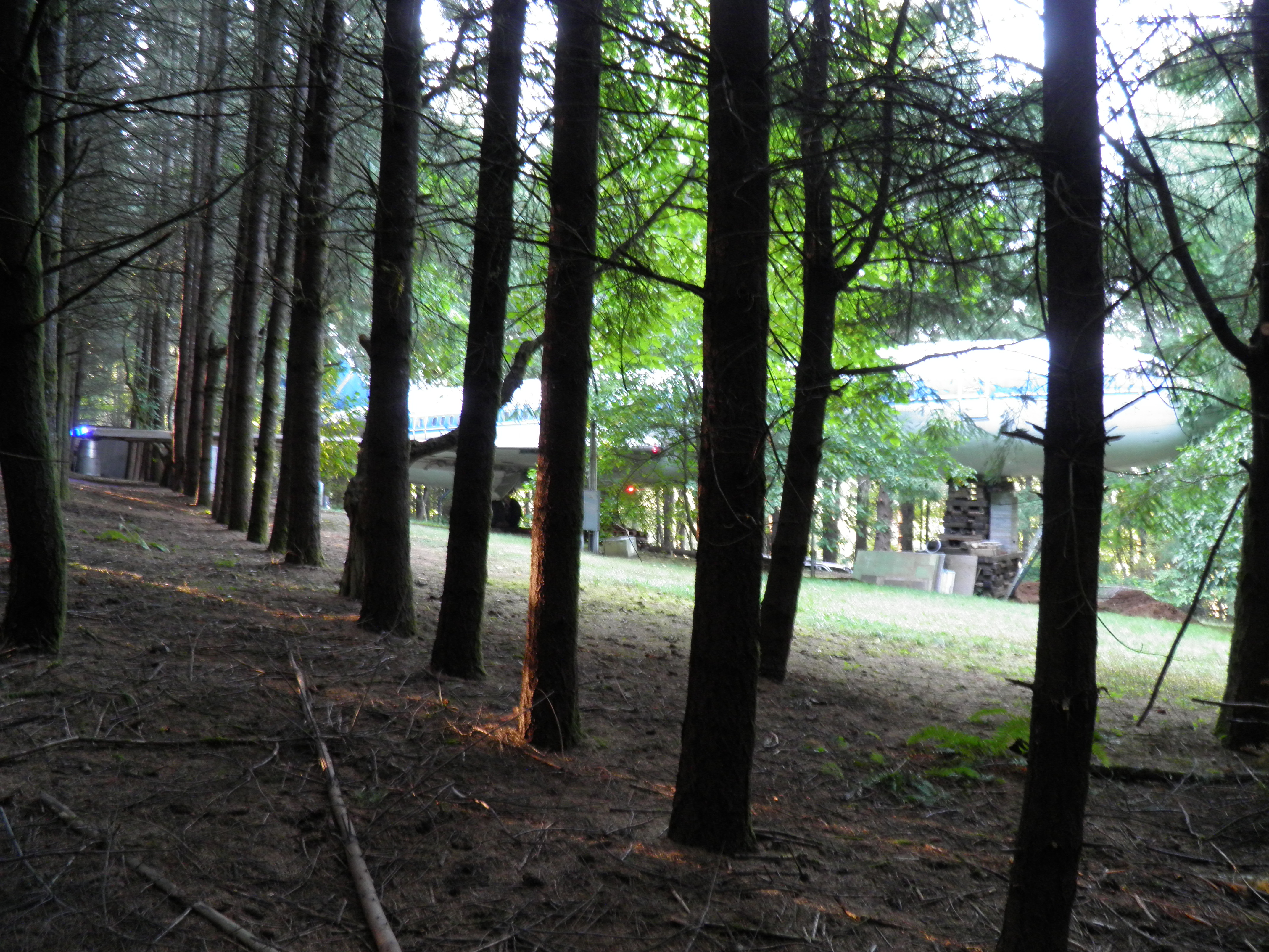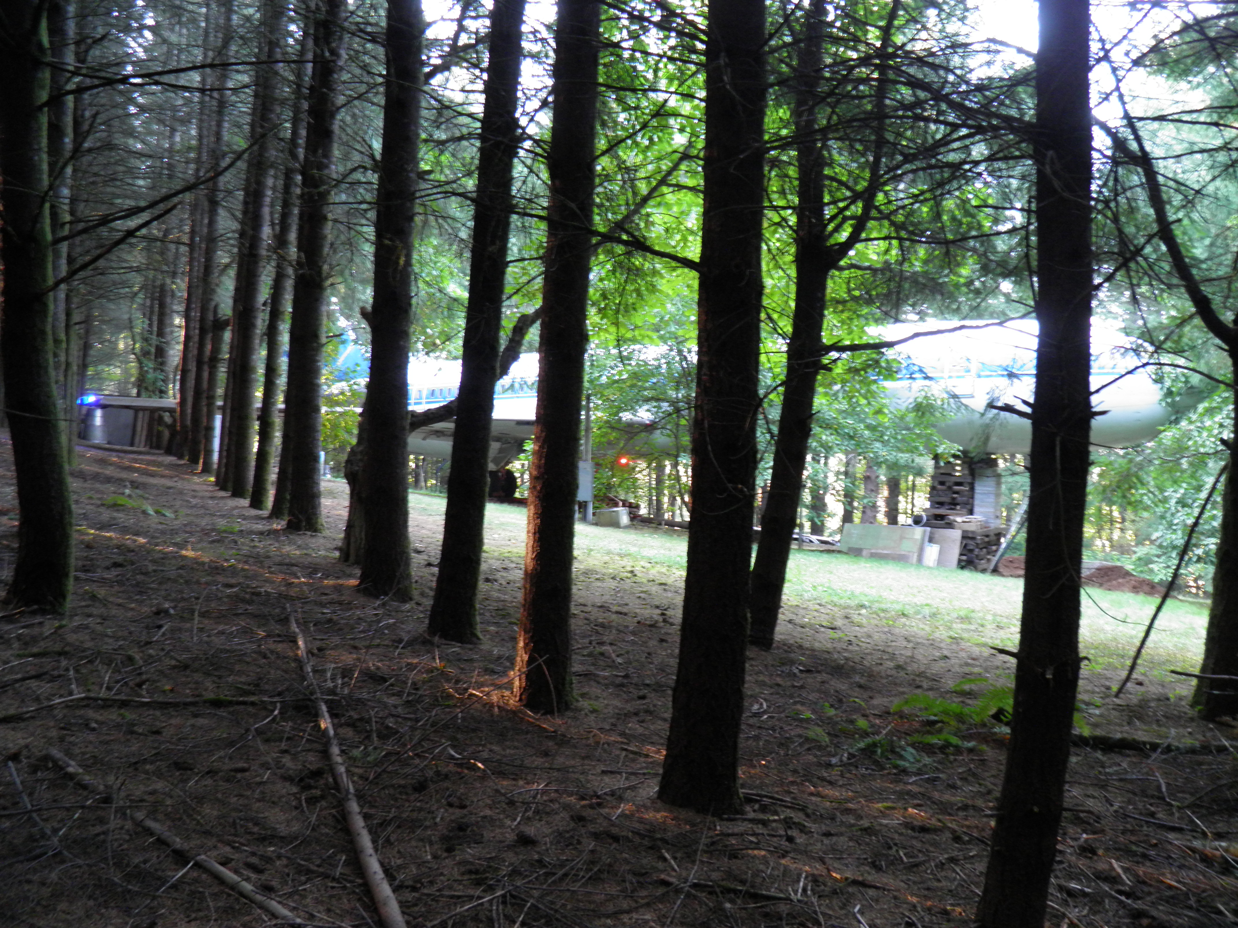 Most though not quite all of the pressure washing is complete but the front landing gear support structure remains incomplete (no rebar has been fabricated and no concrete poured, a disappointment), and my west storage van, though now thoroughly clean, was moved only a modest portion of the distance to its final destination. But all the ugly material in my forest south of my right wing was fully relocated and my wind generator is substantially (though not completely) installed (currently it's temporarily connected only to my right outboard landing light).