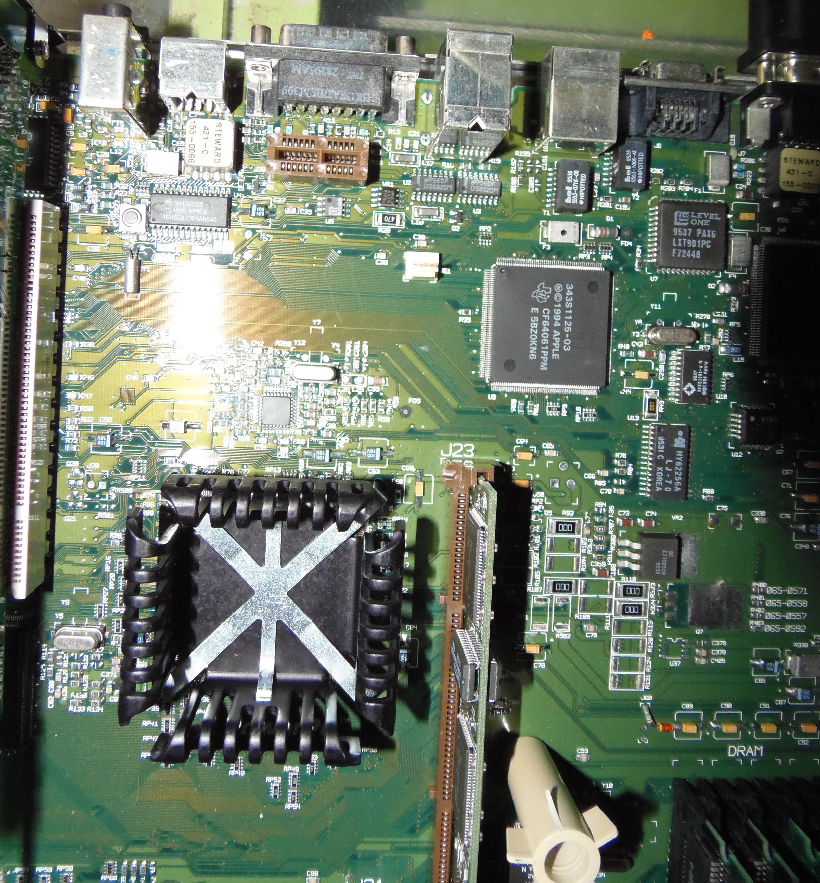 The Power Macintosh 7200/90 contains an internal 22 pin edge card connector on the main logic board just two or three centimeters forward of the external display port. It's normally empty. (Click the images for a full size rendition.)