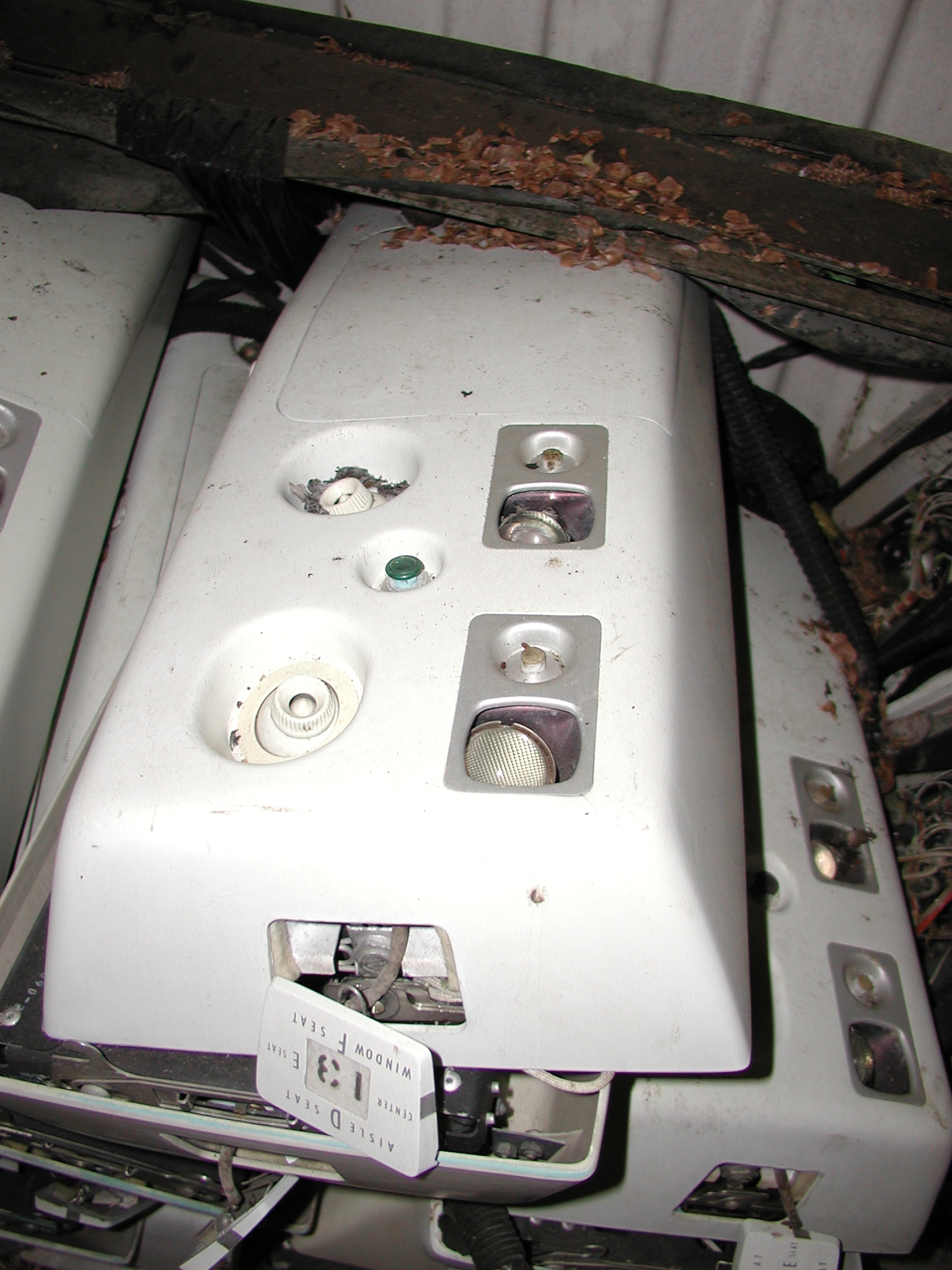 PSUs: A PSU is shown in image 9, one of many stacked as partially shown. These are the older style associated with hat racks rather than carry on baggage bins. The usual four oxygen masks are stored within, and drop out when the oxygen line is pressurized (the air pressure required to unlatch the mask compartment door is modest). They also have the usual reading lights, gasper valves, attendant button and light, and seat belt & no smoking lights. All have been pressure washed since the image above was captured, and are now stowed in stacks in my aft freight hold.